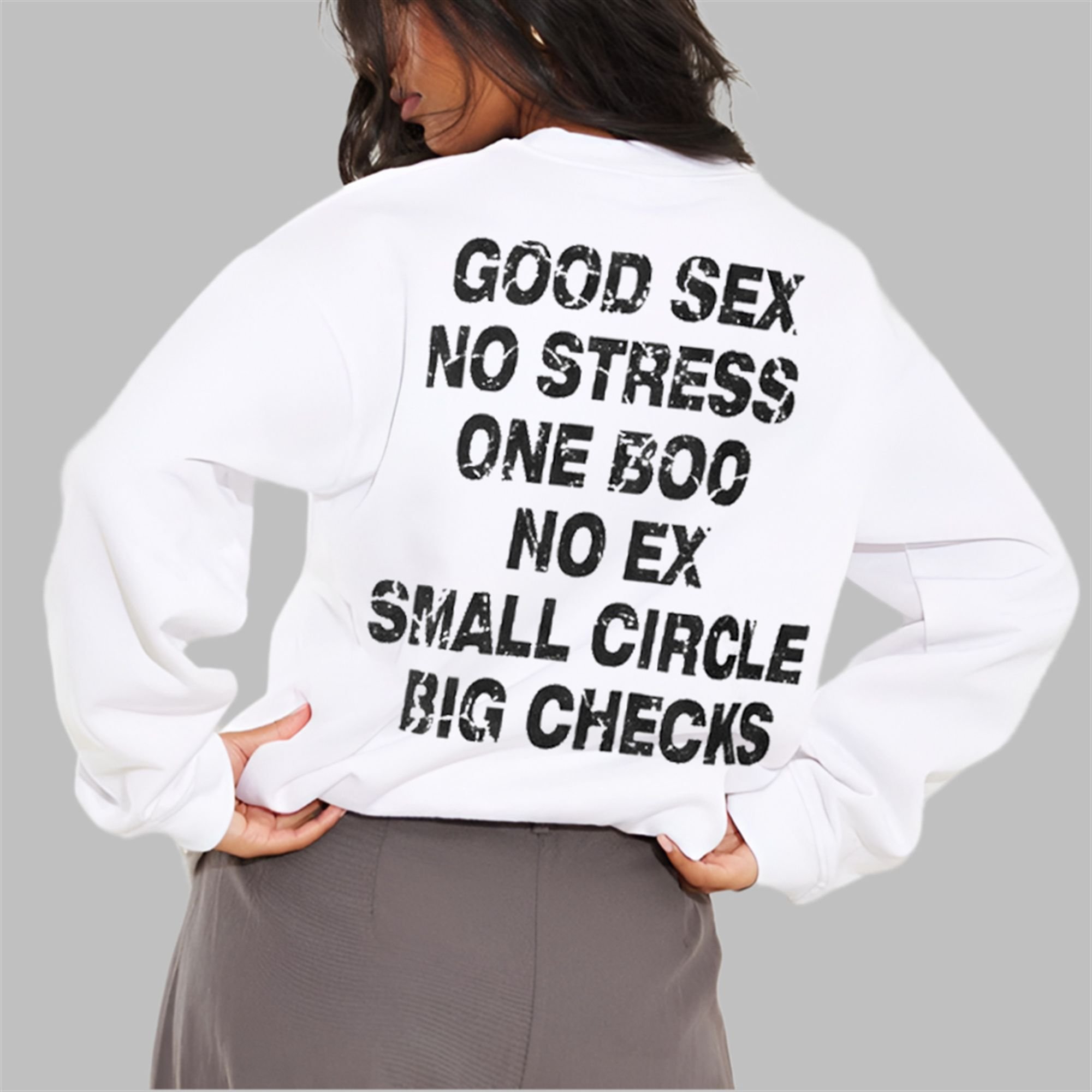 Step out and let your shirt do the talking. The Manifesto Tee isn’t just a piece of clothing; it’s a bold declaration of your life’s operating principles. Featuring the unapologetic motto “GOOD SEX NO STRESS ONE BOO NO EX SMALL CIRCLE BIG CHECKS” in a powerful, distressed font, this shirt is designed for those who live with intention and confidence.This tee offers a relaxed, slightly oversized fit that drapes perfectly, making it a staple piece for any modern streetwear enthusiast. The stark black text against the clean white fabric creates a visually arresting contrast that guarantees you’ll stand out in any crowd.