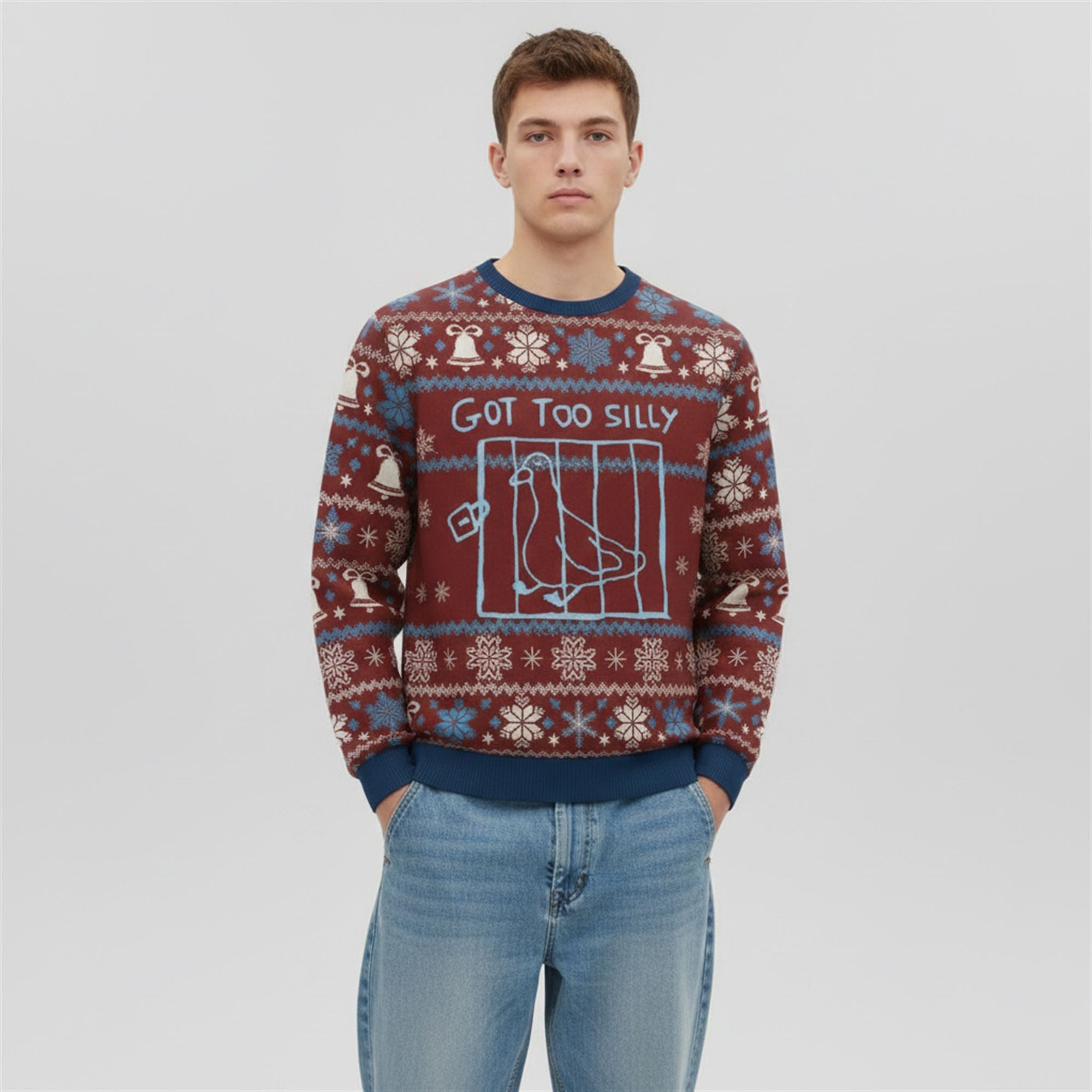 The sweater is the perfect fusion of comfort, tradition, and absurdist humor. Designed for the 2025 holiday season, this sweater features a rich, deep burgundy background reminiscent of classic winter apparel. The design is framed by intricate, light blue and white Fair Isle patterns, boasting rows of festive snowflakes, geometric zig-zags, and ringing holiday bells.