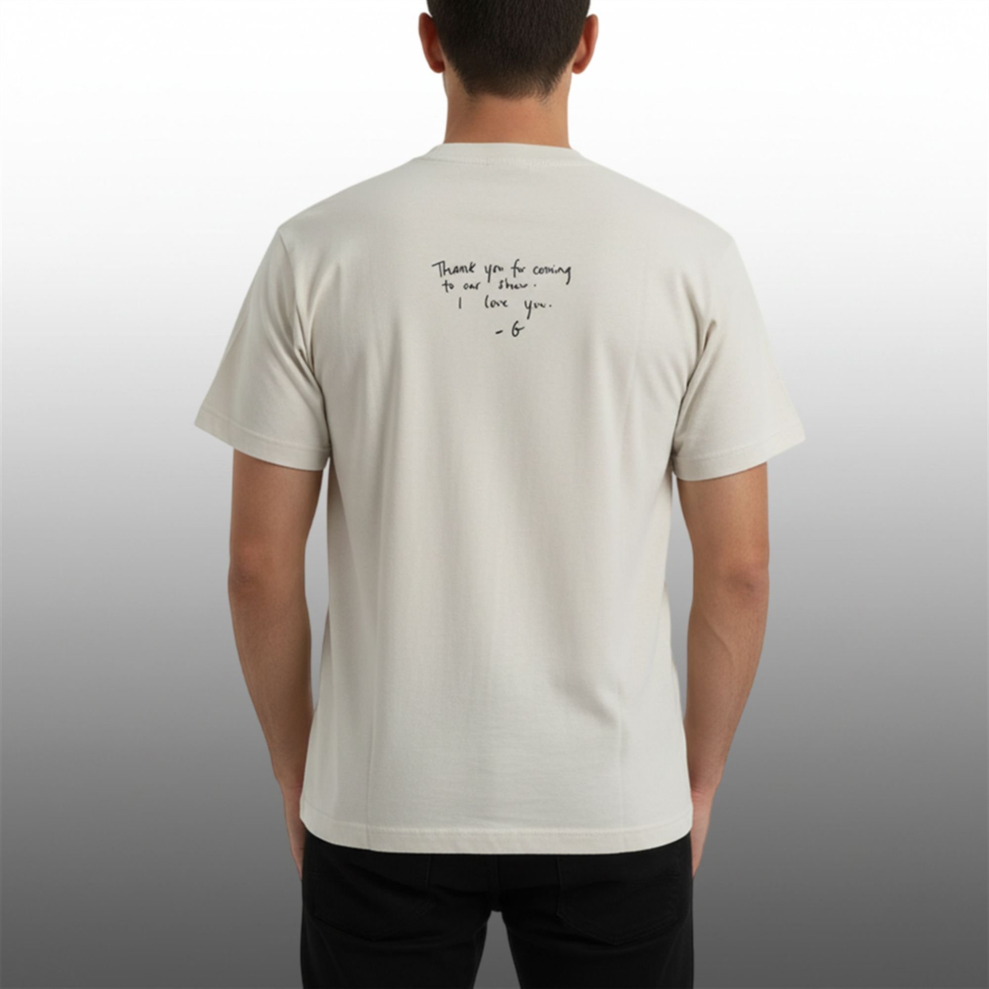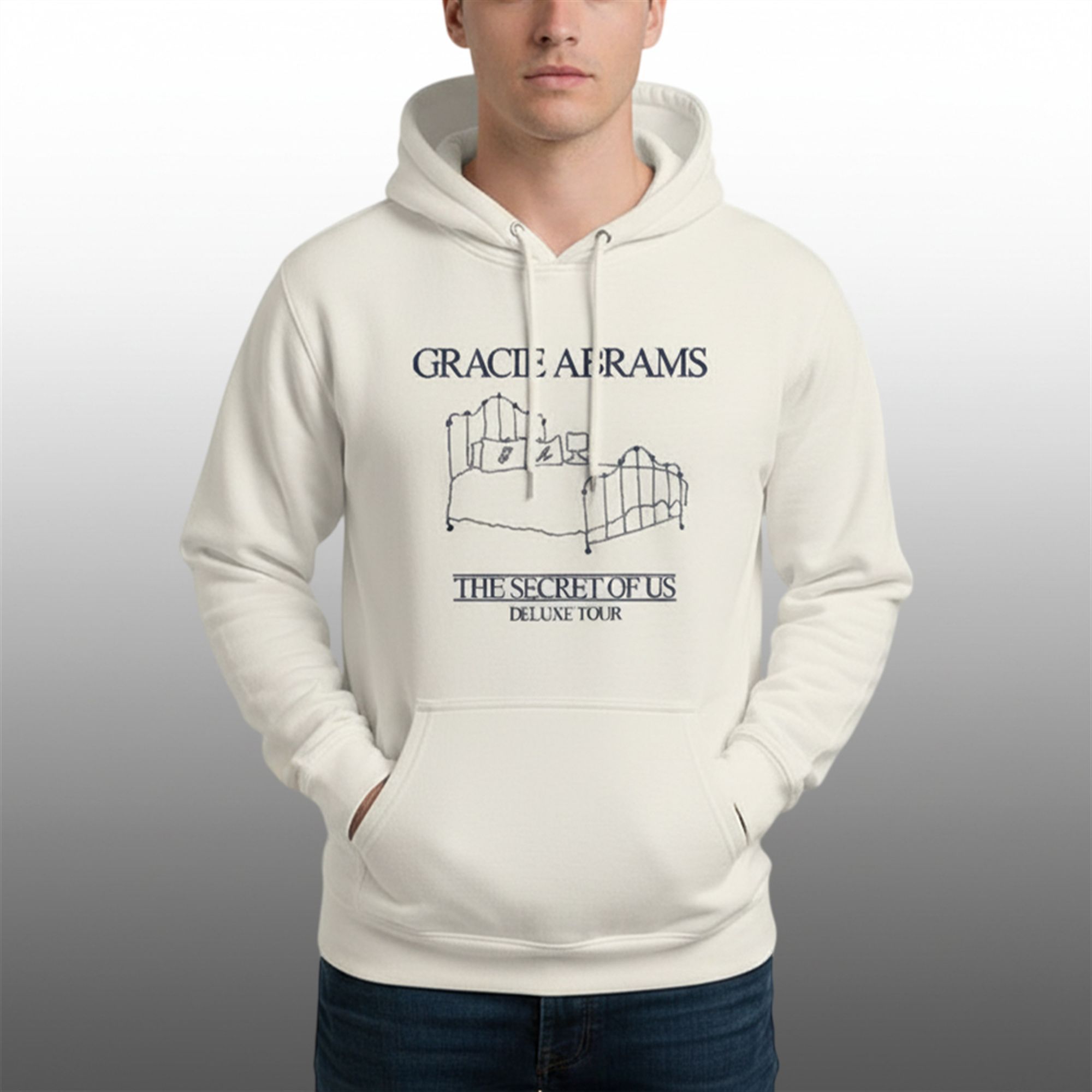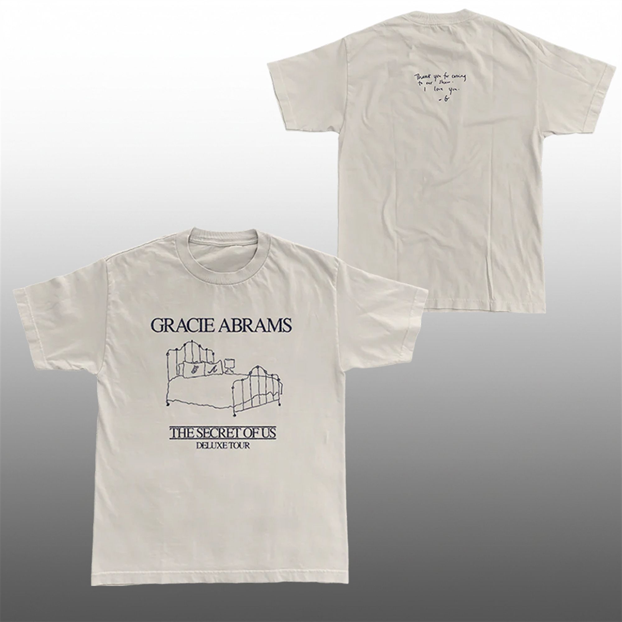 Crafted with a minimalist and thoughtful design, this shirt perfectly mirrors the “bedroom pop” aesthetic Gracie has mastered. The front features the iconic, single-line drawing of a bedframe—a central theme of the album’s intimate and vulnerable storytelling. Above and below this art, the shirt clearly states “Gracie Abrams” and “The Secret of Us” “Deluxe Tour” in a clean, timeless font. The soft, off-white color of the fabric provides the perfect canvas, making it a versatile piece that feels both current and timeless.