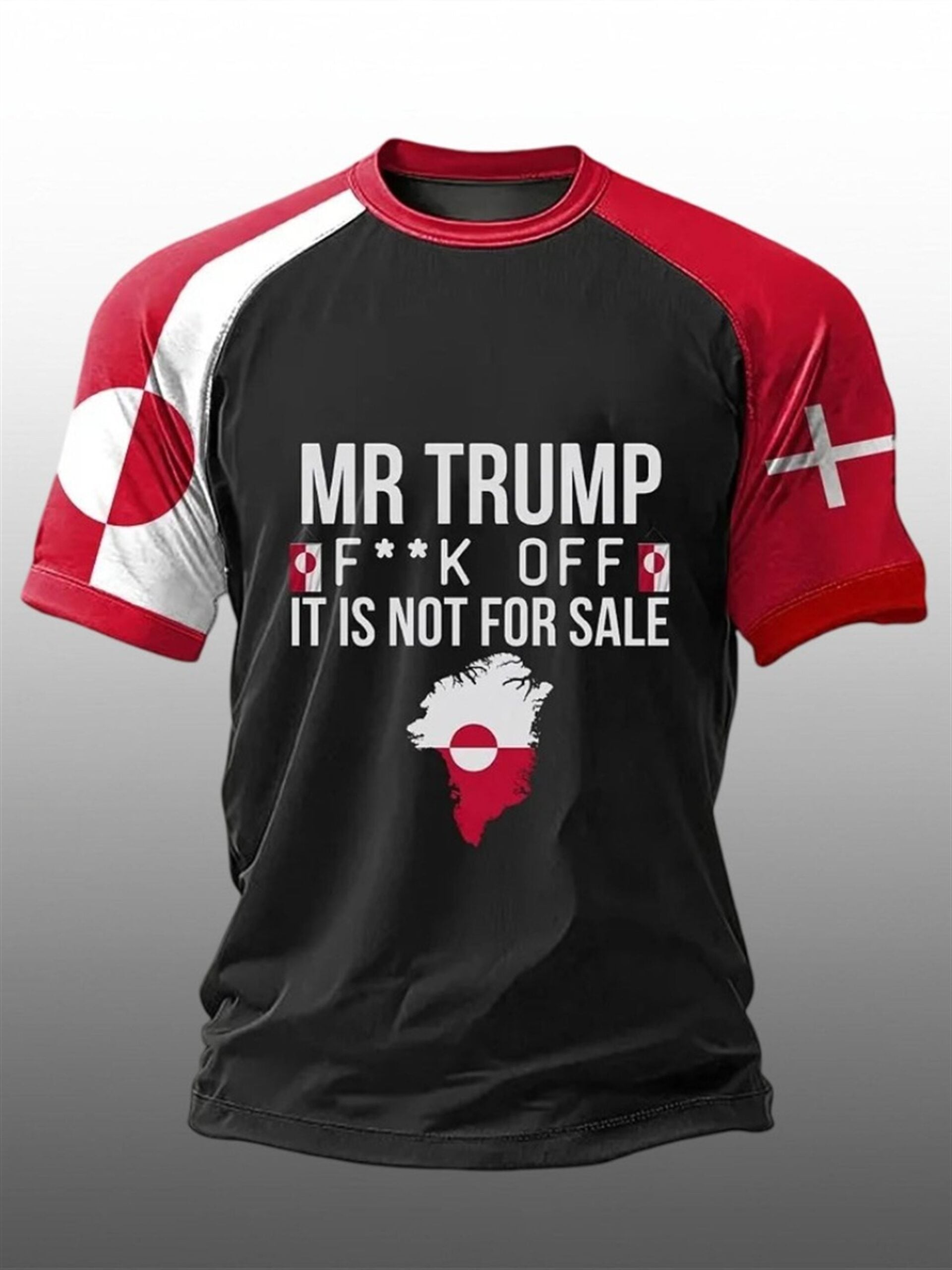 This shirt is a visual powerhouse, designed to turn heads and spark immediate conversation. The design is anchored by the stark, contrasting colors of the Greenlandic flag (Erfalasorput)—symbolizing the ice and the sun—intertwined with the Danish influence. The center graphic features a detailed silhouette map of Greenland, grounding the political message in geography. Overlaid is the unapologetic text: “MR TRUMP FK OFF IT IS NOT FOR SALE.”