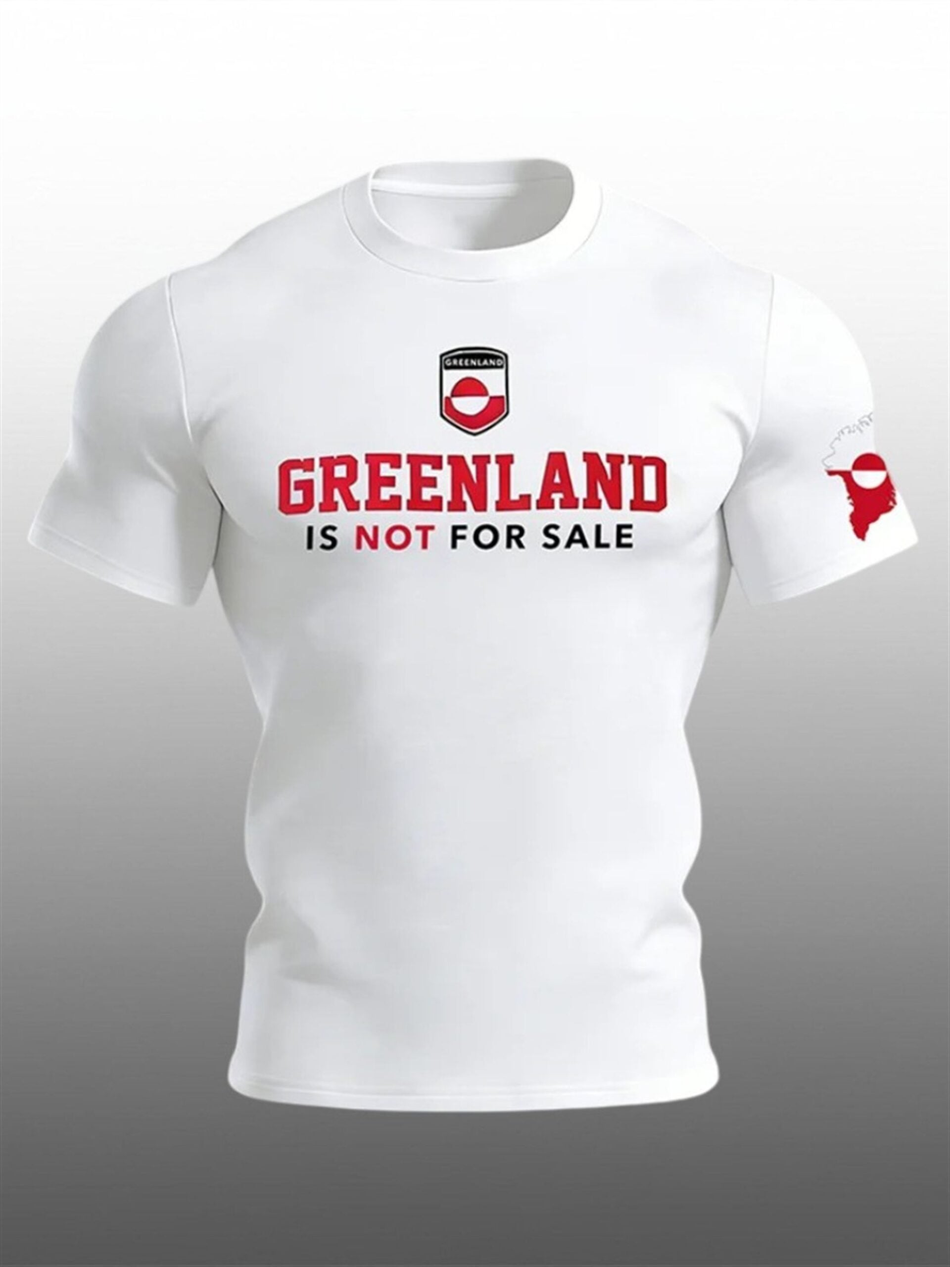 The shirt is designed for the individual who isn’t afraid to make a statement. At the center of the chest, the design showcases the text “GREENLAND IS NOT FOR SALE” in a robust, collegiate-style font, utilizing a striking red and black color palette that pops against the white background. Above the text sits the Greenlandic coat of arms (or a shield motif featuring the flag’s rising sun design), anchoring the message in national imagery.