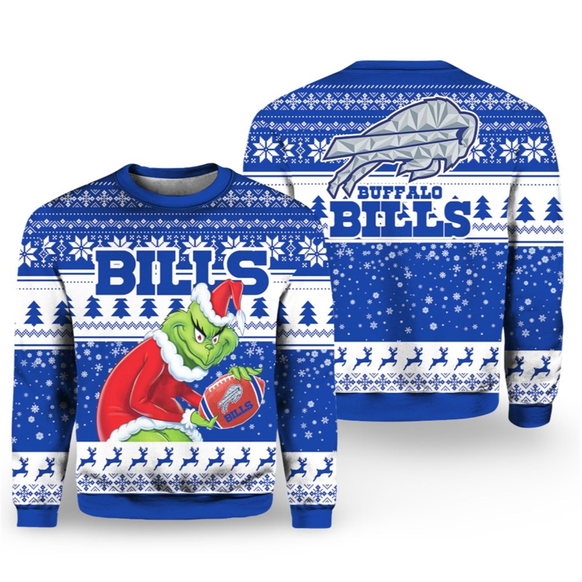 This sweater is a masterpiece of festive fandom. The front features the iconic Grnch, decked out in a vibrant red Santa suit, flashing that famous mischievous smile. But he’s not stealing presents; he’s clutching a game-ready Buffalo Bills football, ready to steal a first down from the team’s rivals. He’s not here to ruin Christmas; he’s here to make sure the Bills win it.