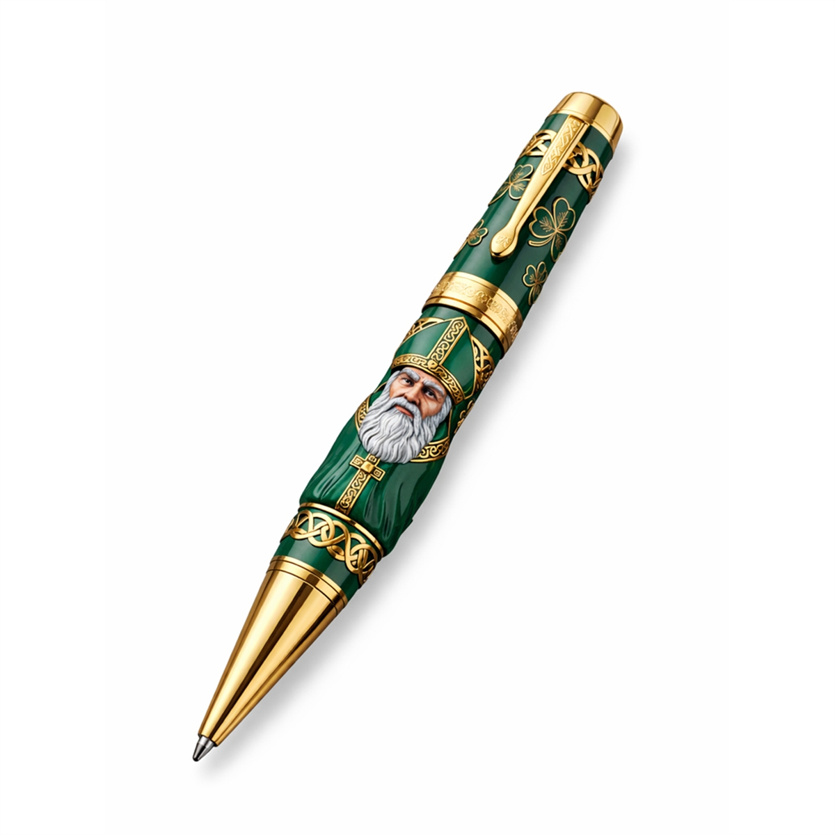 The pen is a striking visual tribute to Irish culture and history. The design features a rich, emerald-green barrel that serves as the perfect canvas for ornate, golden-toned shamrocks and traditional Celtic knot bands. At the center of the design is a highly detailed, majestic portrait of St. Patrick himself, rendered with striking visual depth. This 2026 design is crafted to be a functional piece of art, bringing the visual joy and history of the beloved holiday straight to your fingertips. It is a true statement piece that immediately draws the eye and sparks conversation.