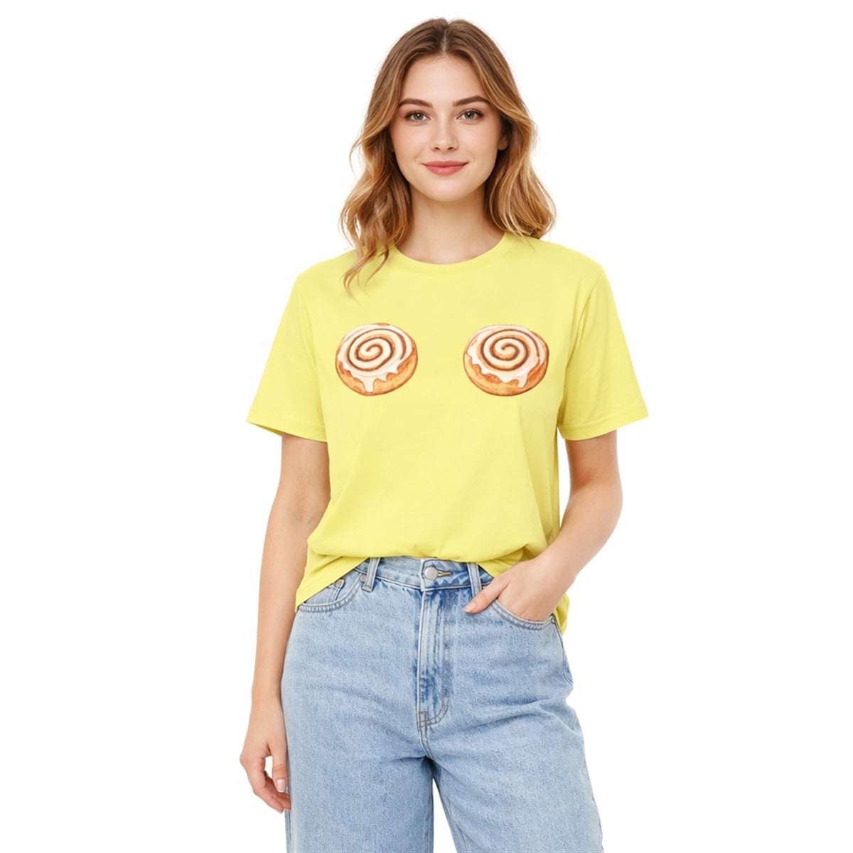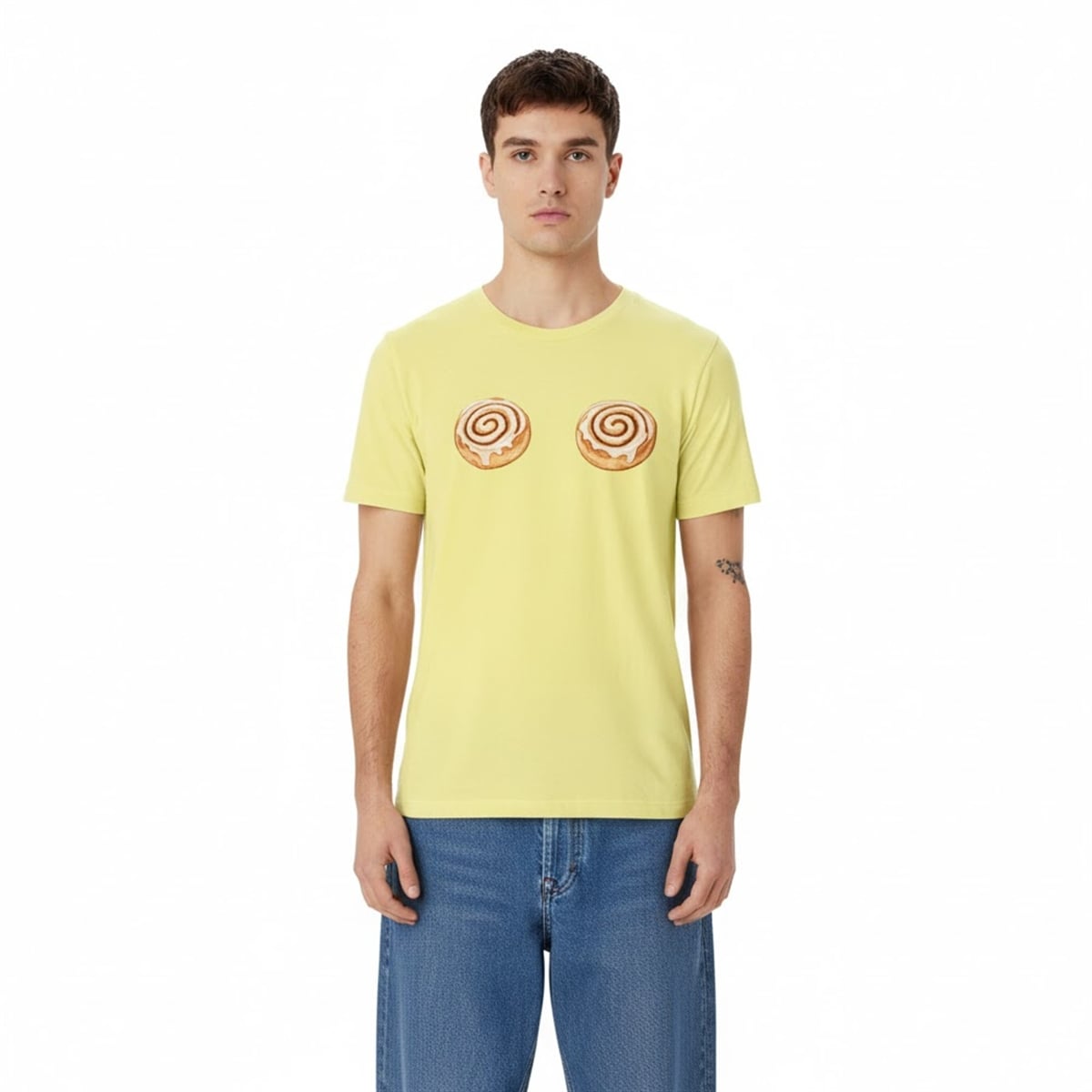 The shirt features a radiant, sun-yellow base adorned with two strategically placed, beautifully illustrated cinnamon roll graphics on the chest. The design is deliberately simple yet visually striking, relying on bright colors and undeniable visual comedy to make its impact. Designed to the exact aesthetic seen on the legendary late-night sketch comedy show, the garment provides a relaxed, everyday silhouette that effortlessly integrates into a modern streetwear wardrobe.