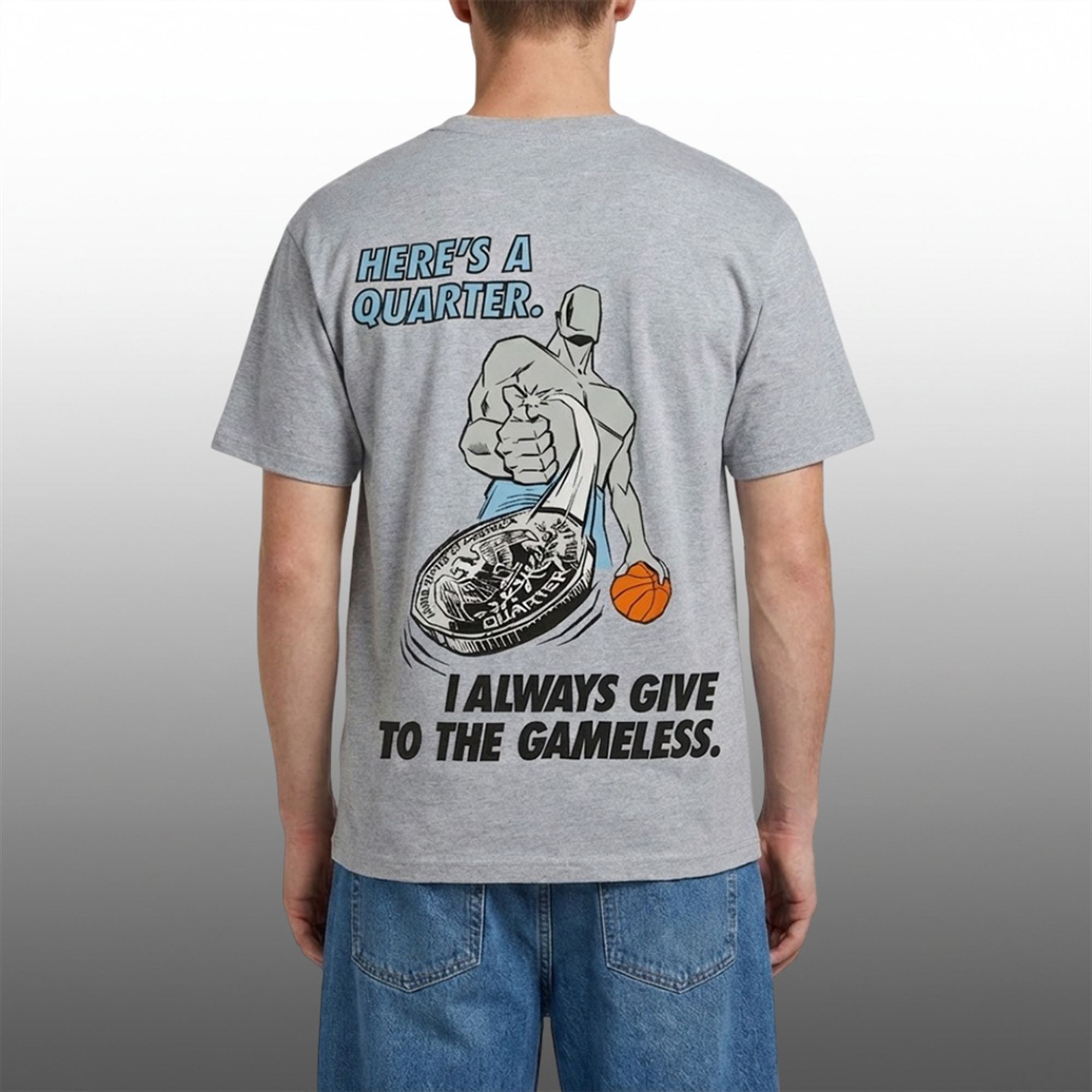 Step onto the court with confidence and a heavy dose of 90s nostalgia with our “Here’s A Quarter: I Always Give To The Gameless” Basketball Shirt. This tee isn’t just apparel; it’s a statement piece rooted in the golden era of streetball culture.