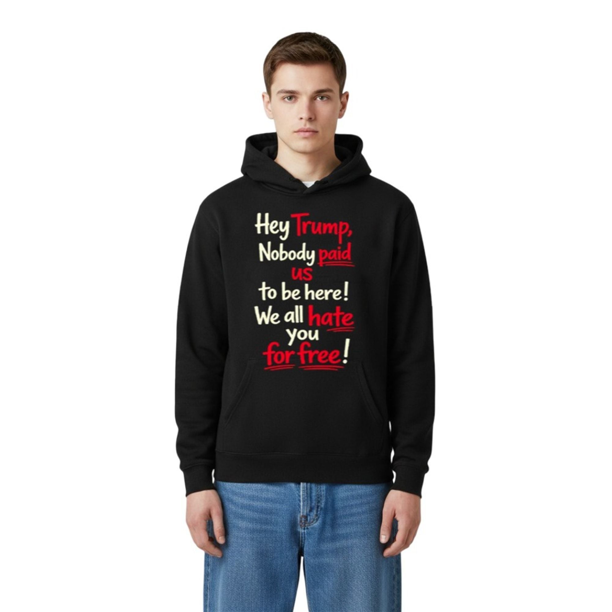 The layout of the text—”Hey Trump” in a casual yet confronting header, followed by the punchline “We All Hate You For Free“—is structured for maximum impact. The use of red for the words “Trump,” “paid,” “us,” “hate,” and “for free” creates a subliminal visual path that emphasizes the core message even if the viewer only glances at it. It is a masterclass in visual communication, ensuring the message is delivered instantly and effectively.