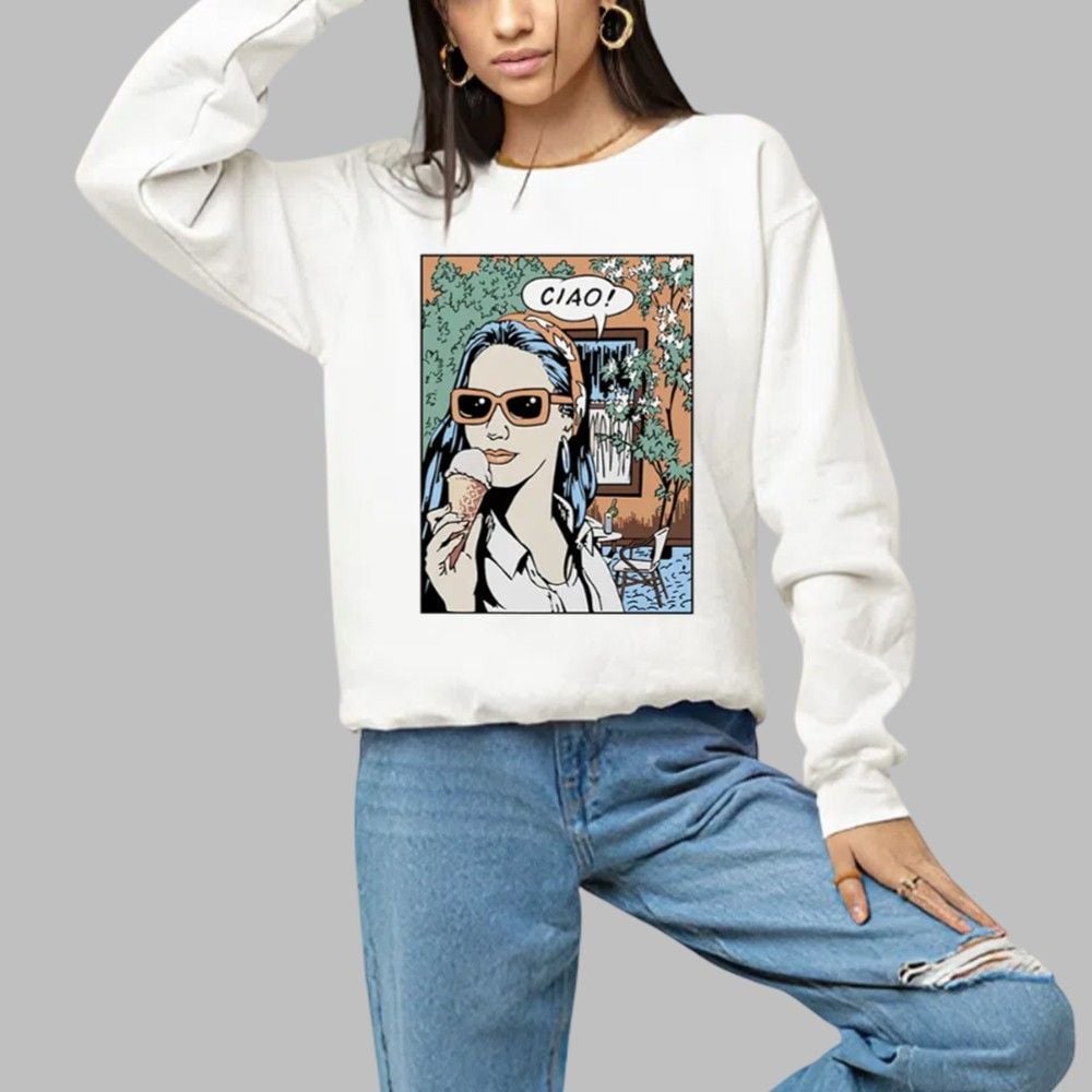 Embrace the vibrant energy of pop art and the timeless allure of a European summer with our High Potential Morgan Ciao Shirt. This isn’t just a t-shirt; it’s a conversation starter, a piece of wearable art that exudes confidence and a playful sense of sophistication. The central graphic, rendered in a classic comic book style, features a stylish woman with sunglasses and a headscarf, enjoying an ice cream cone against a charming patio backdrop. Her confident glance and the cheerful “CIAO!” in the speech bubble capture a perfect, carefree moment, instantly transporting you to a sunny Italian piazza.