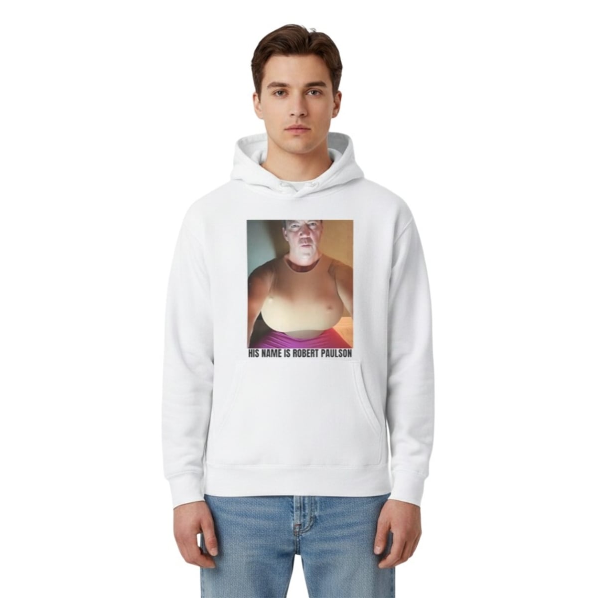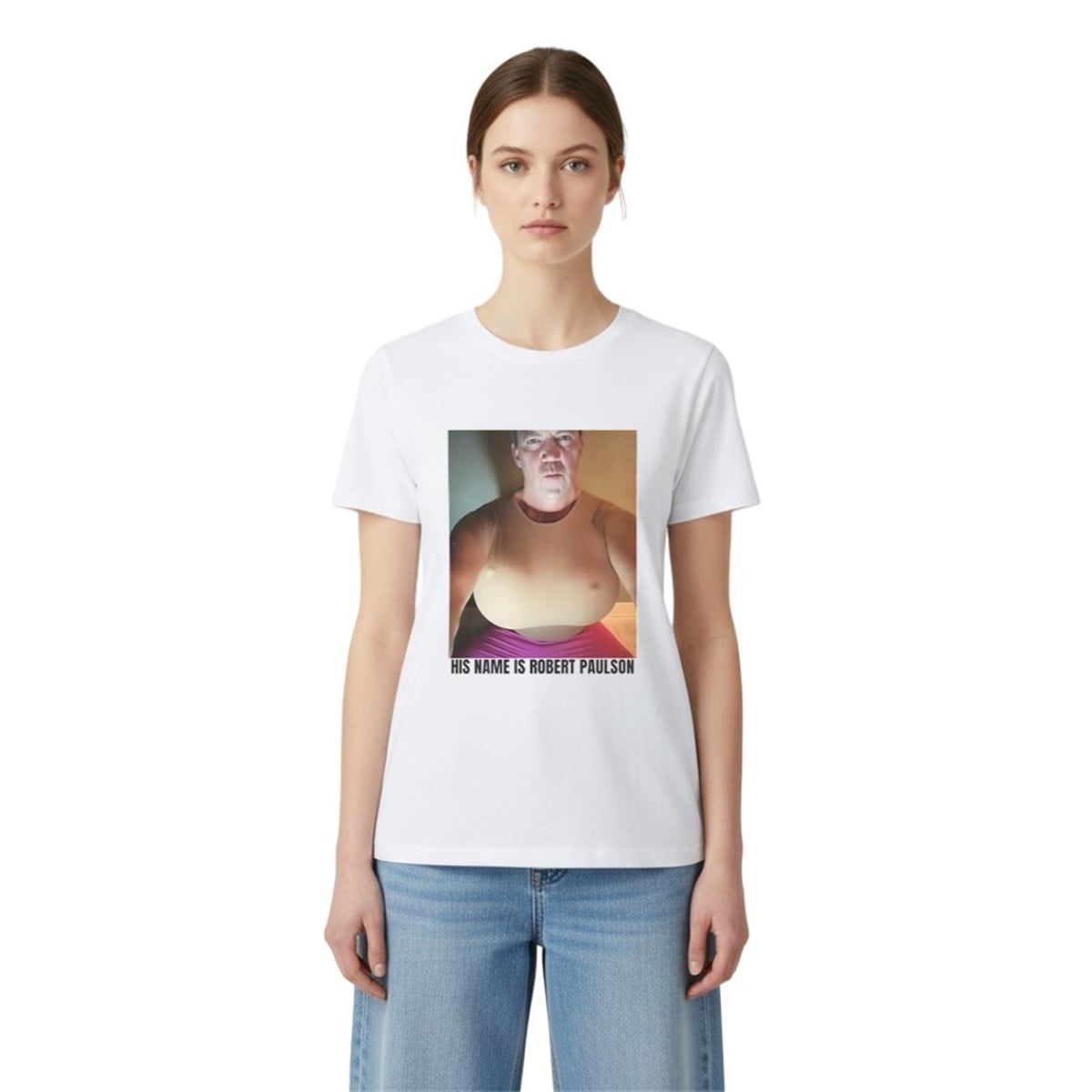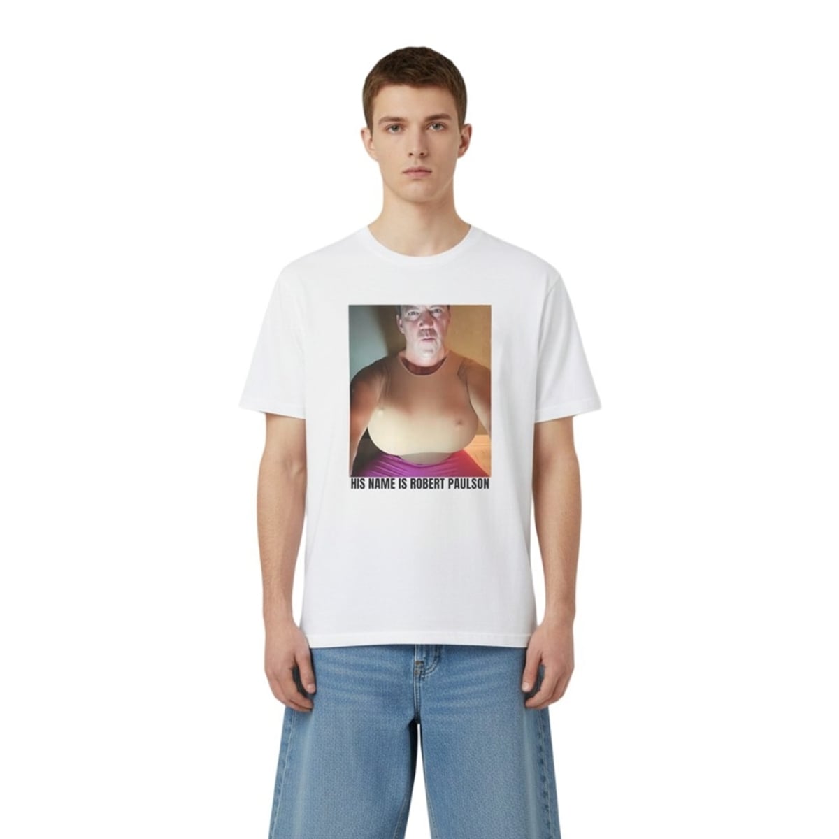 The shirt features a straightforward yet aggressively bold layout. Centered prominently on the front is the photographic graphic of the man in the comedic chest piece, framed like a chaotic selfie. Directly beneath this arresting image is the stark, bold, black capitalized text: HIS NAME IS ROBERT PAULSON.