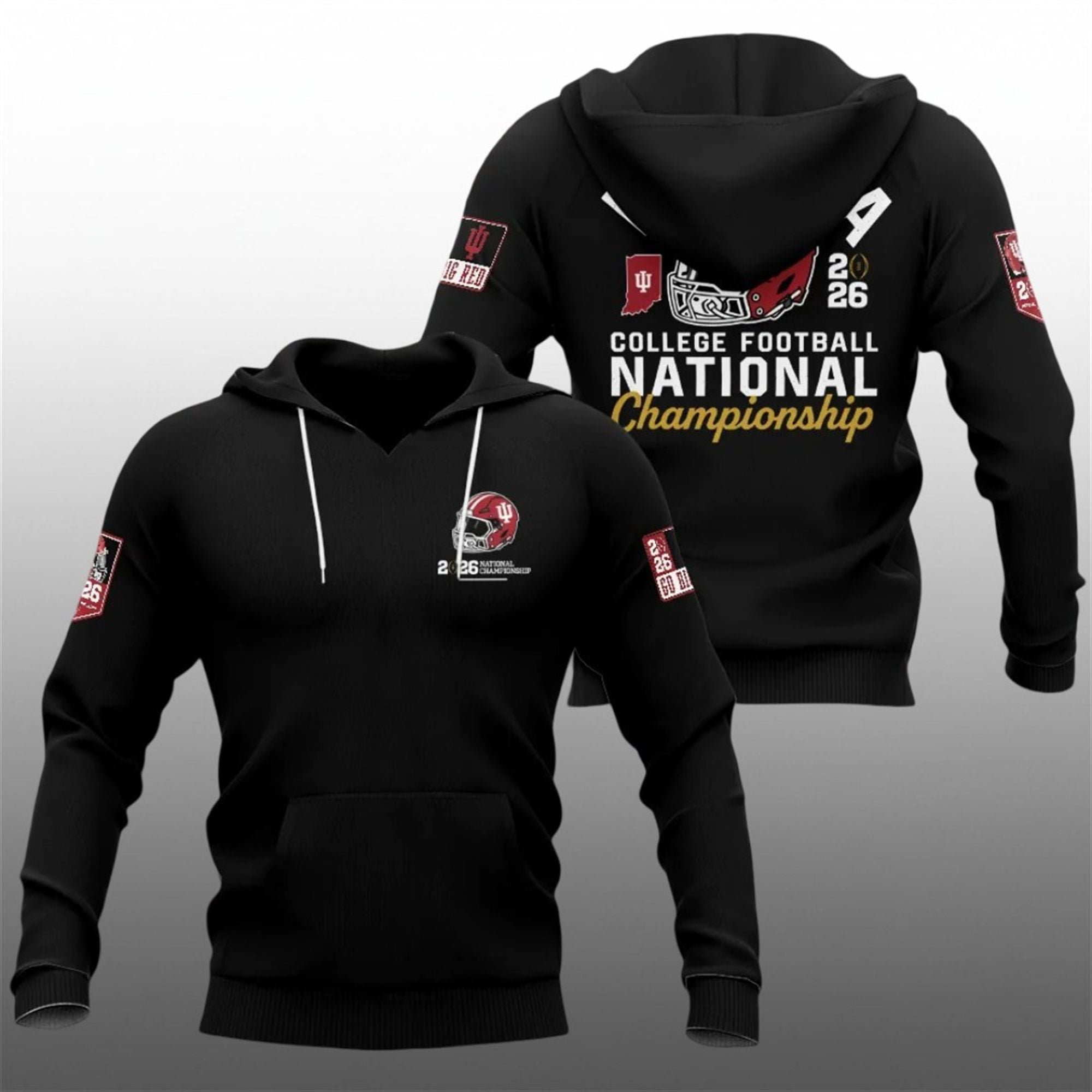This is the style merchandise celebrating the Indiana Hoosiers’ historic appearance in the 2026 College Football National Championship. The shirt features a bold, high-contrast design on a sleek black backdrop, ensuring the “Indiana” lettering and the classic red “IU” helmet pop visually.