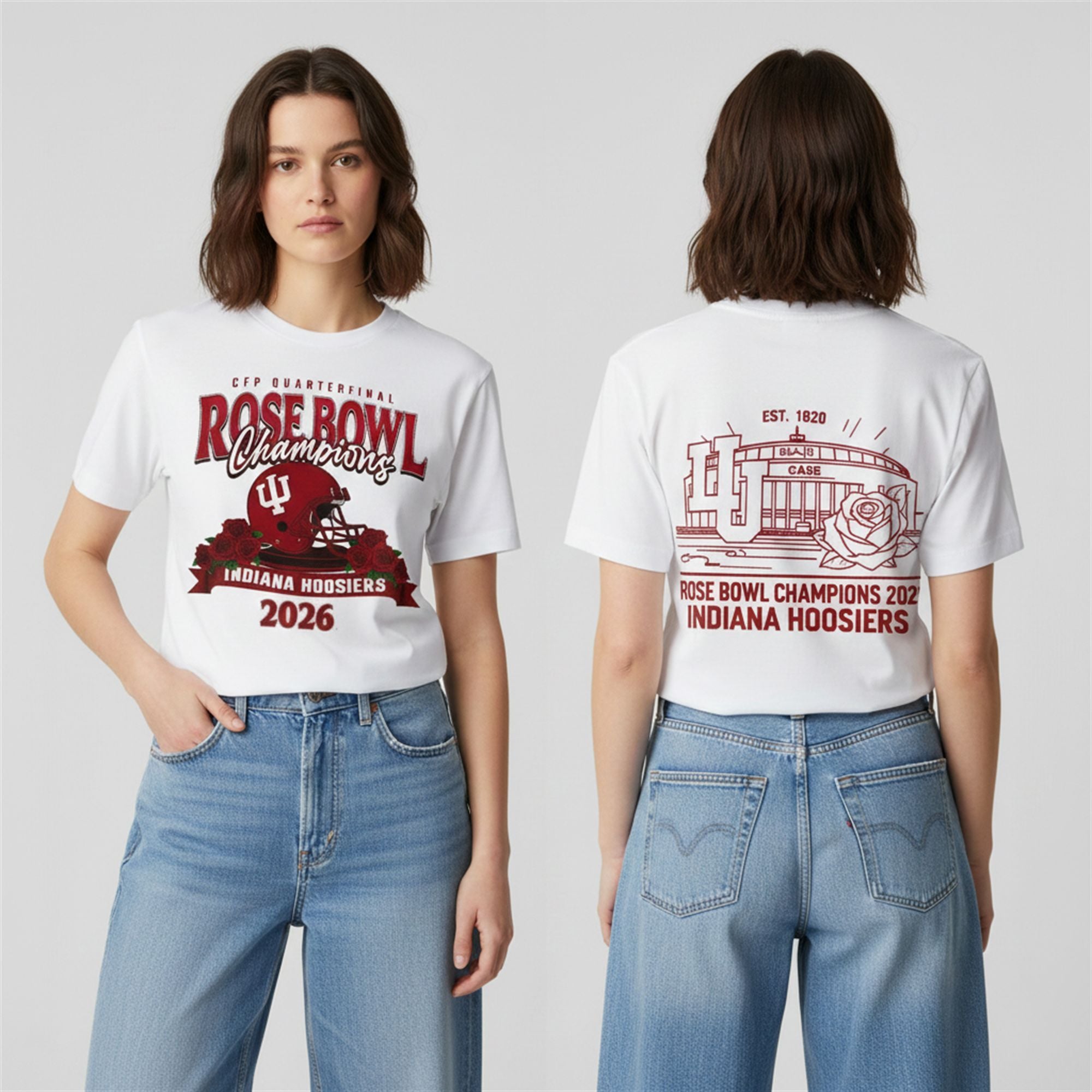 It features bold “Rose Bowl Champions 2026” typography on the front, flanked by the iconic roses that symbolize the Granddaddy of Them All. The back showcases a detailed, vintage-inspired illustration of the Rose Bowl stadium, grounded by the “Est. 1820” mark—a reminder that while this championship is new, the Hoosier spirit is eternal.