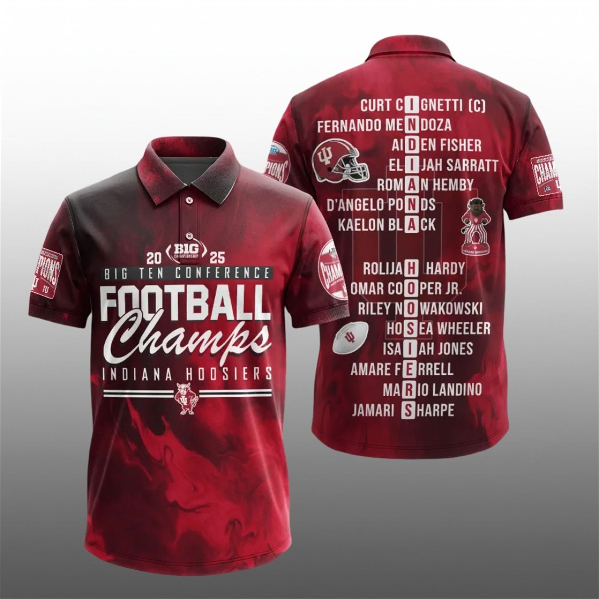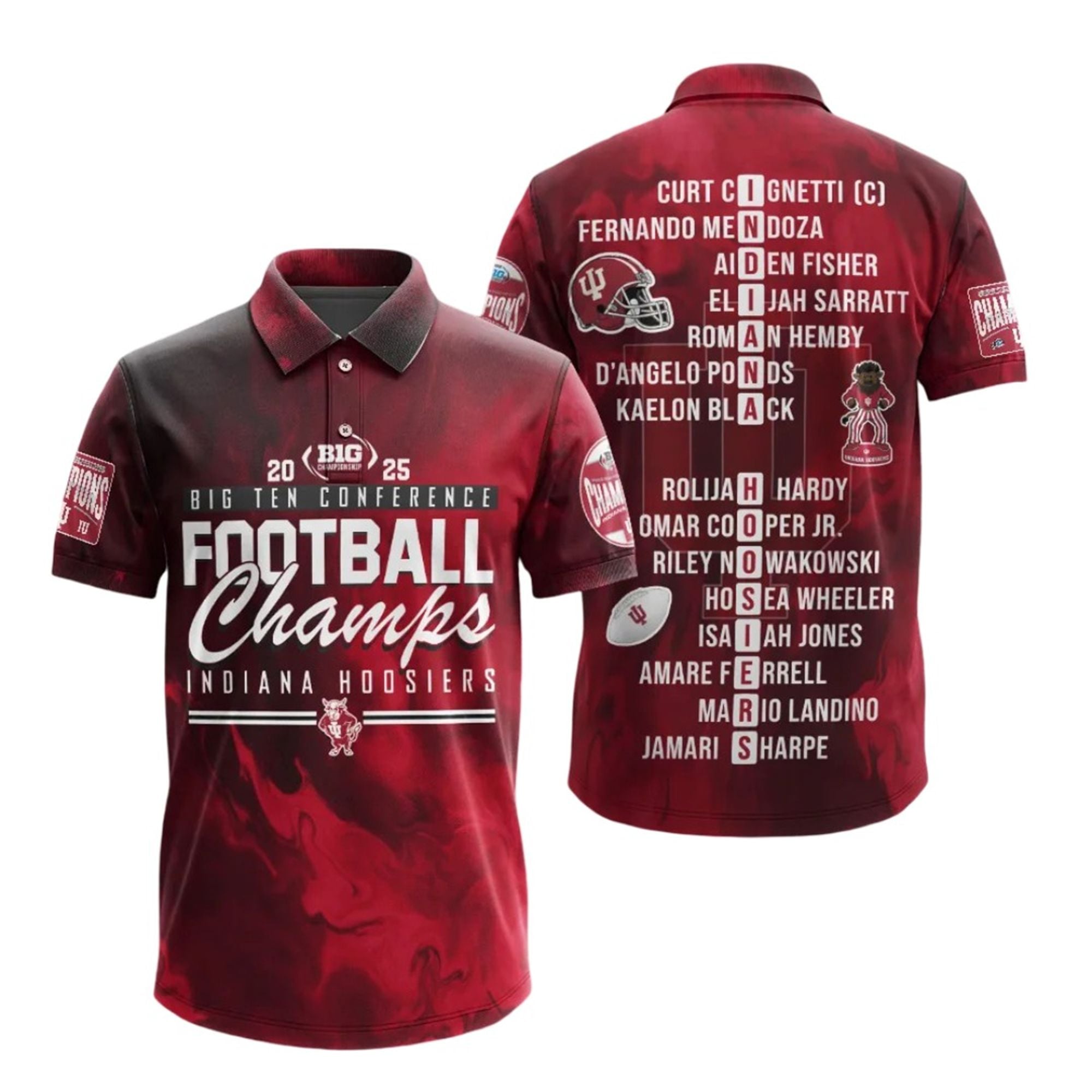 The 2025 season will forever be etched in the memories of Indiana football fans. This polo shirt is designed to capture the energy, the grit, and the glory of the Big Ten Championship run. The front of the shirt features a bold, dynamic graphic declaring “2025 Big Ten Conference Football Champs,” set against a deep, smoky crimson background that exudes power and prestige. It is a visual statement that lets everyone know exactly where your allegiance lies and that the Hoosiers are the kings of the conference.