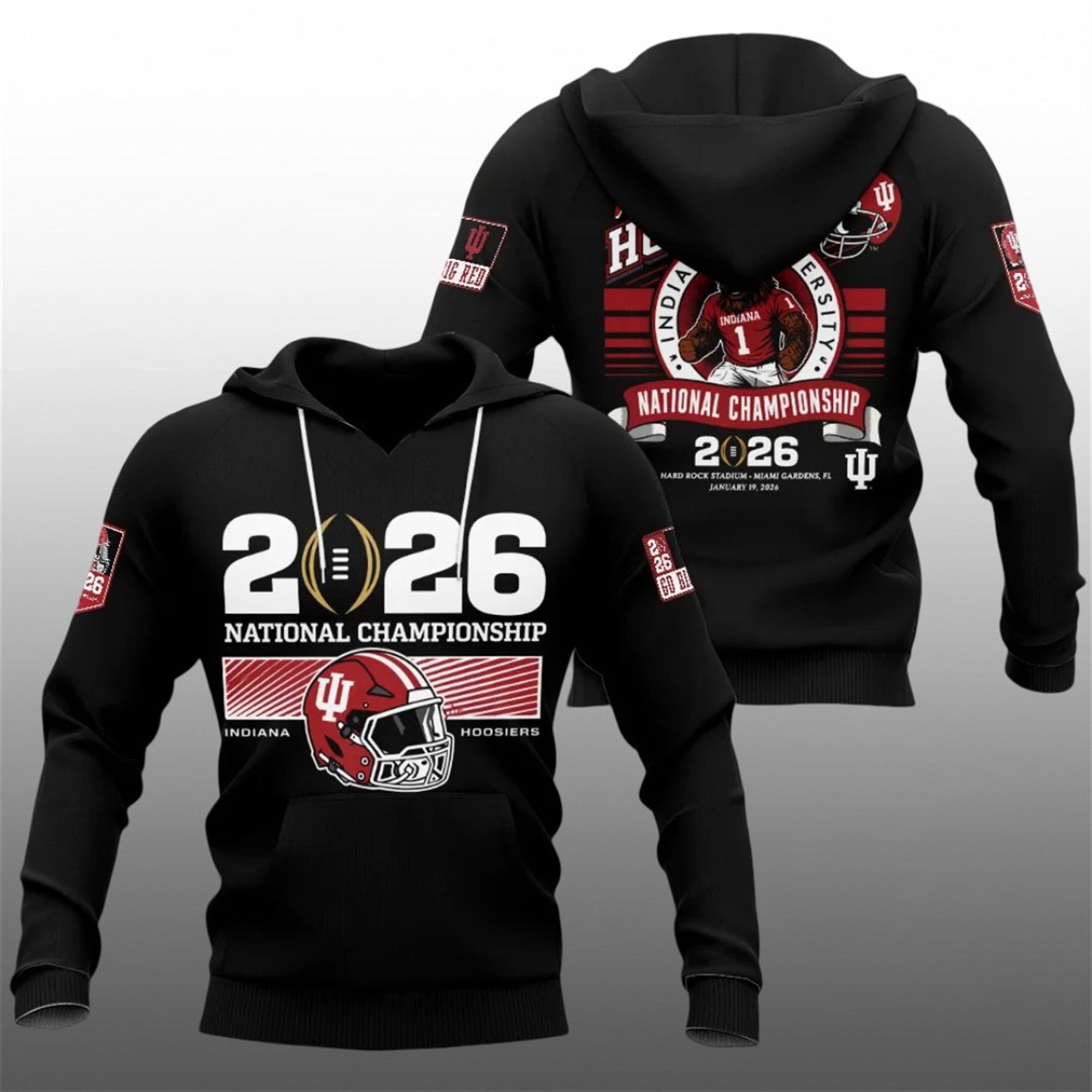 Front Design: The chest features a dominant “2026” graphic intertwined with the iconic golden playoff football logo. Below, a high-definition illustration of the Crimson and Cream helmet sits proudly against a dynamic crimson backdrop, flanked by the “National Championship” text. The bold typography demands attention, signaling that the Hoosiers have arrived on the biggest stage.