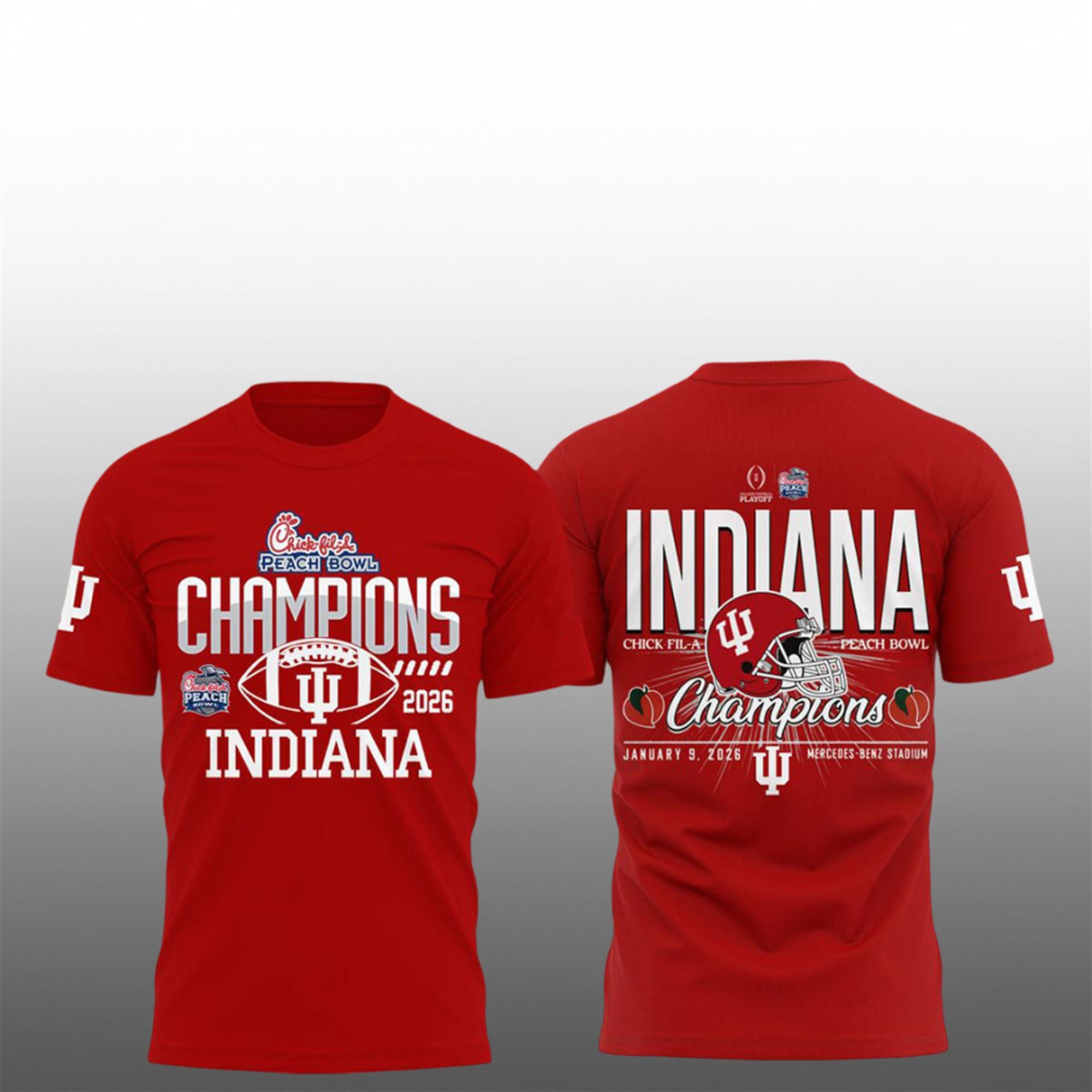 The visual impact of this shirt matches the intensity of the Hoosiers’ performance. The front proudly displays the “Chick-fil-A Peach Bowl Champions” text, anchored by the iconic IU trident logo inside a stylized football, signaling the team’s relentless drive. The crisp, white lettering against the deep crimson background ensures the message is clear: Indiana is the champion.