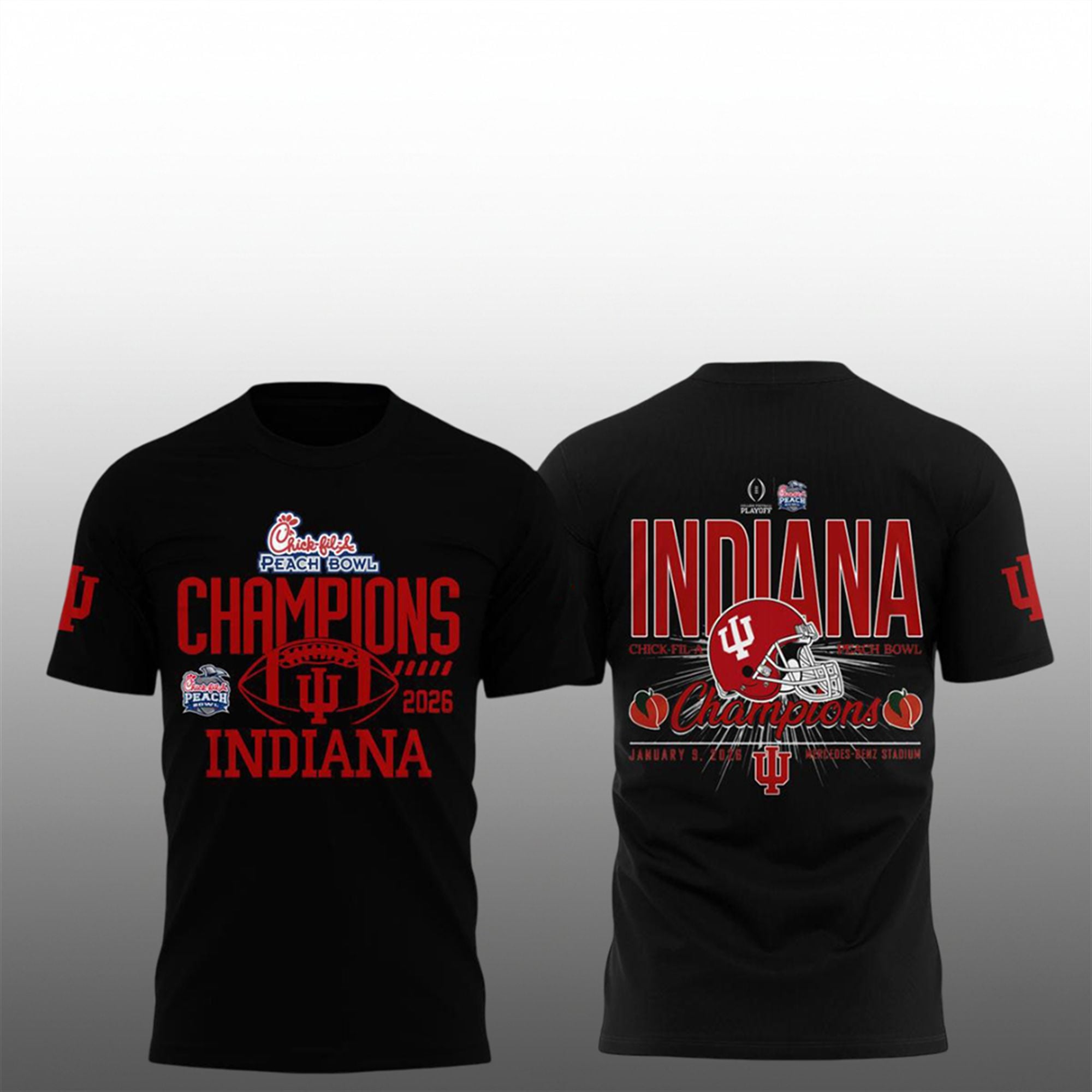 On the back, the details get even better. A dynamic graphic features an authentic Indiana football helmet flanked by peaches, symbolizing the conquest of the South. The text “Mercedes-Benz Stadium” and the date “January 9, 2026” provide the specific context that collectors crave. This isn’t a generic bowl shirt; it is a time-stamped record of the exact moment Indiana punched their ticket to the National Title game. The layout is optimized for visibility, making it perfect for game day photos and victory parades.