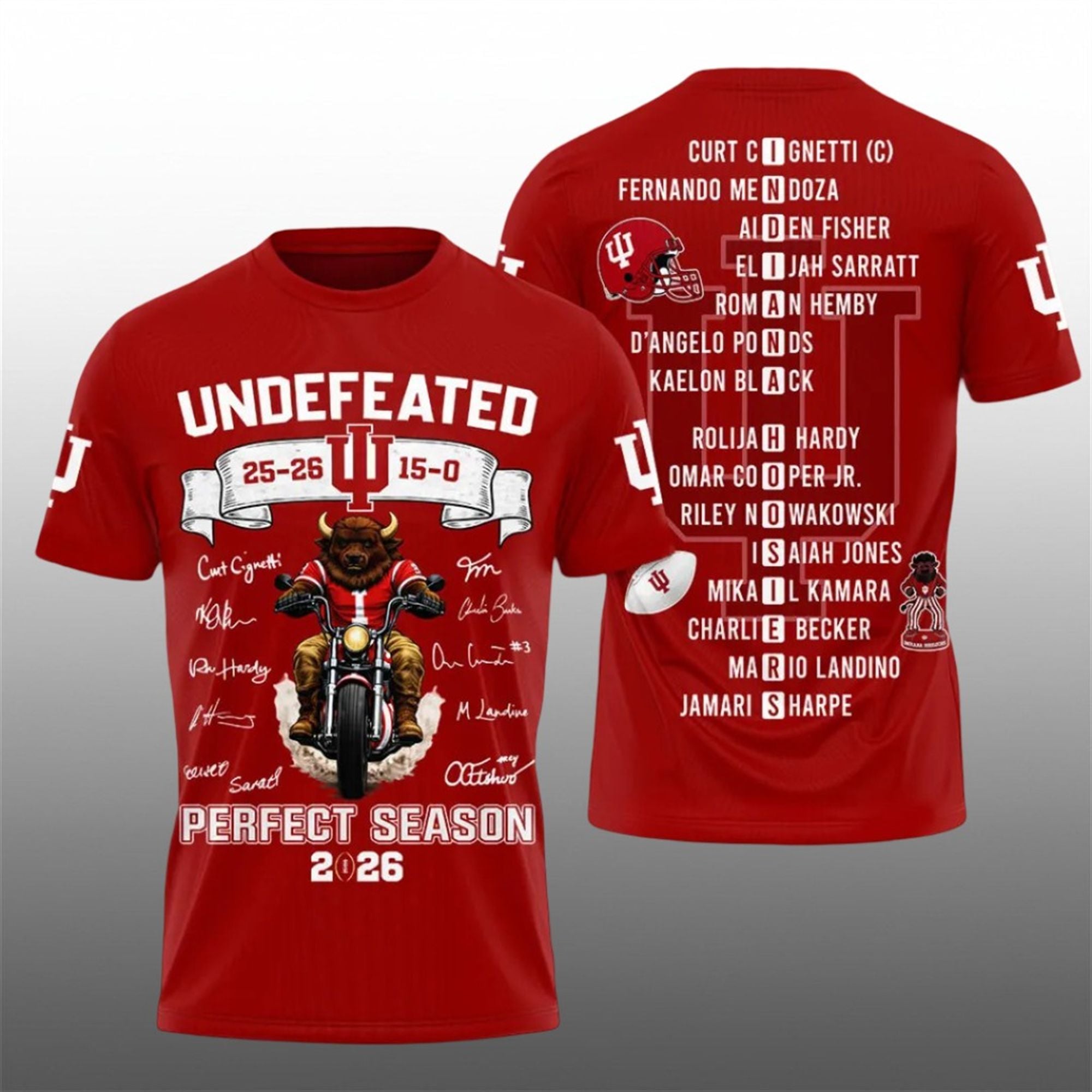 This shirt exploded in popularity across social media due to the sheer shock value of Indiana achieving a 15-0 record, a feat many pundits thought impossible. The graphic became an instant meme, symbolizing the program’s sudden, rebellious rise to the top of the college football world under Coach Cignetti. Fans loved the combination of the aggressive, fun mascot imagery with the undeniable prestige of the “Perfect Season” text. Finally, the roster list on the back allowed fans to proudly wear the names of the transfer portal stars who became campus legends overnight.