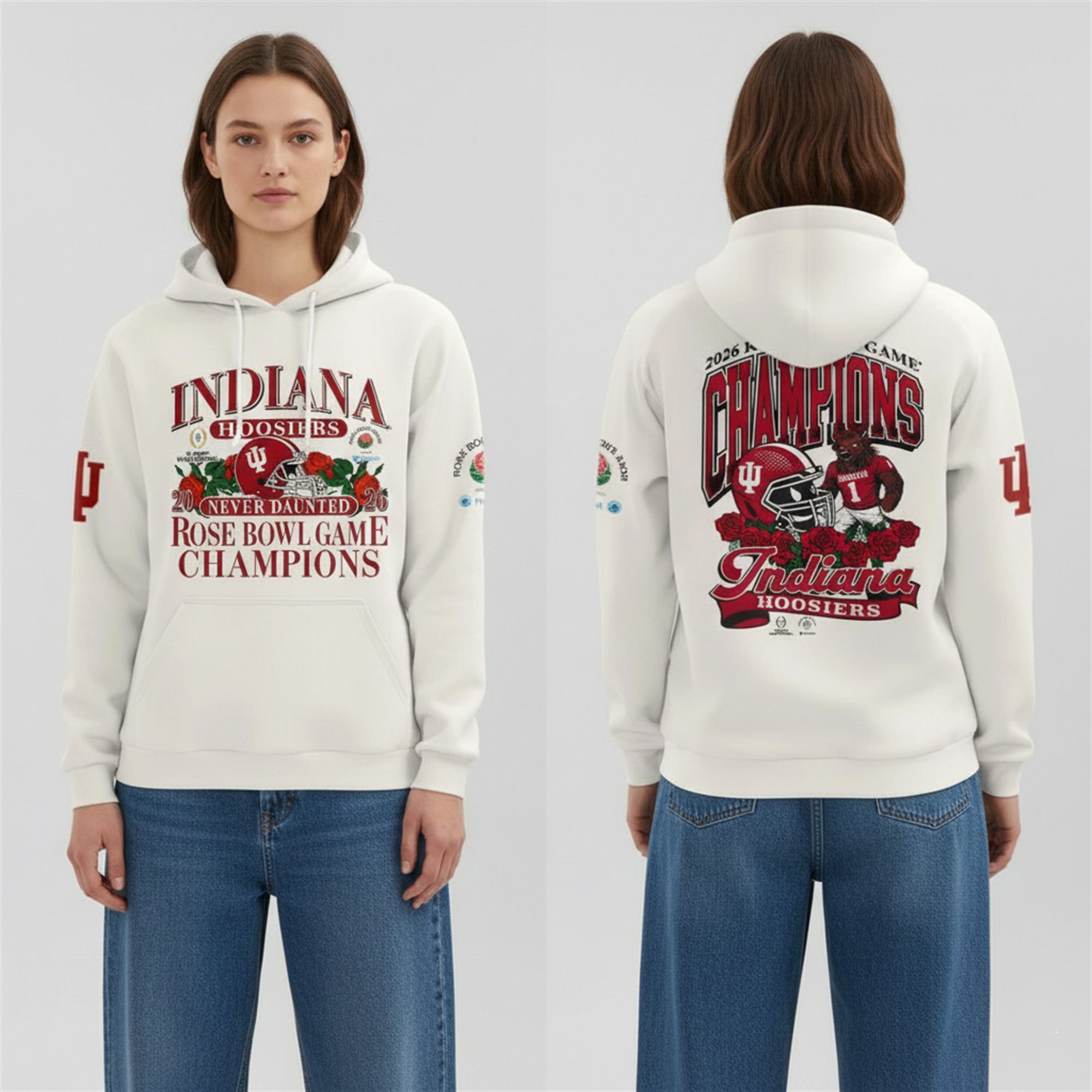 This hoodie is more than just merchandise; it is a wearable trophy for every fan who believed. The front design boldly features the “Never Daunted” mantra—a lyric etched into the hearts of every IU supporter—flanked by the 2026 Rose Bowl insignia and the classic IU helmet nestled in victory roses.