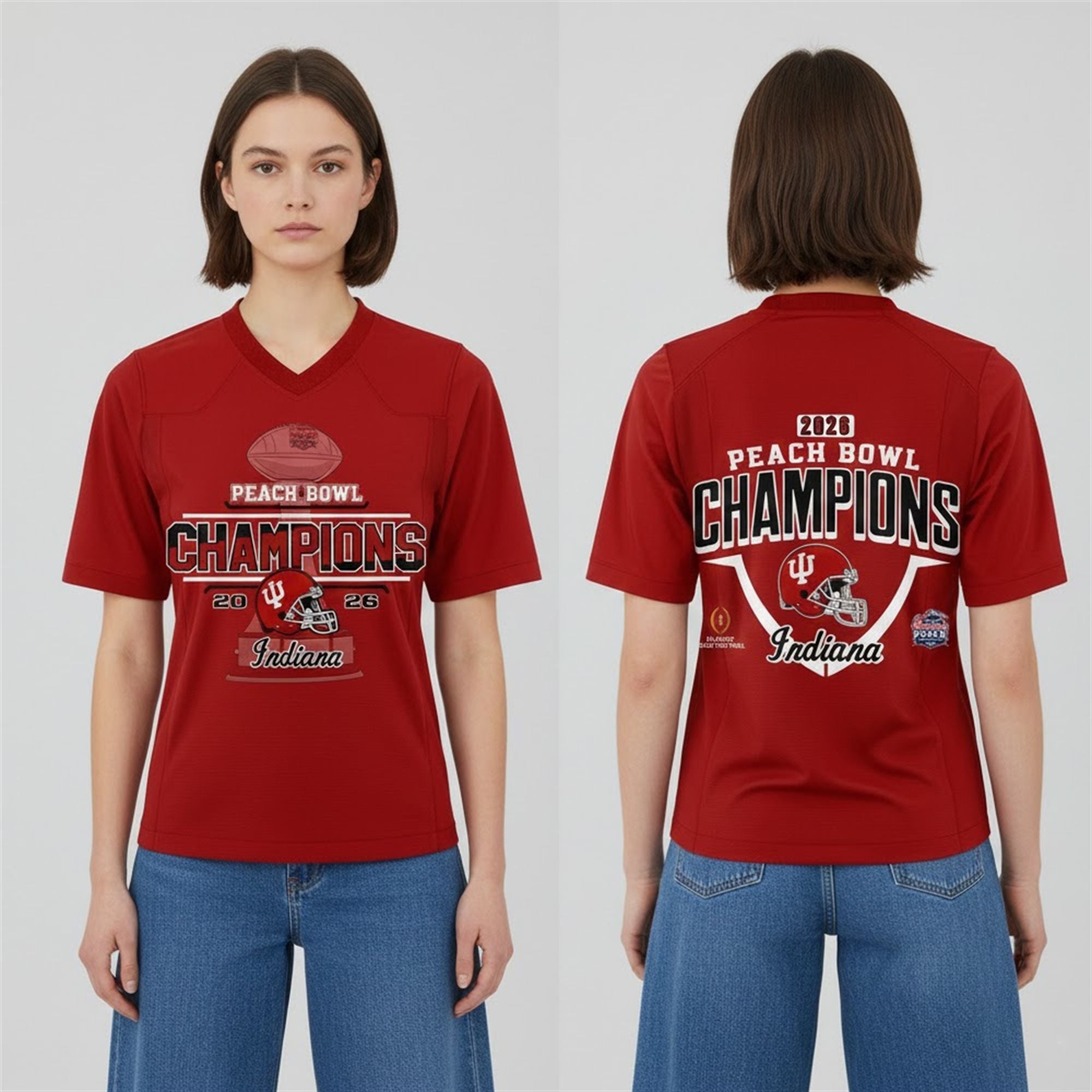 This jersey is meticulously designed to mirror the on-field glory of the 2026 squad. The front features a bold, commemorative “Peach Bowl Champions” graphic, anchored by the iconic IU trident and a stylized football helmet design that commands attention. The chest prominently displays the year “2026,” immortalizing the season where expectations were shattered.