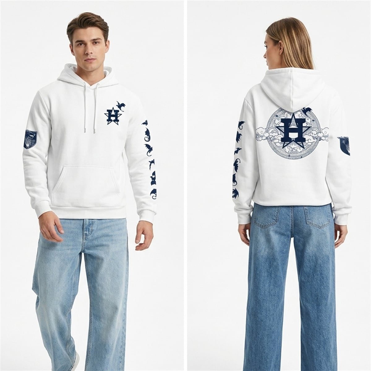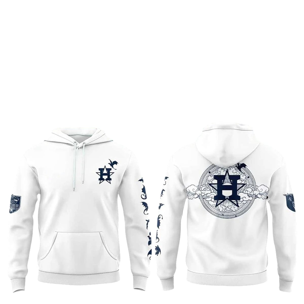 The hoodie is a visual masterpiece that celebrates a groundbreaking themed event. The garment serves as a crisp, stark white canvas that makes the deep navy-blue graphics truly pop. On the front, the classic Astros “H” and star logo is subtly reimagined, accompanied by the sleek silhouette of a dragon taking flight.