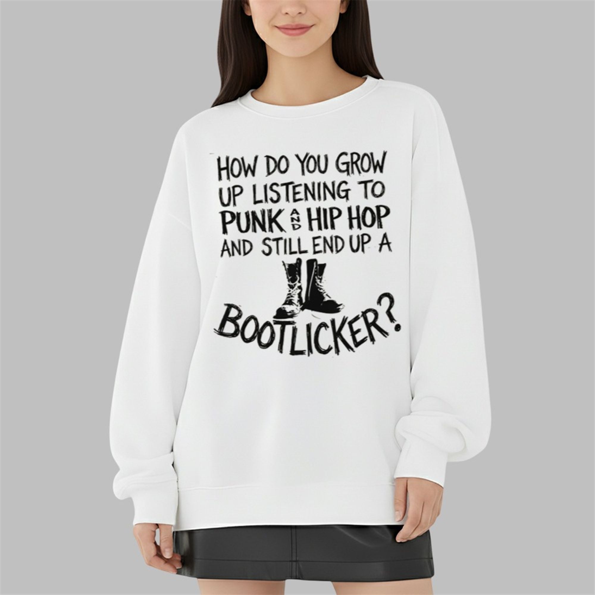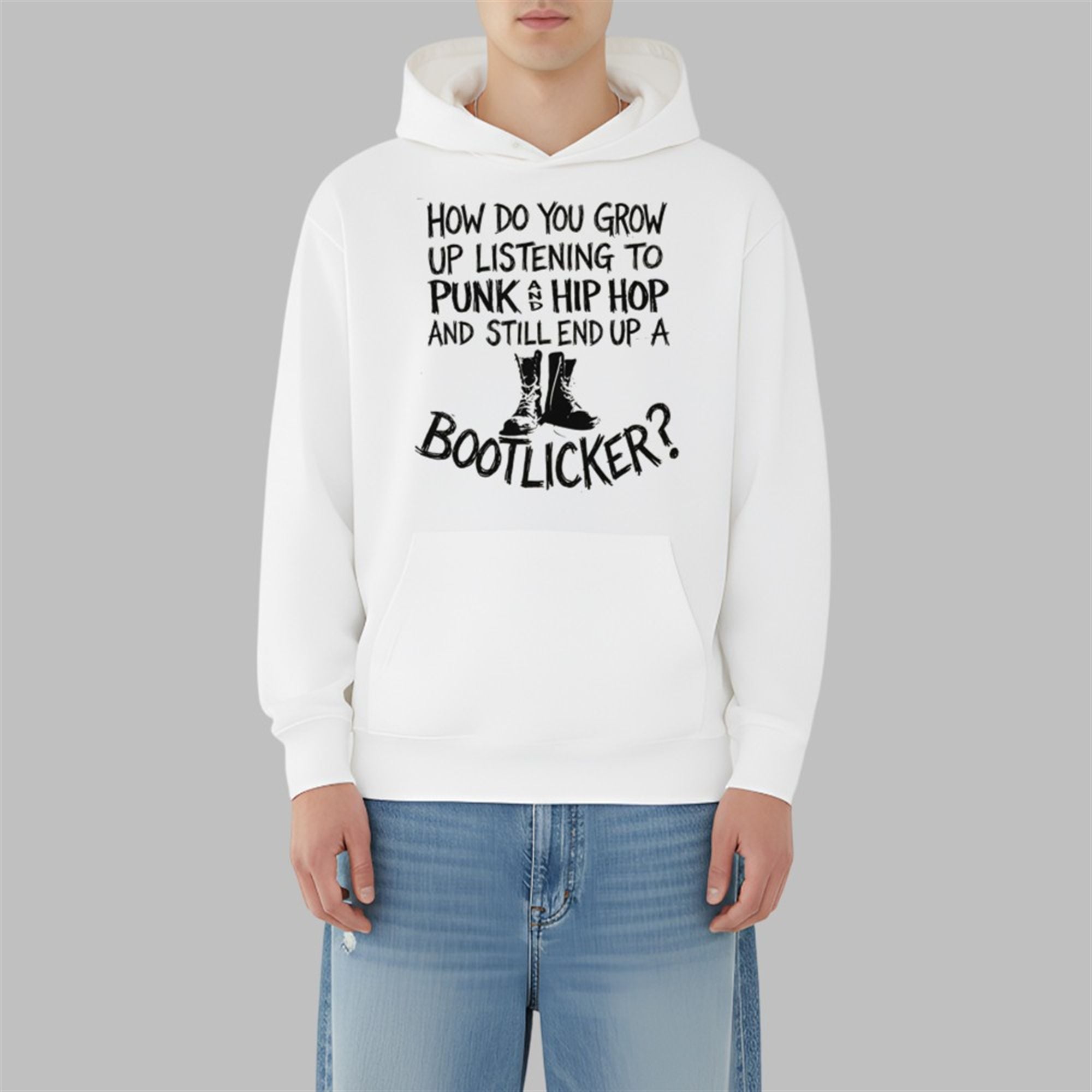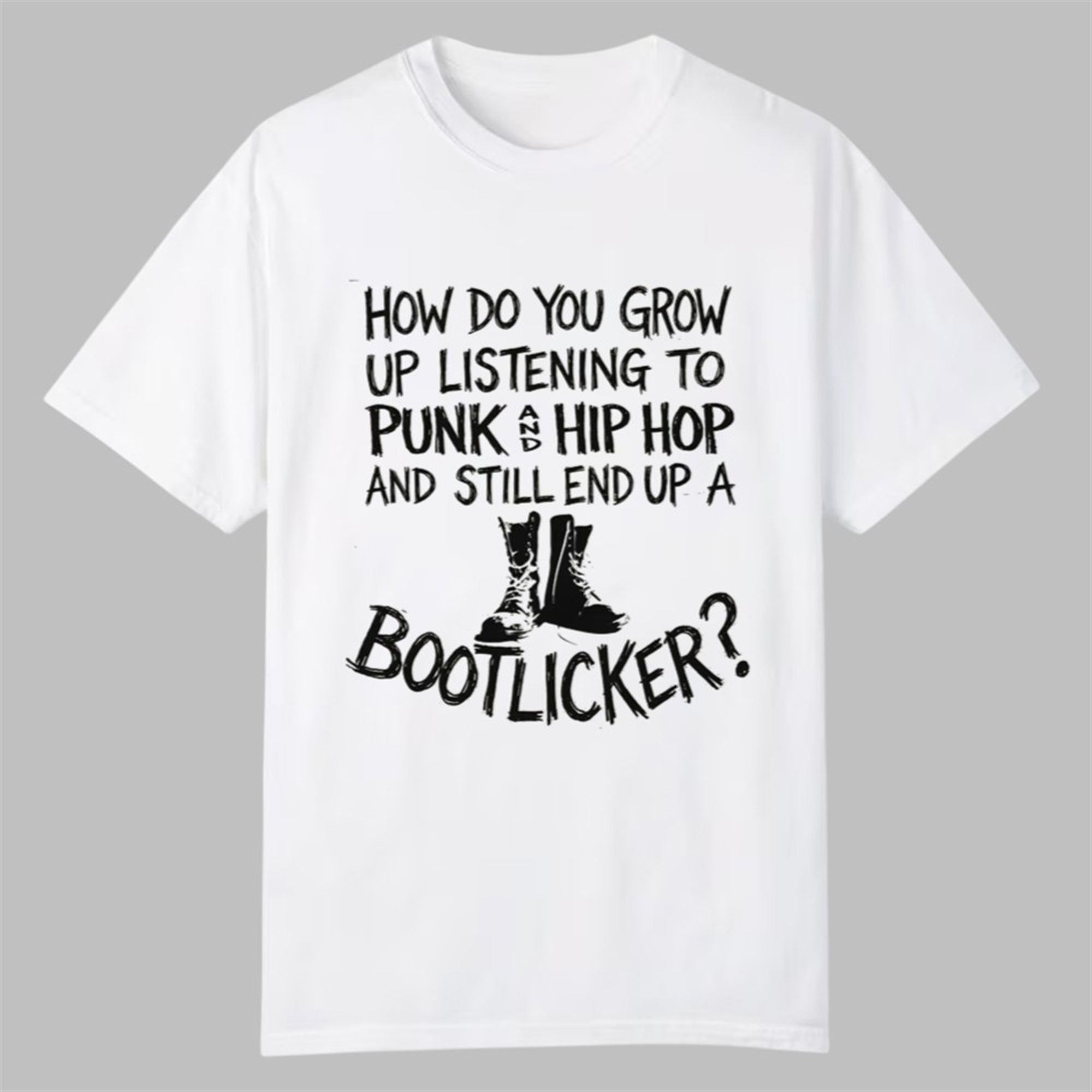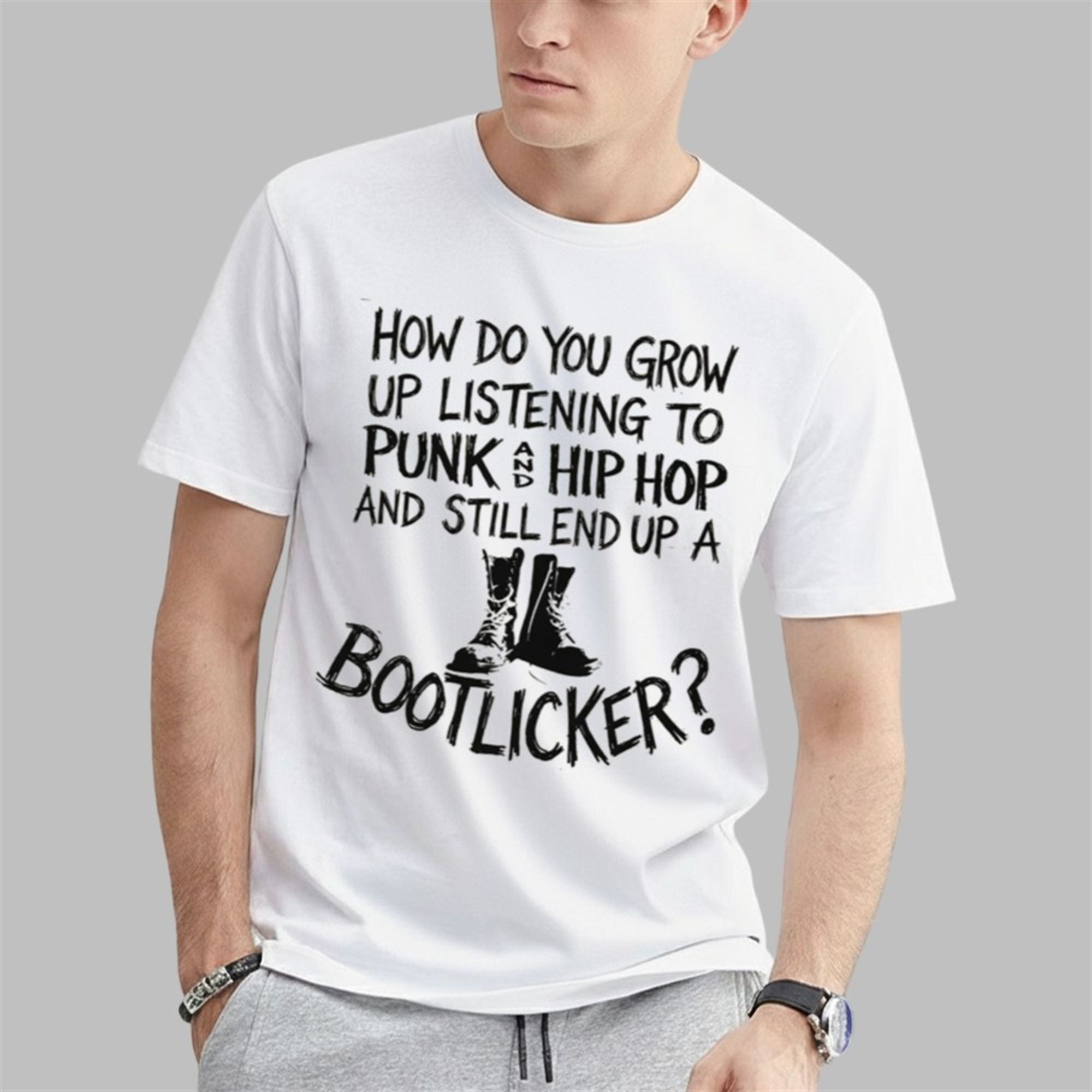 The central question “How Do You Grow Up Listening To Punk And Hip Hop Music And Still End Up A Bootlicker” posed by the shirt cuts deep. It addresses a specific cultural phenomenon: the generation that grew up on lyrics about fighting the power, only to become the enforcers of that very power later in life. By wearing this, you aren’t just wearing a shirt; you are engaging in cultural criticism. You are aligning yourself with the roots of the music—the anti-racist, anti-classist, and anti-authoritarian spirit that defined legends from The Clash to Public Enemy.