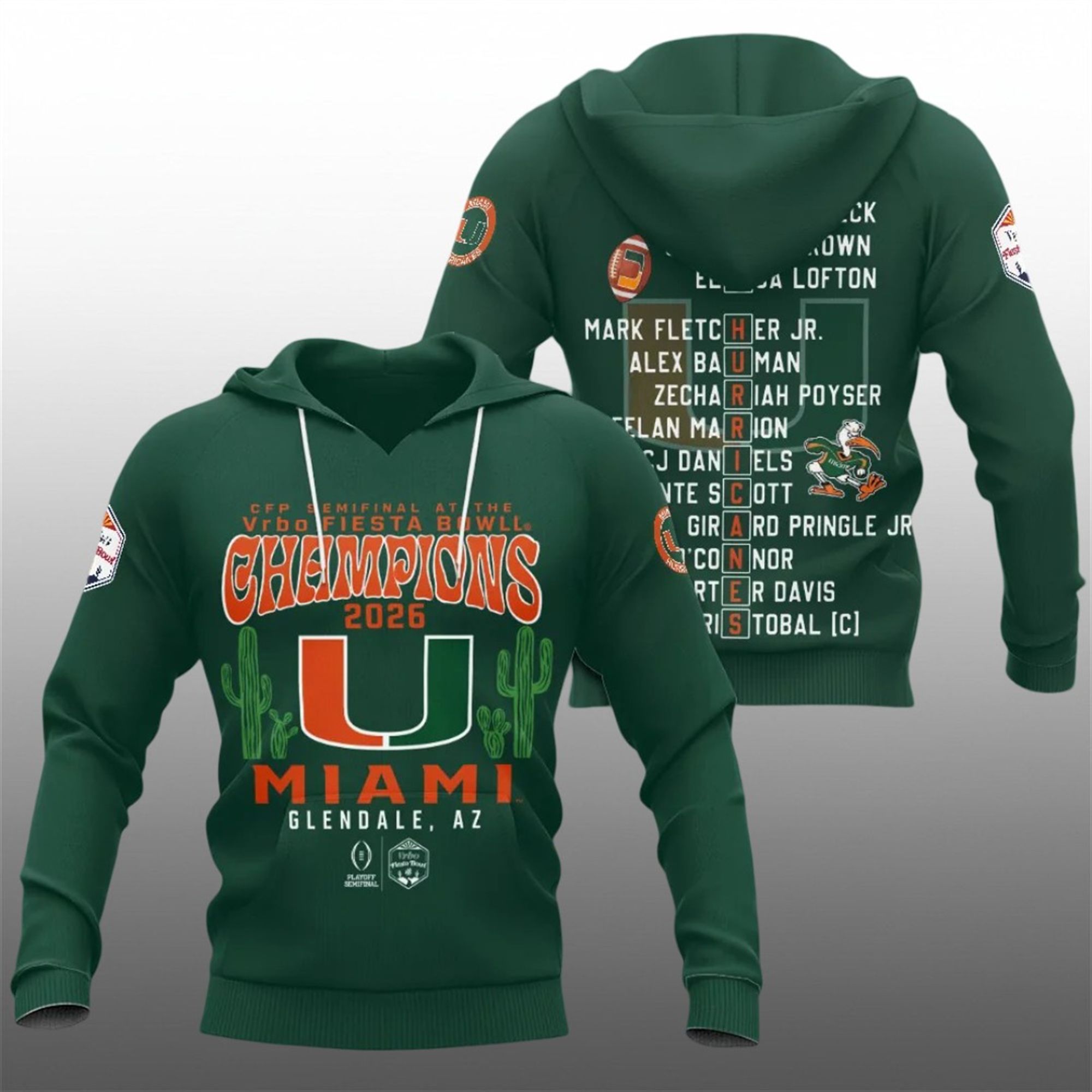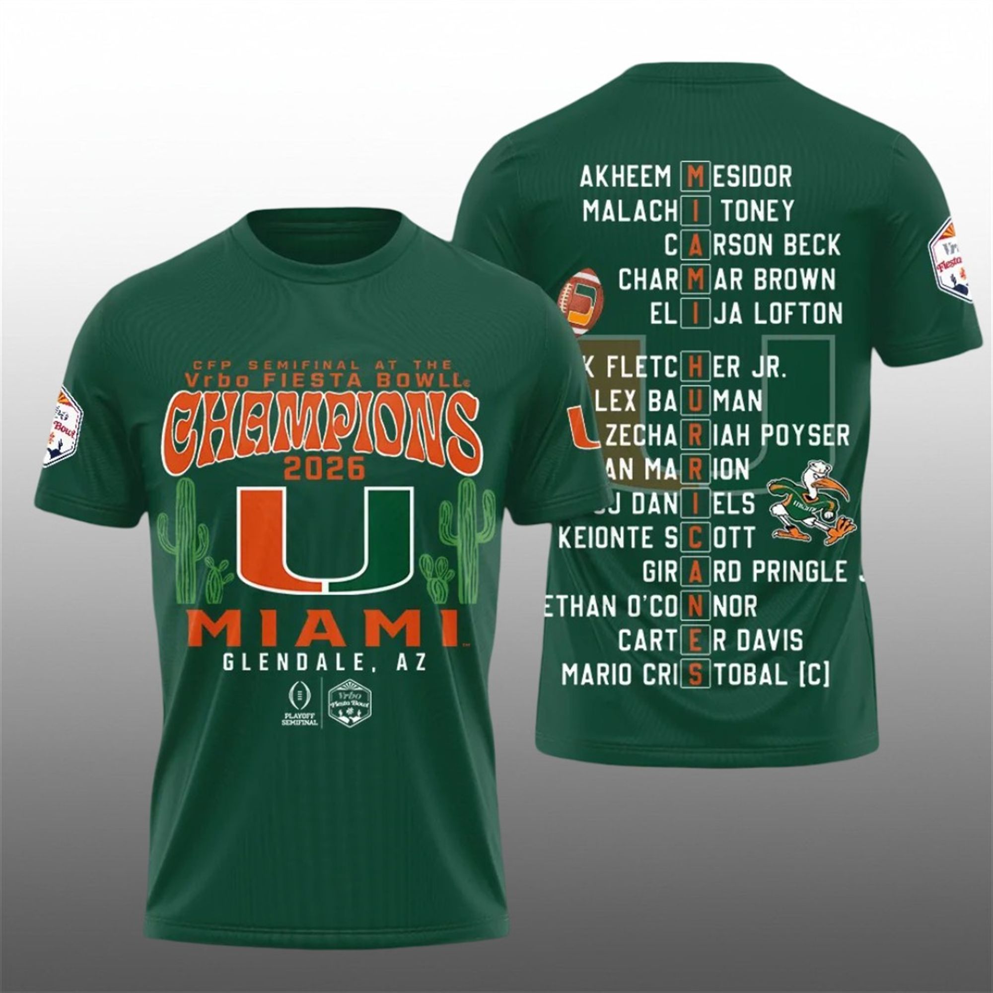 This championship apparel features a dual-sided design that tells the complete story of the Hurricanes’ dominance. The front of the shirt proudly displays the “CFP Semifinal at the Vrbo Fiesta Bowl Champions 2026” insignia, flanked by iconic cactus graphics that pay homage to the Arizona setting of the victory. The bold “MIAMI” lettering and the unmistakable “U” logo sit at the center, instantly commanding attention and asserting conference supremacy.