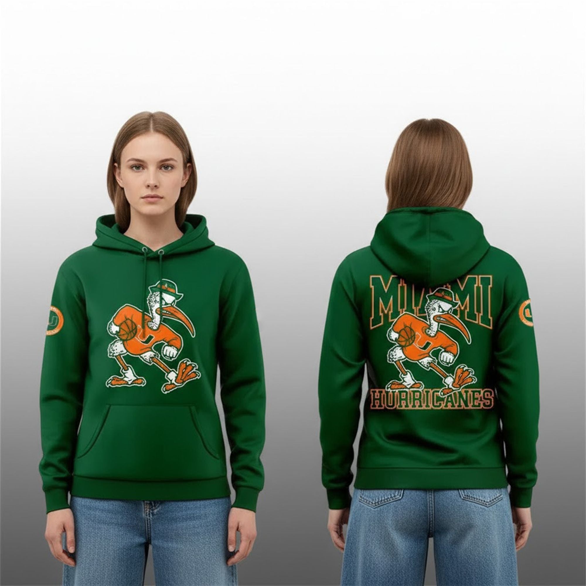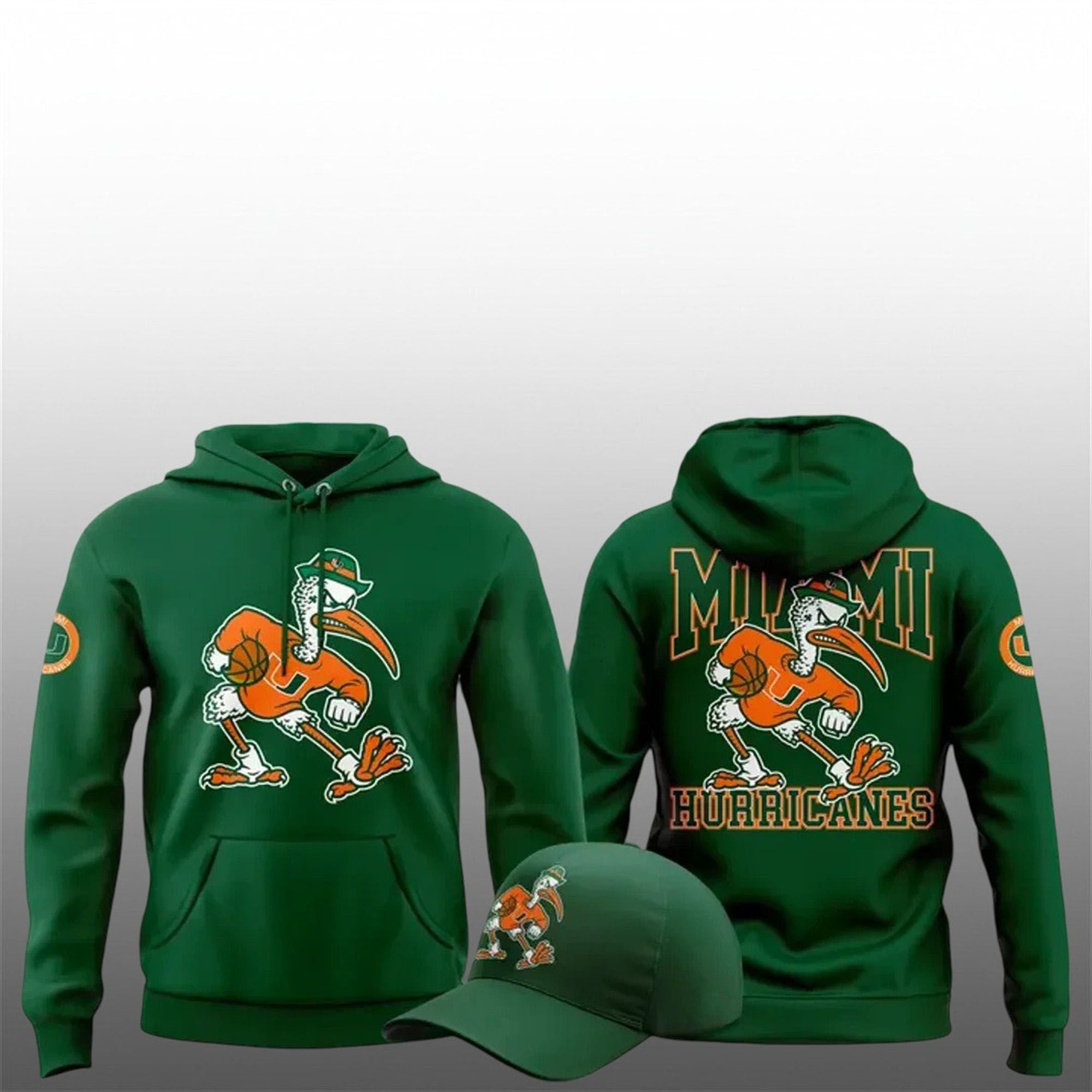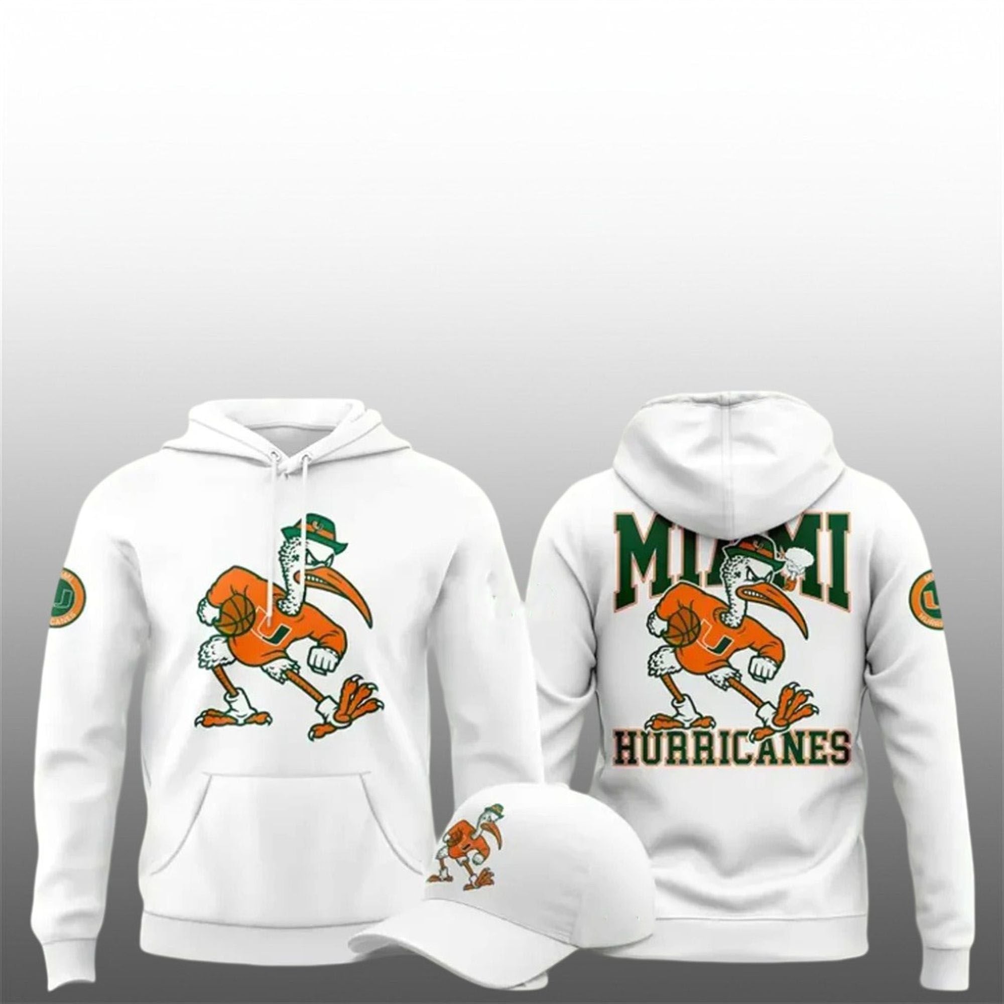 The front of the hoodie features a clean, focused graphic of Sebastian the Ibis, perfectly centered to draw the eye. It captures the mascot in motion, representing momentum and drive. The back of the garment takes the design to the next level with a massive “MIAMI” wordmark arching over the Ibis, anchored by “HURRICANES” in a bold, collegiate font below. This dual-sided design ensures that your fandom is visible from every angle, making it an ideal choice for crowded tailgate parties or busy campus walkways.