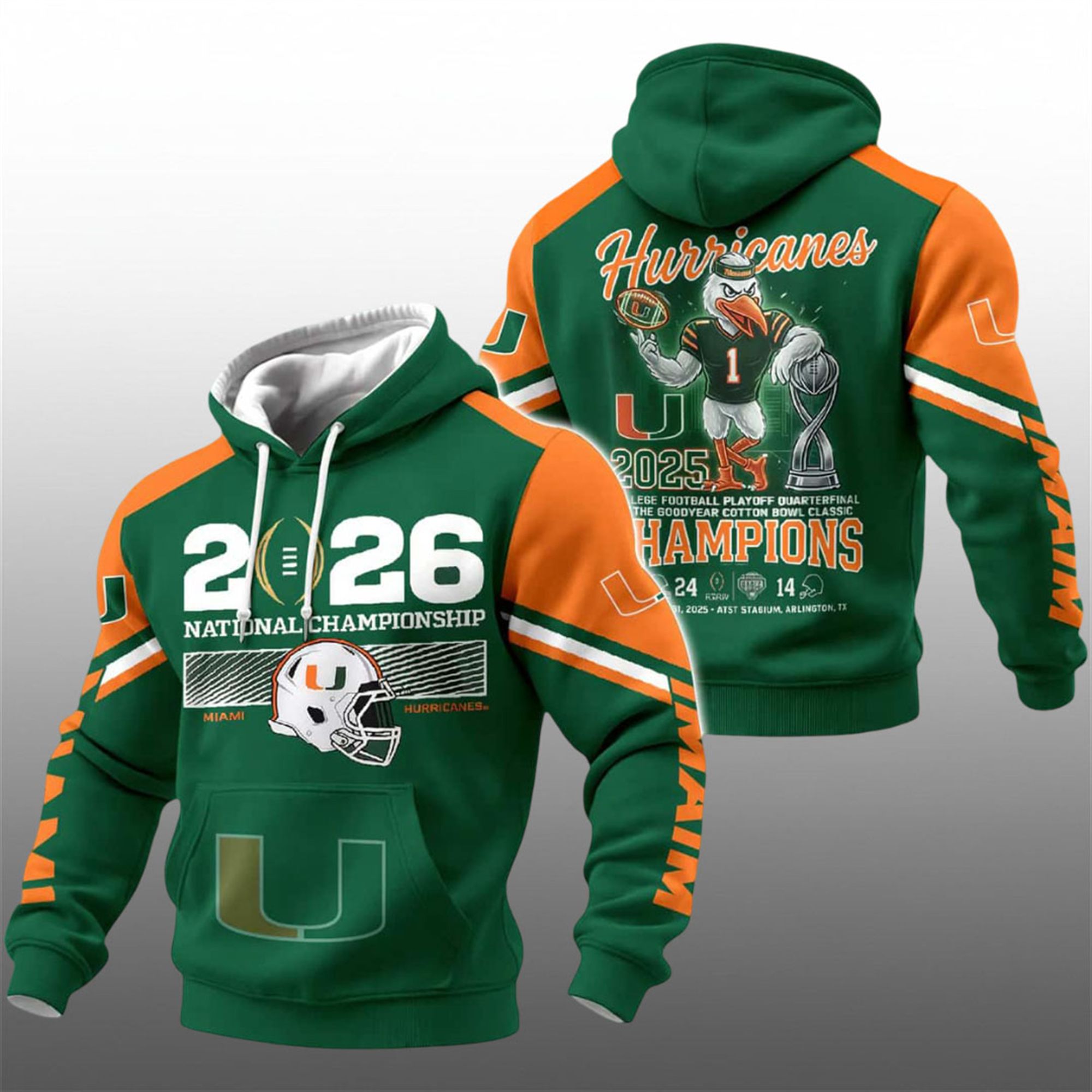 The Miami Hurricanes have reclaimed their spot at the pinnacle of college football, and this 2026 hoodie is the banner under which the fan base unites. This product is distinct in the marketplace because it doesn’t just display a logo; it tells the story of the playoff journey. It bridges the gap between the gritty Quarterfinal win at the Goodyear Cotton Bowl and the glory of the National Title, making it a dual-commemorative piece for collectors.
