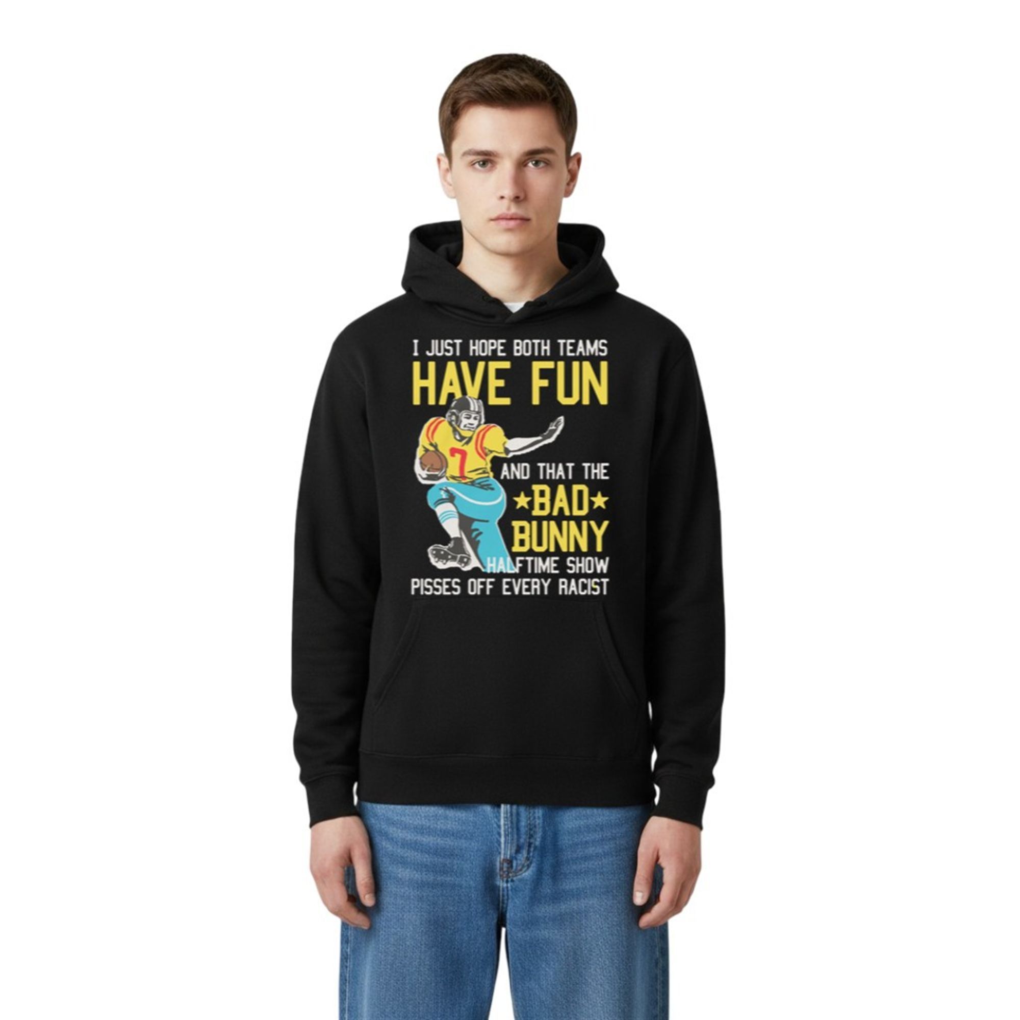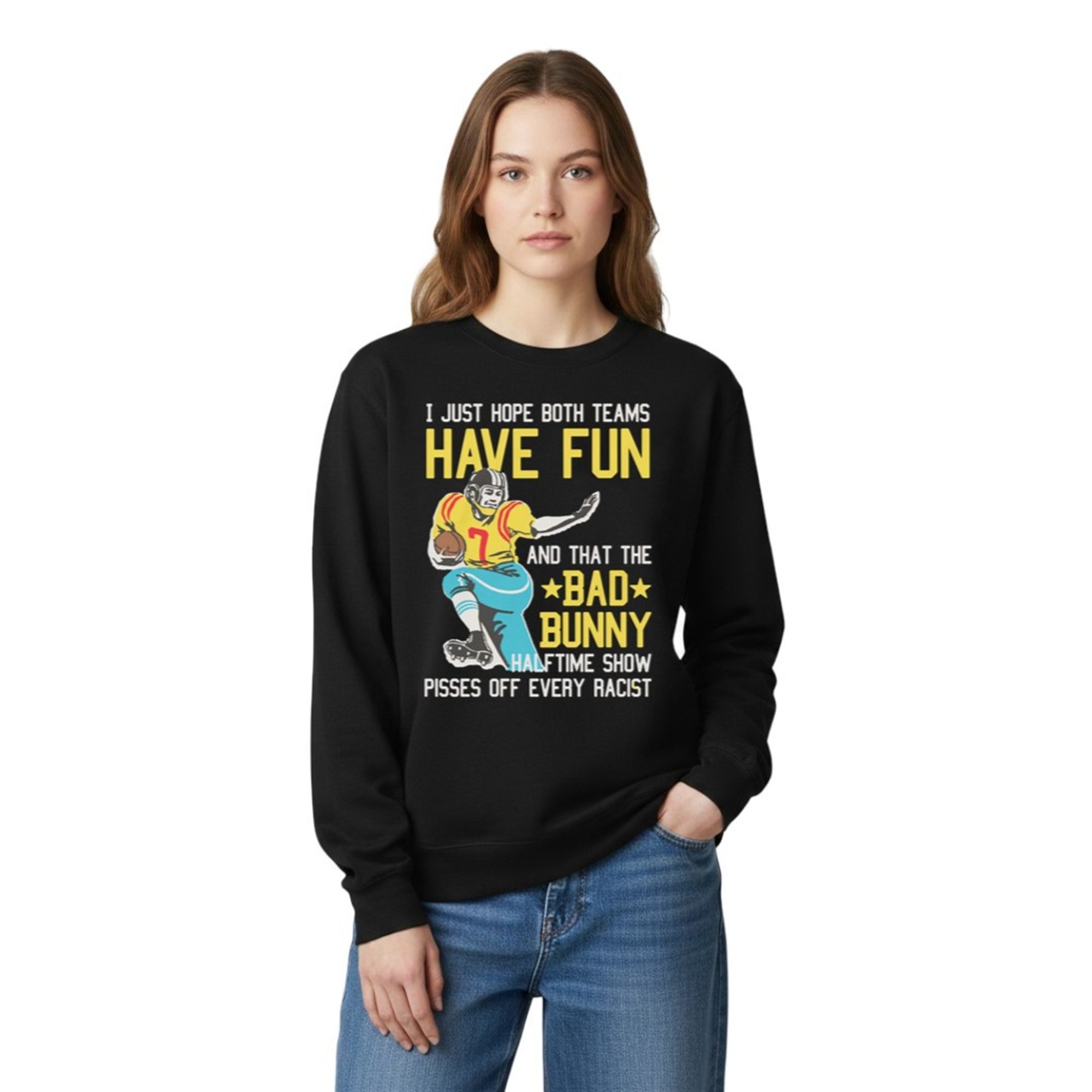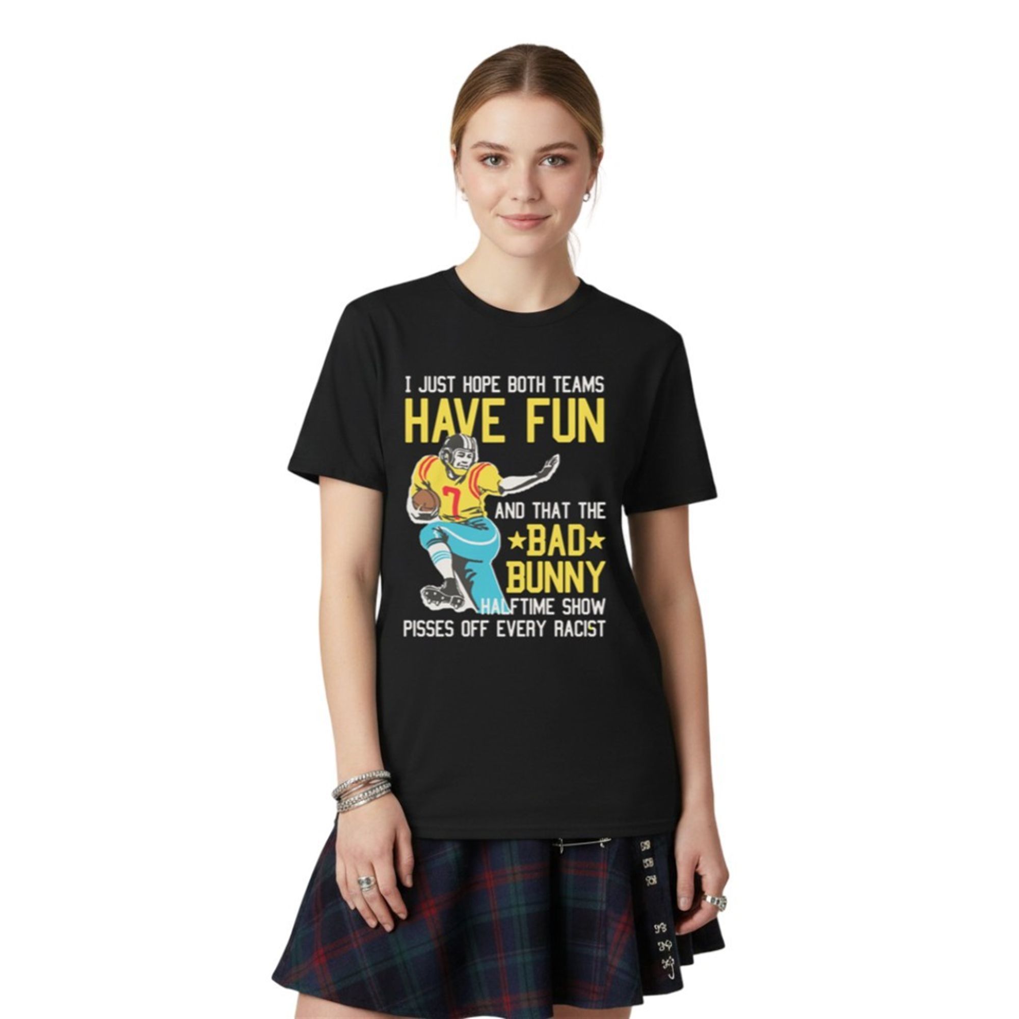 By combining the wholesome, indifferent energy of “I just hope both teams have fun” with the sharp, specific support for Bad Bunny and a direct call-out against racism, this item transcends traditional sports merchandise. It turns a standard Sunday watch party into a platform for personal expression. It’s not just a garment; it is a banner for those who celebrate diversity in spaces that have historically struggled with it.