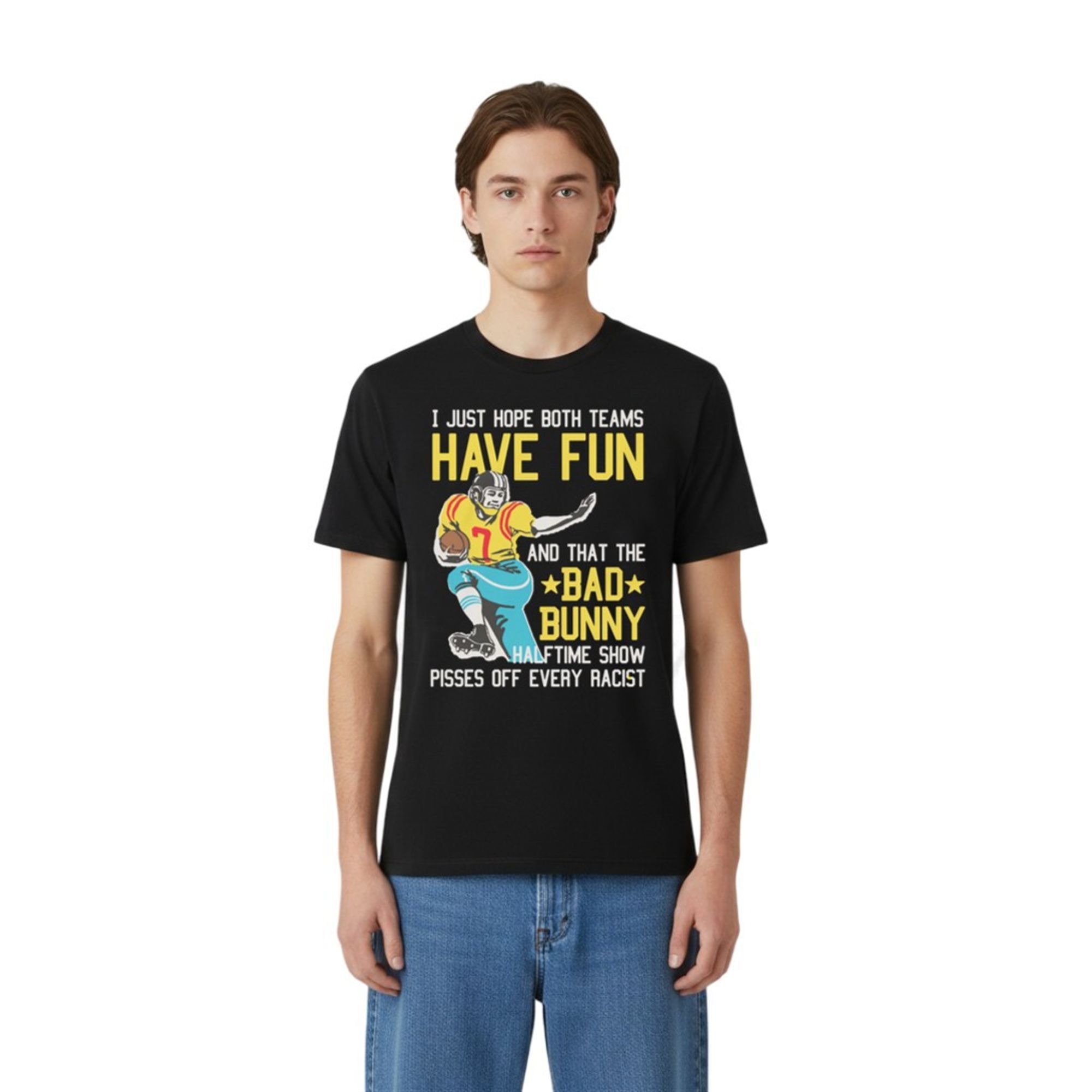 This specific design exploded in popularity because it perfectly captures the specific intersection of Gen Z humor and modern political awareness. It juxtaposes the innocent, meme-famous phrase “I just hope both teams have fun” with a sudden, aggressive defense of Bad Bunny and a strike against racism. This unexpected pivot from “wholesome” to “politically charged” creates a comedic whiplash that resonates deeply on social media algorithms, driving shares and engagement from people who feel represented by its unapologetic message.