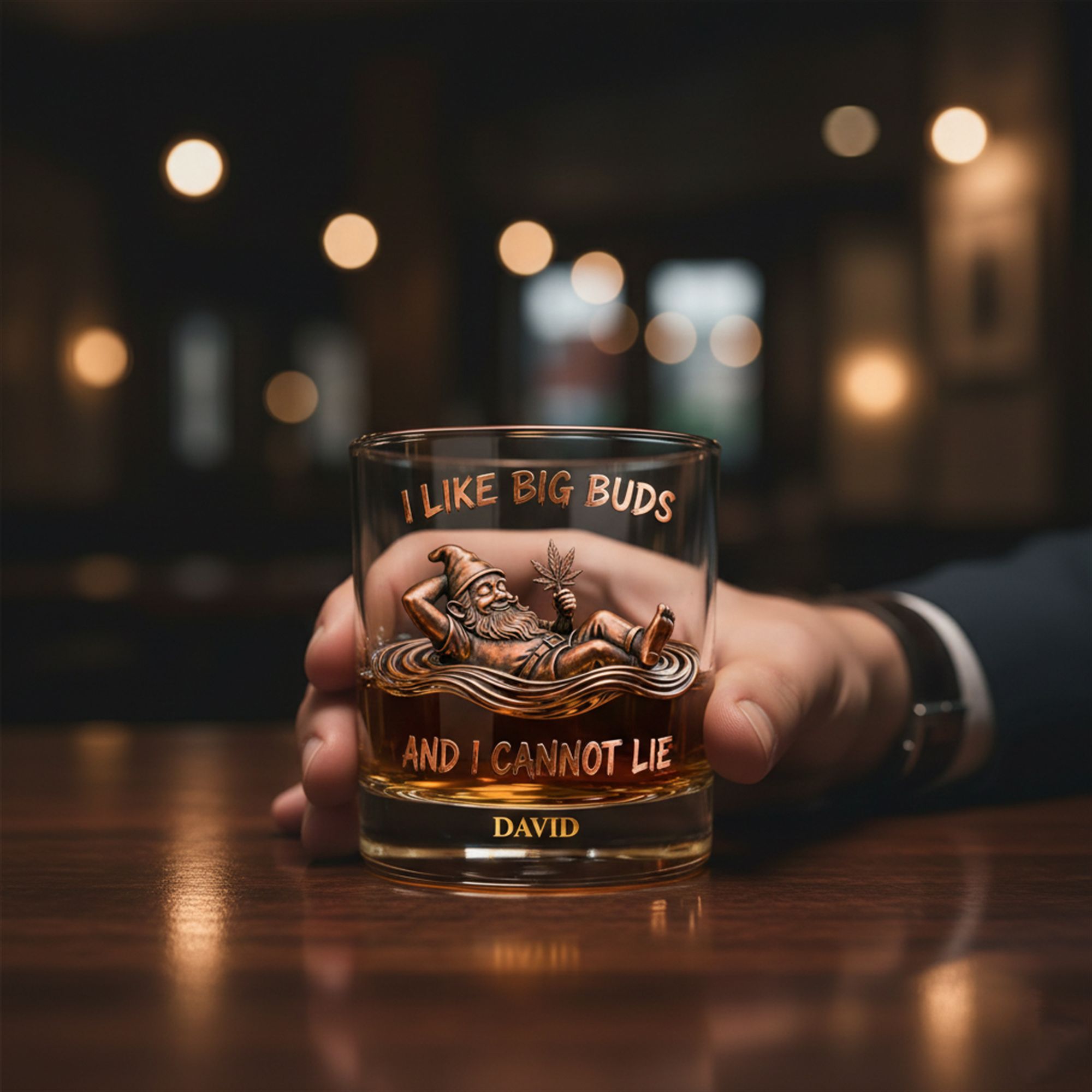 The typography is bold and unmistakable, declaring “I LIKE BIG BUDS AND I CANNOT LIE”—a pun that instantly resonates with anyone familiar with pop culture history. Below the artwork, the glass offers a dedicated space for personalization, allowing you to etch a name (like “DAVID” in the example) to claim the throne of the “King of Chill.” It is designed not just to hold a drink, but to set a mood.