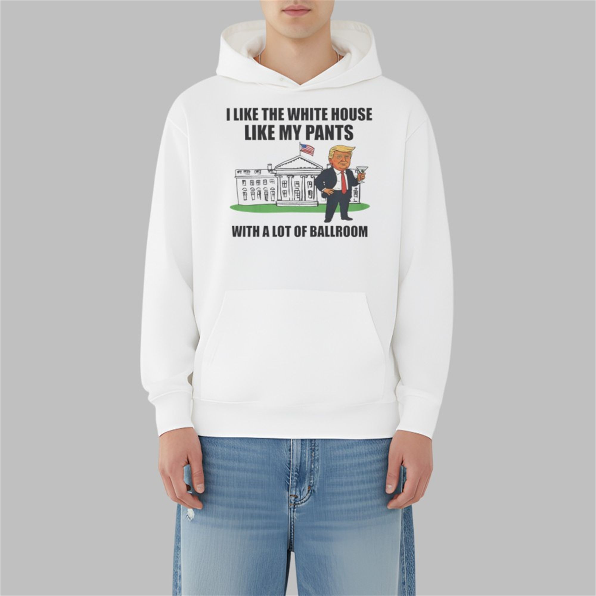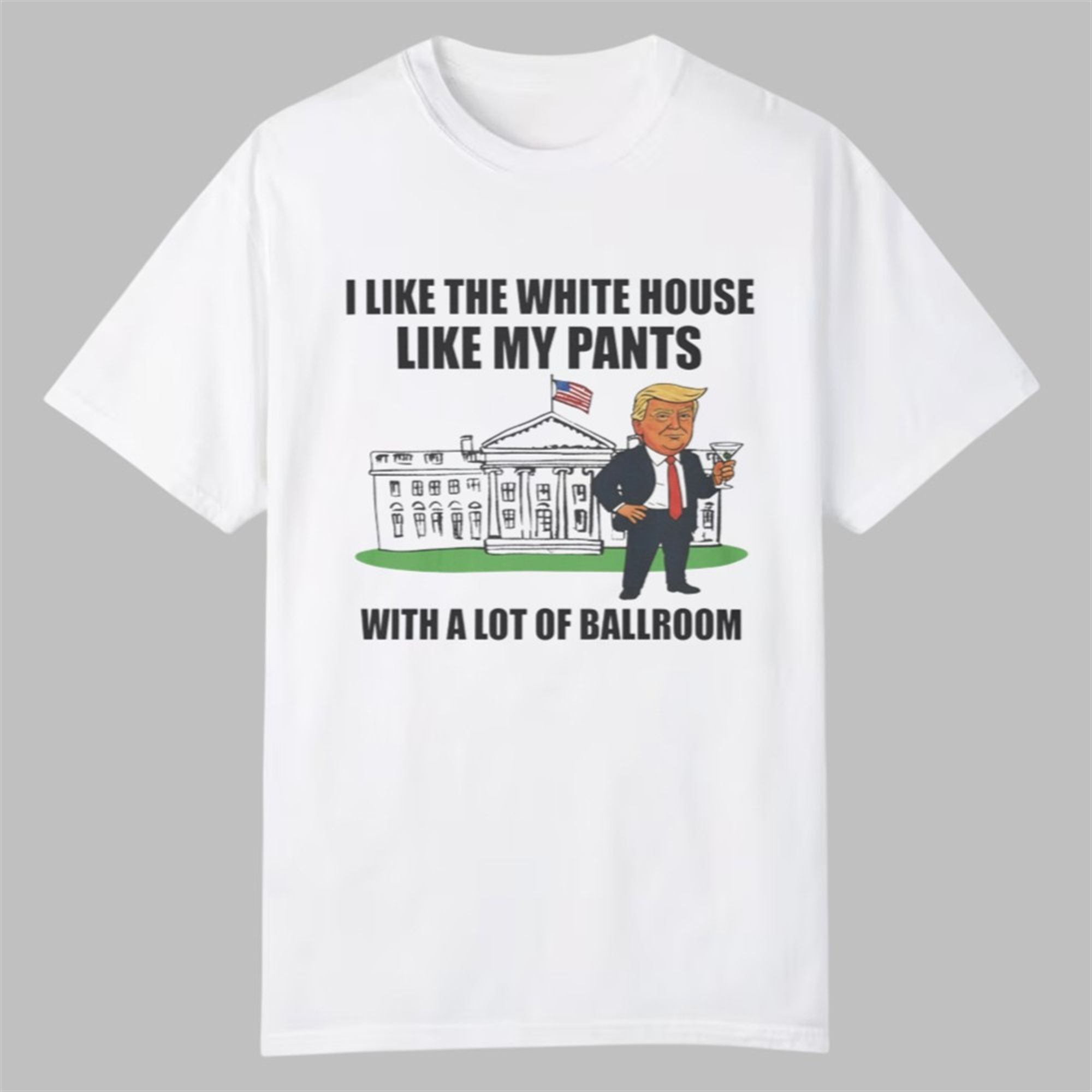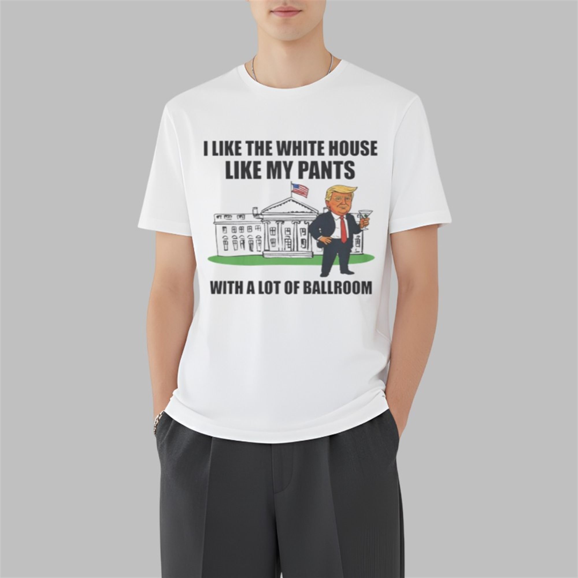The shirt features a high-quality, full-color graphic of a cartoon Donald Trump standing confidently in front of the White House. Paired with this image is the unmissable, bold text: “I LIKE THE WHITE HOUSE LIKE MY PANTS… WITH A LOT OF BALLROOM.”