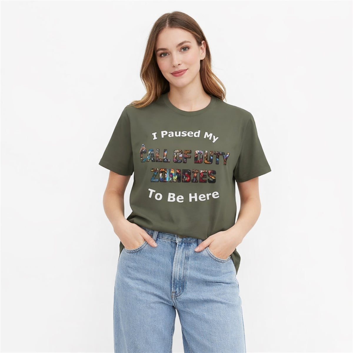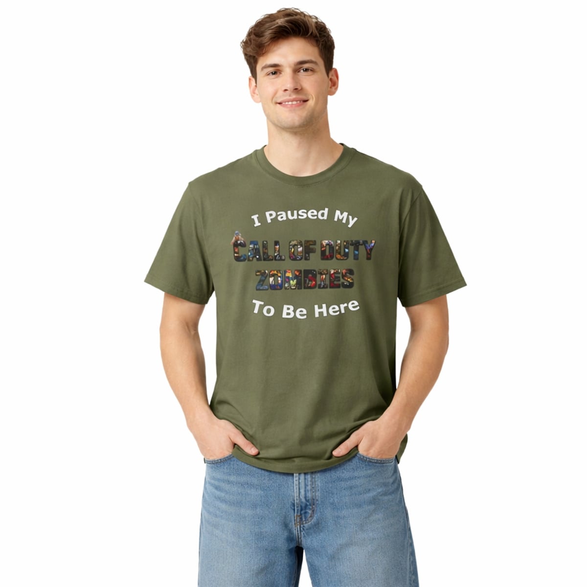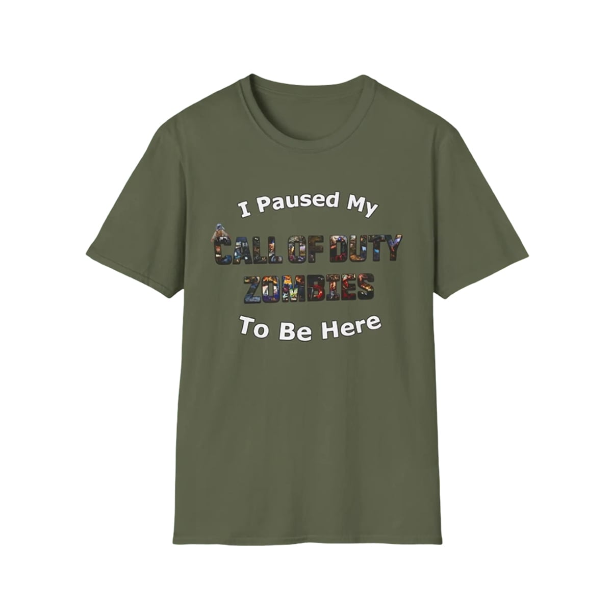 This shirt features a rich, earthy olive-green backdrop that makes its central graphic pop. The text “I Paused My” and “To Be Here” is displayed in a clean, bold, white comic-style font, framing the centerpiece. The true focal point is the phrase “CALL OF DUTY ZOMBIES,” which is ingeniously designed using a text-masking technique. Instead of solid colors, the letters themselves act as windows into an epic, chaotic collage of iconic, action-packed moments from the beloved survival game mode. It is a visually dynamic piece of streetwear that boldly broadcasts your favorite digital pastime to the world.