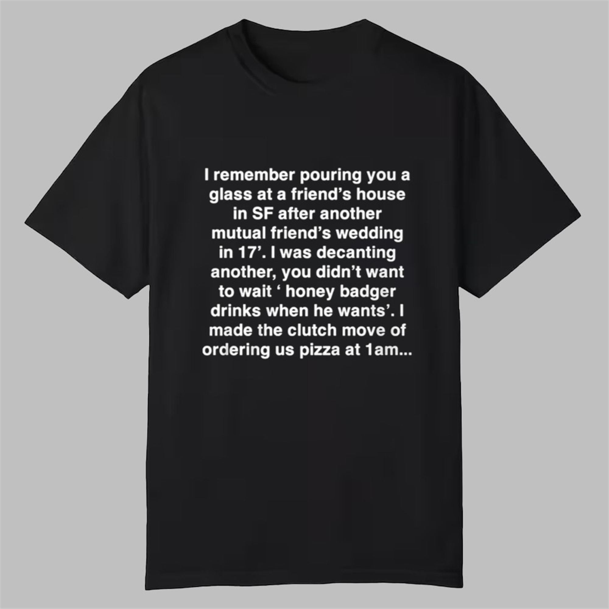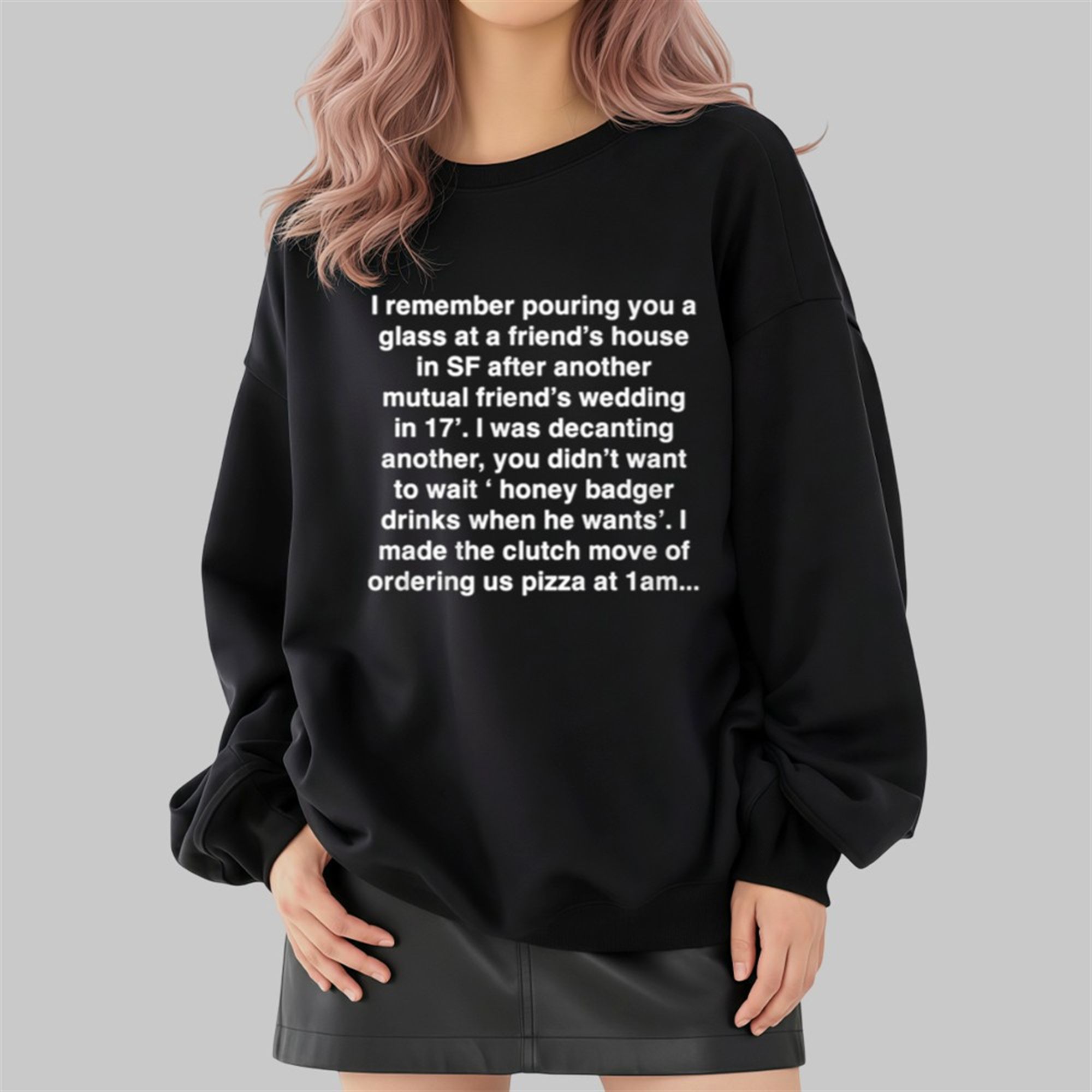 In an era where fashion intersects with viral internet text, the shirt stands out as a masterpiece of context-free comedy. This isn’t just a graphic tee; it is a piece of wearable lore. The text—a long, rambling paragraph about a specific night in San Francisco involving wine decanting, a “Honey Badger” nickname, and a heroic pizza order—plays perfectly into the current trend of “oversharing” aesthetic. It mimics the style of a cringe-worthy LinkedIn post or a humble-brag tweet, making it an ironic staple for anyone who loves to poke fun at social media main characters.