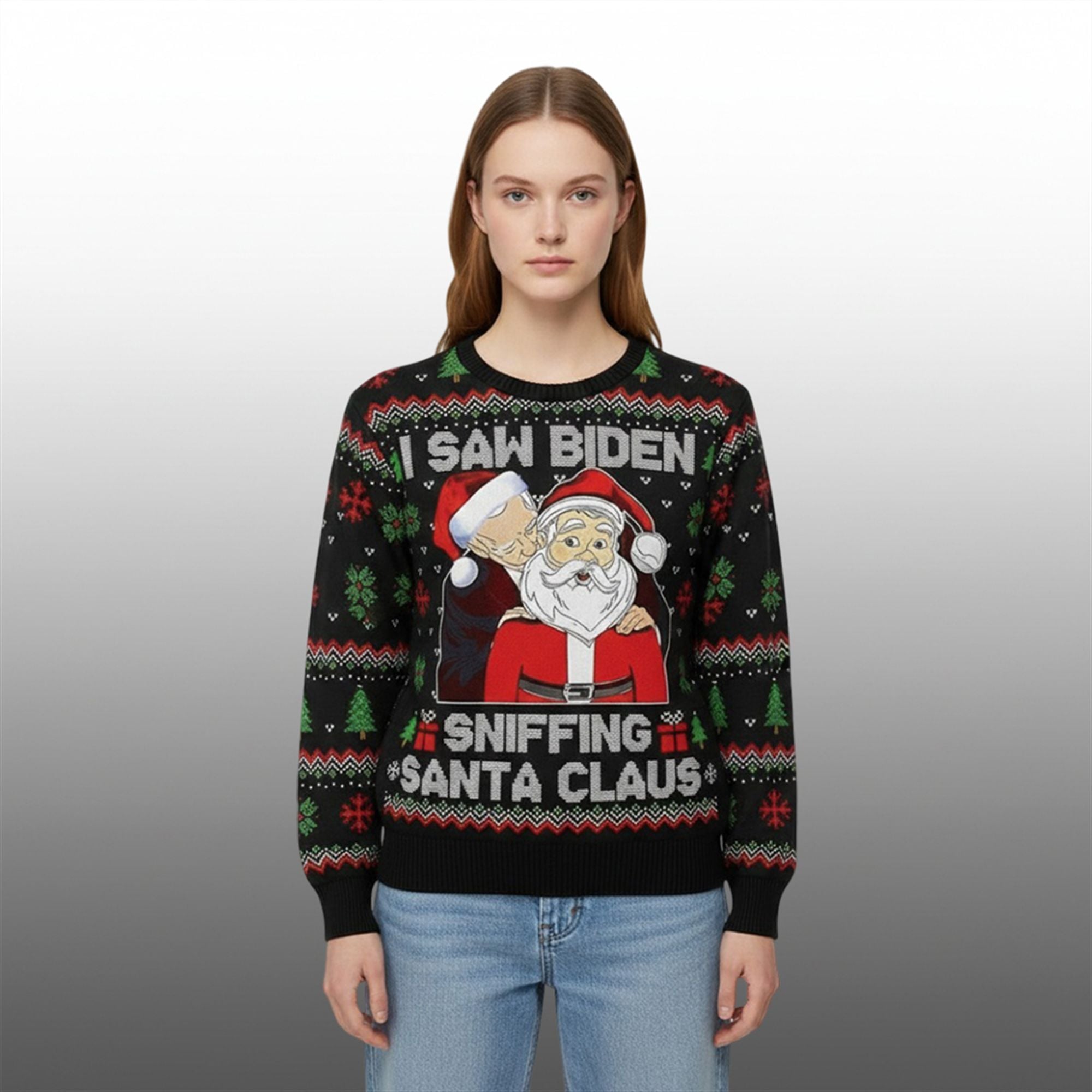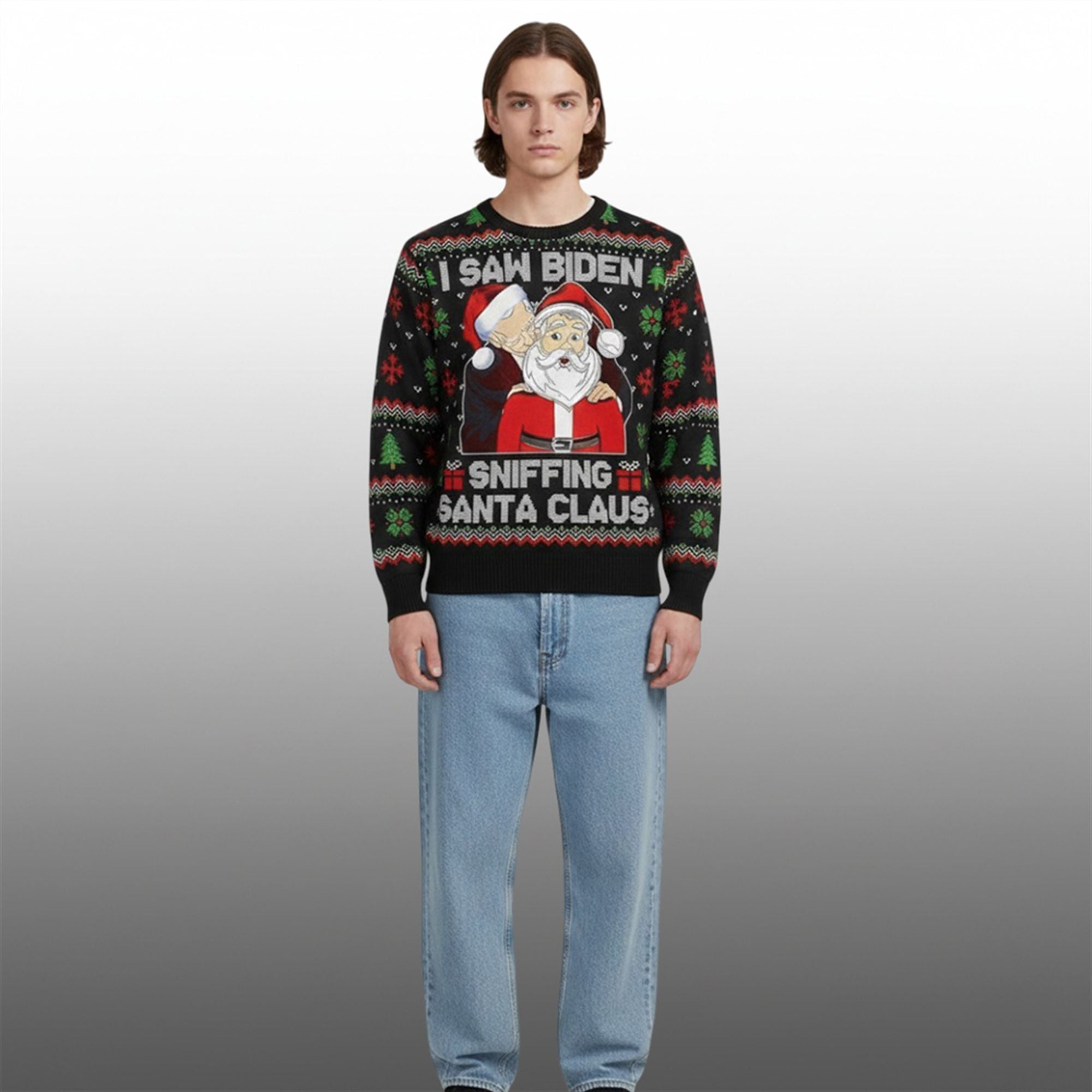 The sweater is not just a piece of clothing; it is a conversation starter designed for the modern holiday season. This crewneck sweatshirt features a high-definition, faux-knit print that mimics the look of traditional Fair Isle wool sweaters without the itchiness. The design is centered around a satirical cartoon illustration of President Joe Biden standing behind Santa Claus, playfully referencing the viral “sniffing” memes that have circulated online.