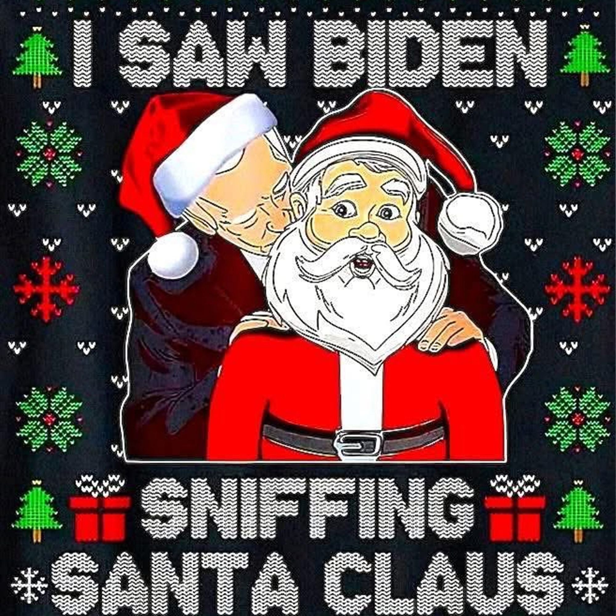 Surrounding the central image are classic festive elements, including pixelated Christmas trees, snowflakes, and geometric borders in vibrant red, green, and white hues against a sleek black background. The text “I SAW BIDEN SNIFFING SANTA CLAUS” is displayed in a bold, knit-style font, ensuring the punchline is visible from across the room.