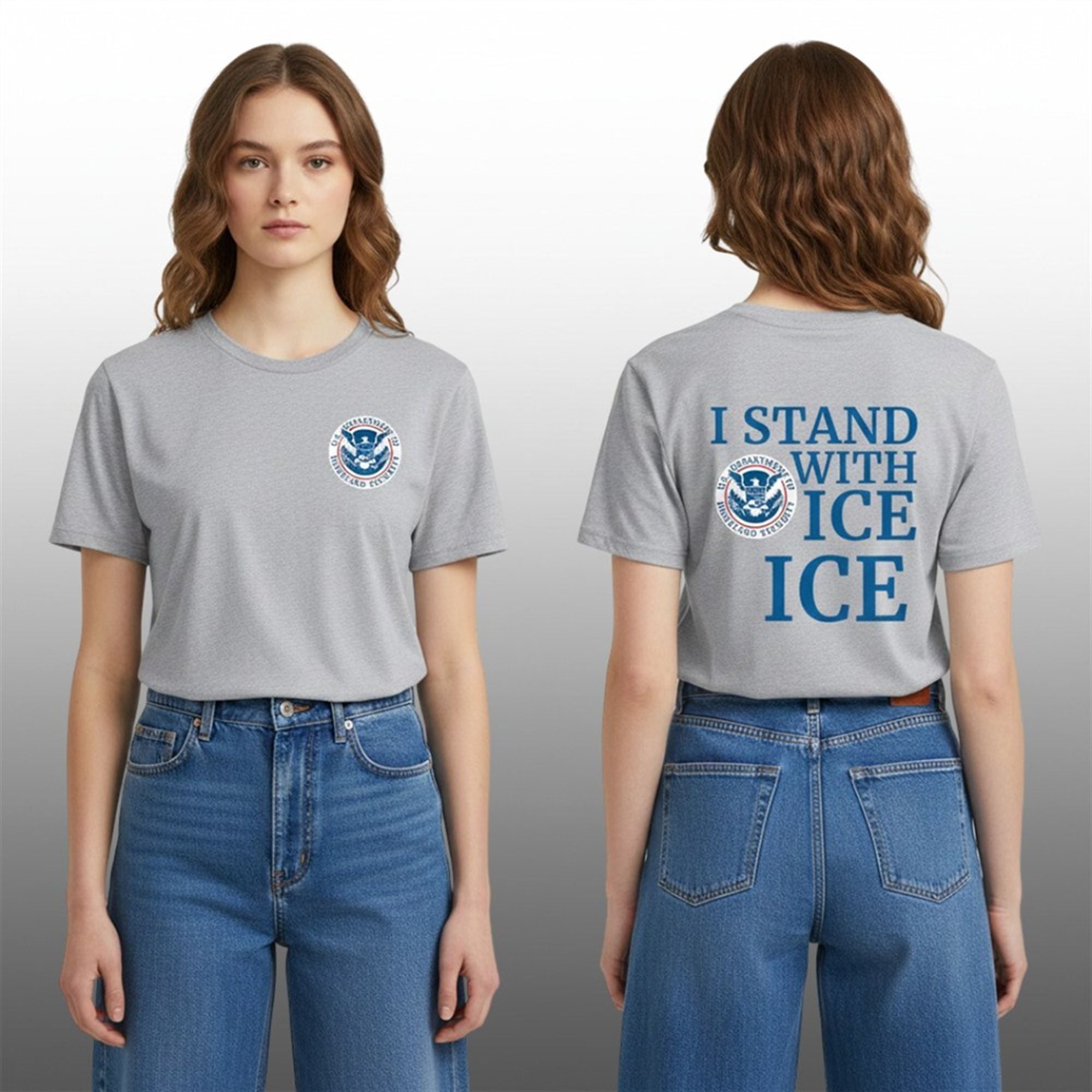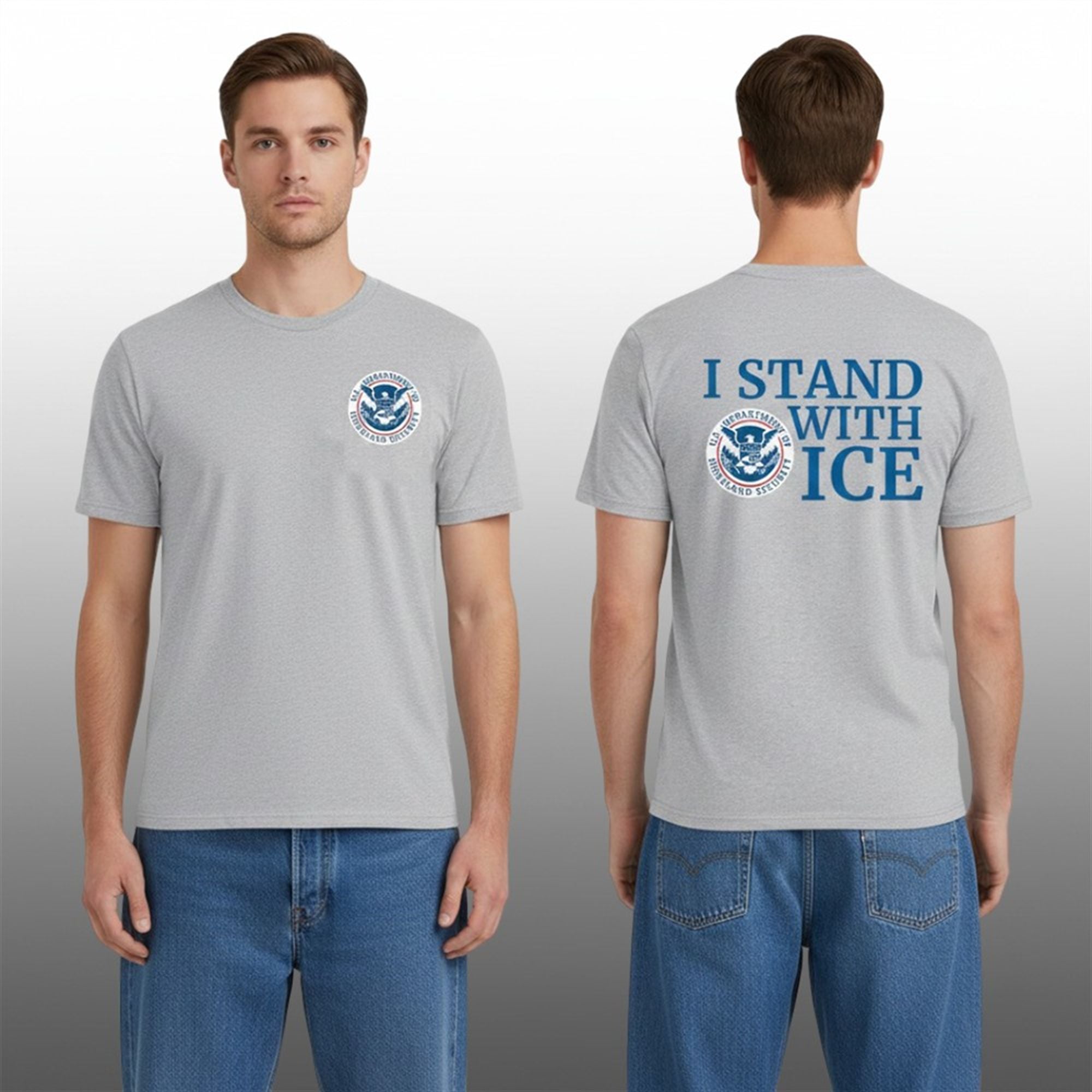 The shirt is a piece of statement apparel designed to bridge the gap between citizens and federal law enforcement. The design features the style Department of Homeland Security (DHS) seal, instantly recognizable with its eagle and shield motif. On the back, the bold text “I STAND WITH ICE” dominates the visual space, ensuring the message is legible even from a distance.