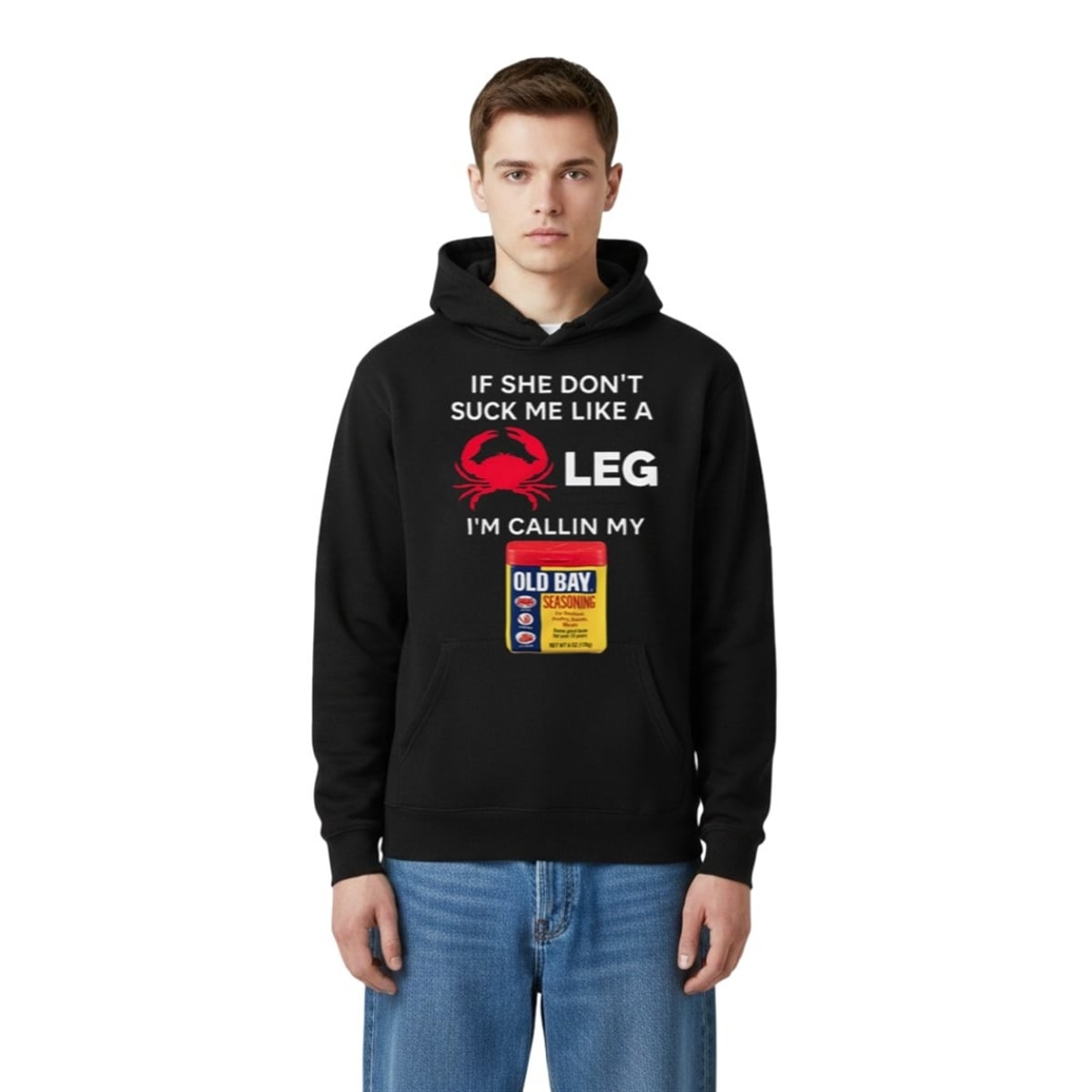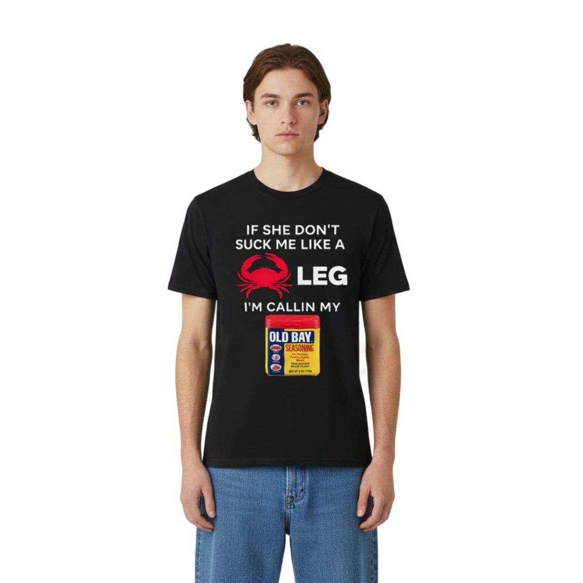 This graphic tee presents a striking visual layout centered around high-contrast, bold typography and integrated imagery. The design features a stark black background that allows the vibrant red and white elements to pop instantly. The text “IF SHE DON’T SUCK ME LIKE A” sits cleanly at the top, leading directly into a bright red graphic of a crab positioned next to the word “LEG”. The punchline concludes with “I’M CALLIN MY” followed by a highly recognizable graphic of a famous yellow and red seafood seasoning tin, replacing the final word of the sentence. The layout is meticulously balanced, ensuring that the visual substitution reads smoothly like a sentence, creating a perfect comedic timing that observers can decode at a glance.