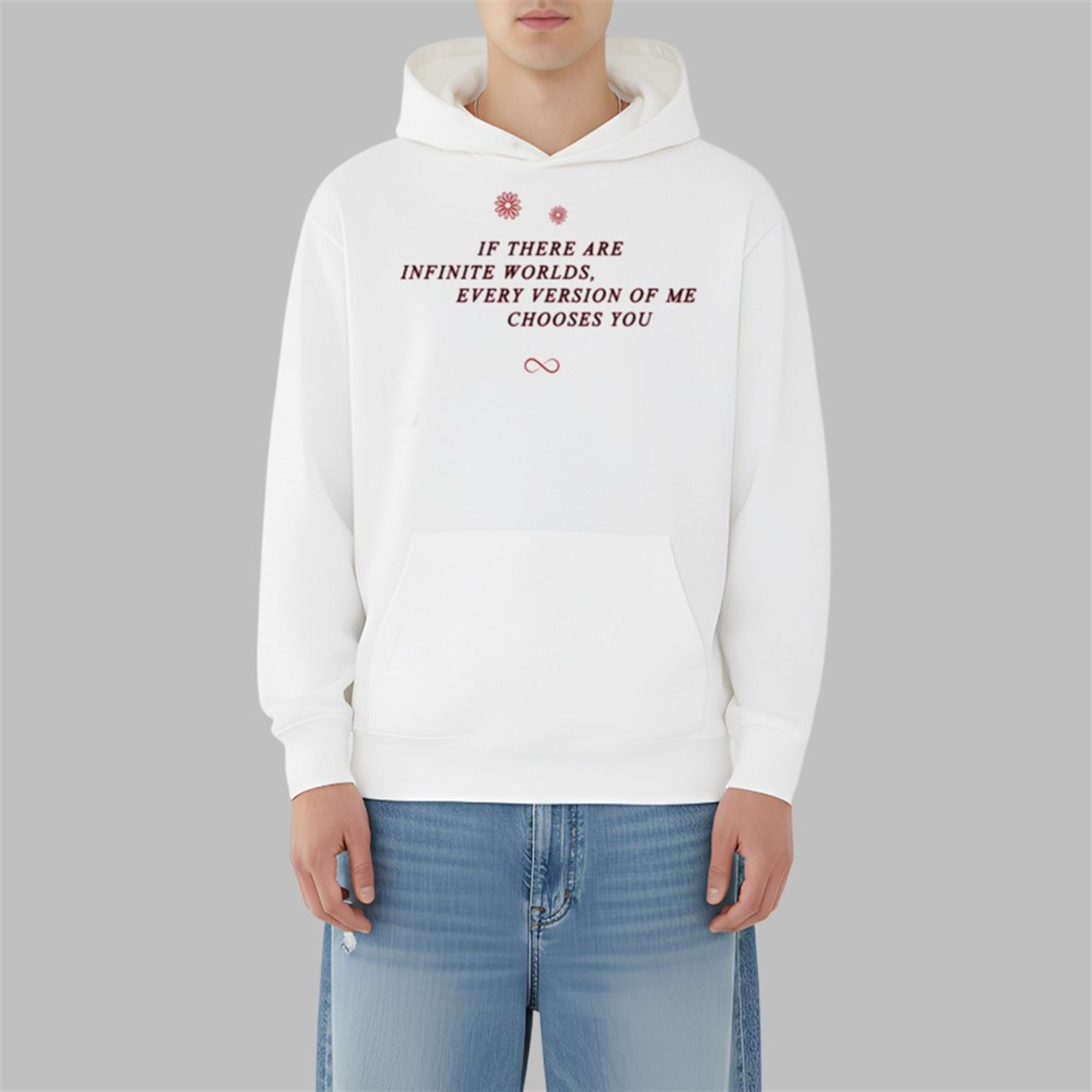 The design is anchored by a delicate infinity symbol ($\infty$), representing a love without beginning or end. Above the text “If There Are Infinite Worlds, Every Version of Me Chooses You”, two subtle flower motifs add a touch of organic softness to the design. The quote itself is a powerful affirmation of loyalty and fate. It suggests that no matter how many timelines, alternate realities, or “what-ifs” exist, your choice of partner would remain exactly the same. It is a modern, poetic take on the concept of “soulmates.”