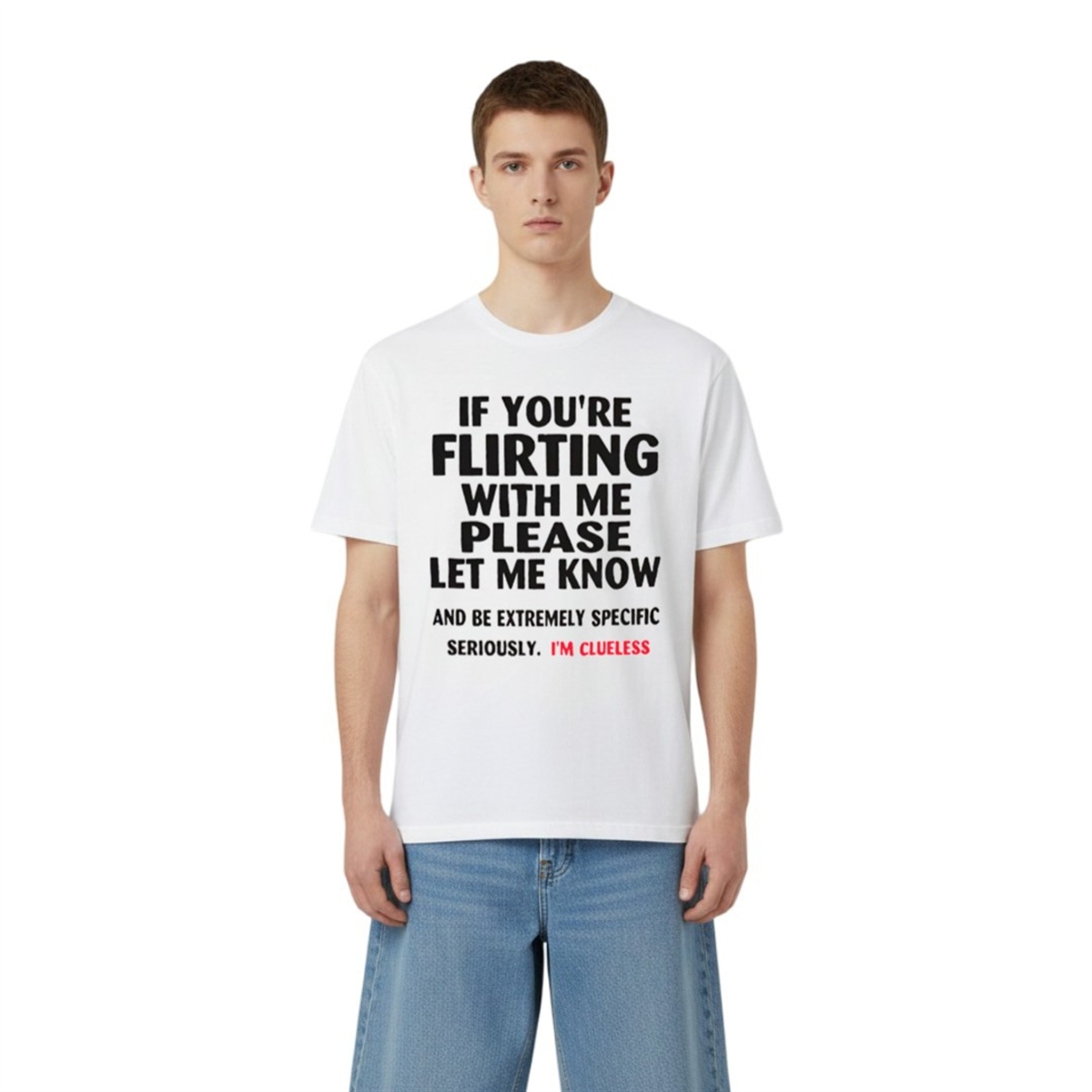 In an era where digital communication has made face-to-face interactions feel more complicated than ever, this shirt serves as a refreshing dose of reality. The bold, unmistakable typography reads: “IF YOU’RE FLIRTING WITH ME PLEASE LET ME KNOW AND BE EXTREMELY SPECIFIC. SERIOUSLY. I’M CLUELESS.” It is not just an item of clothing; it is a wearable public service announcement. Designed for those who appreciate humor and transparency, this product turns an internal social anxiety—the fear of misinterpreting someone’s kindness for romantic interest—into an external, confident joke. It perfectly aligns with the 2026 social trend of radical authenticity, making it a highly searchable and highly giftable lifestyle accessory.