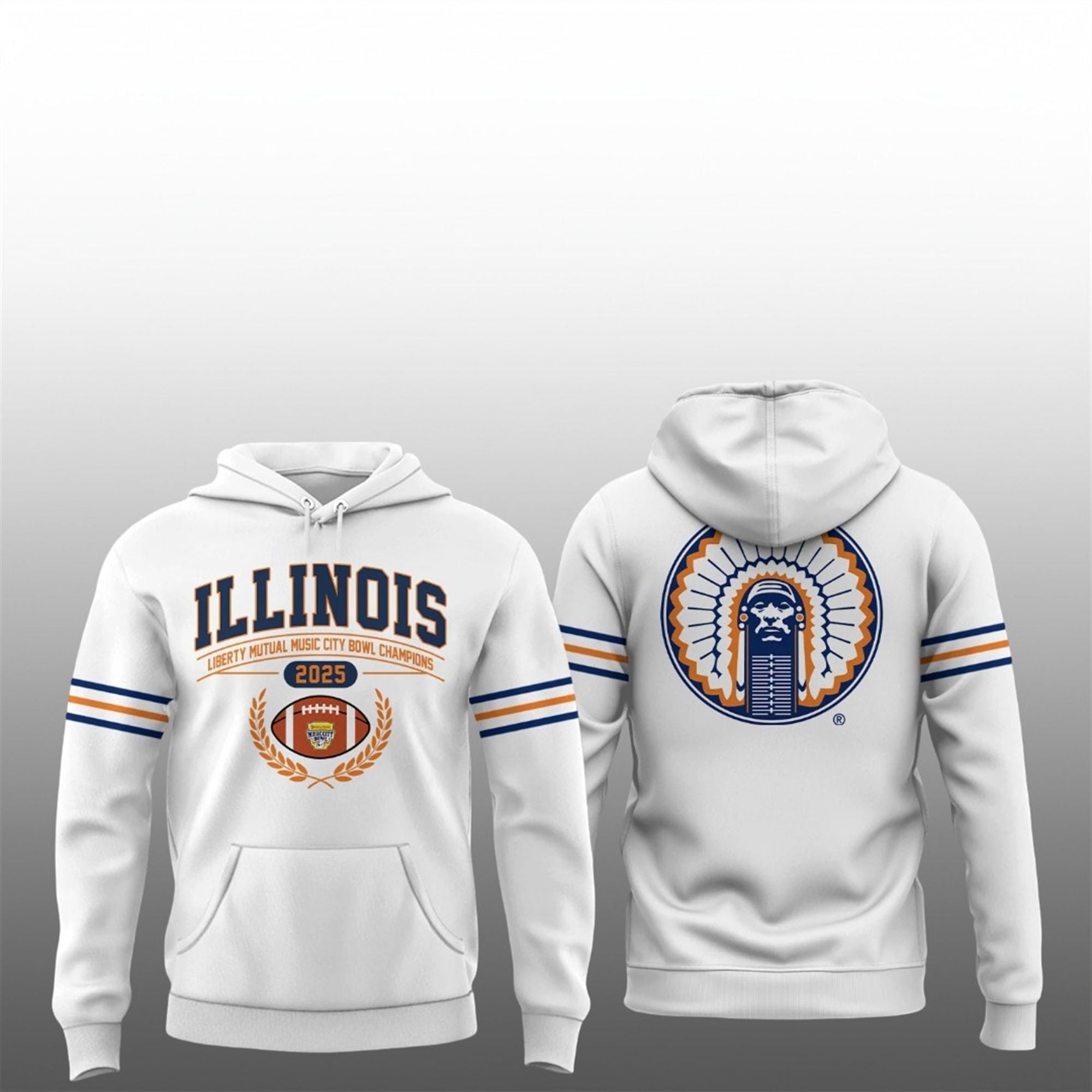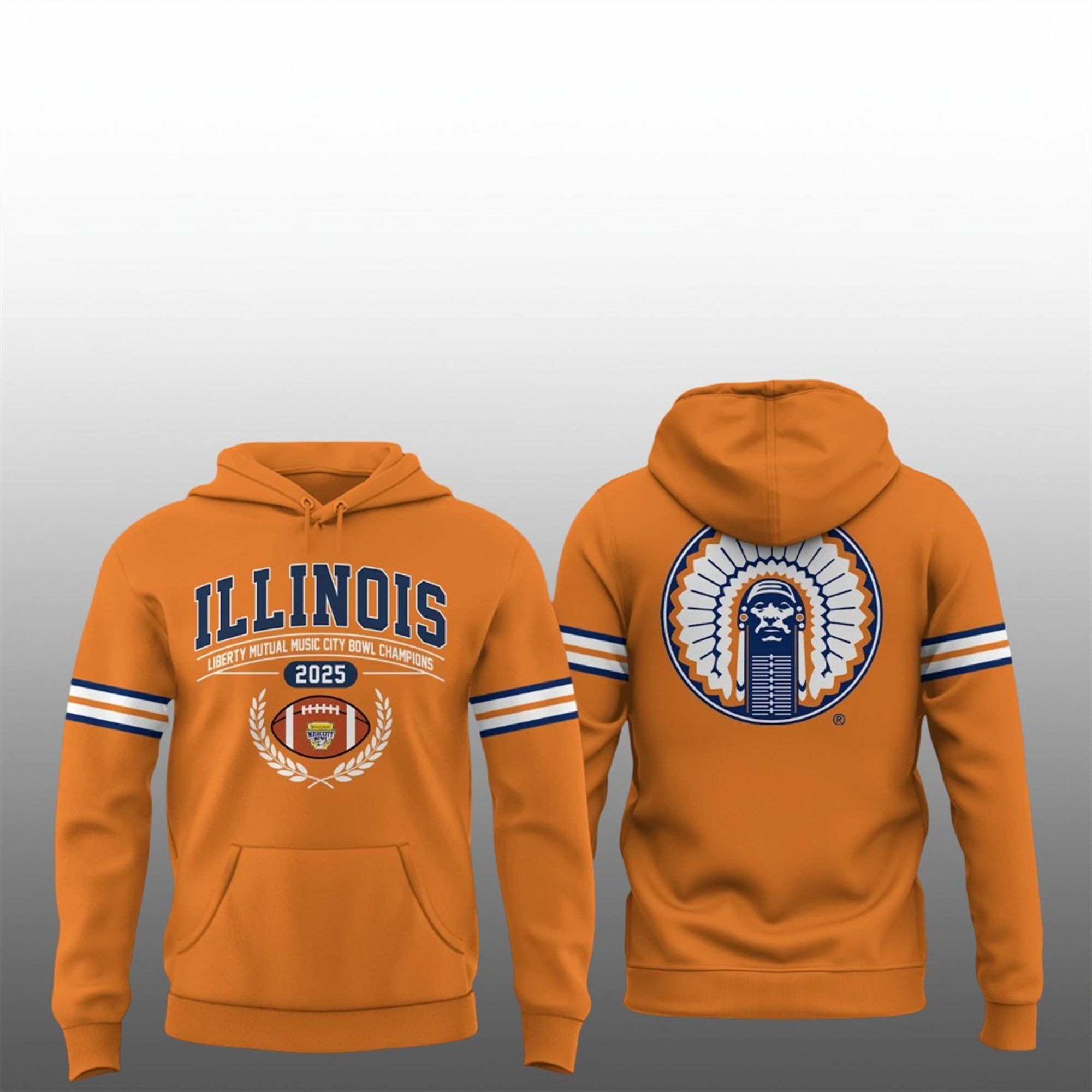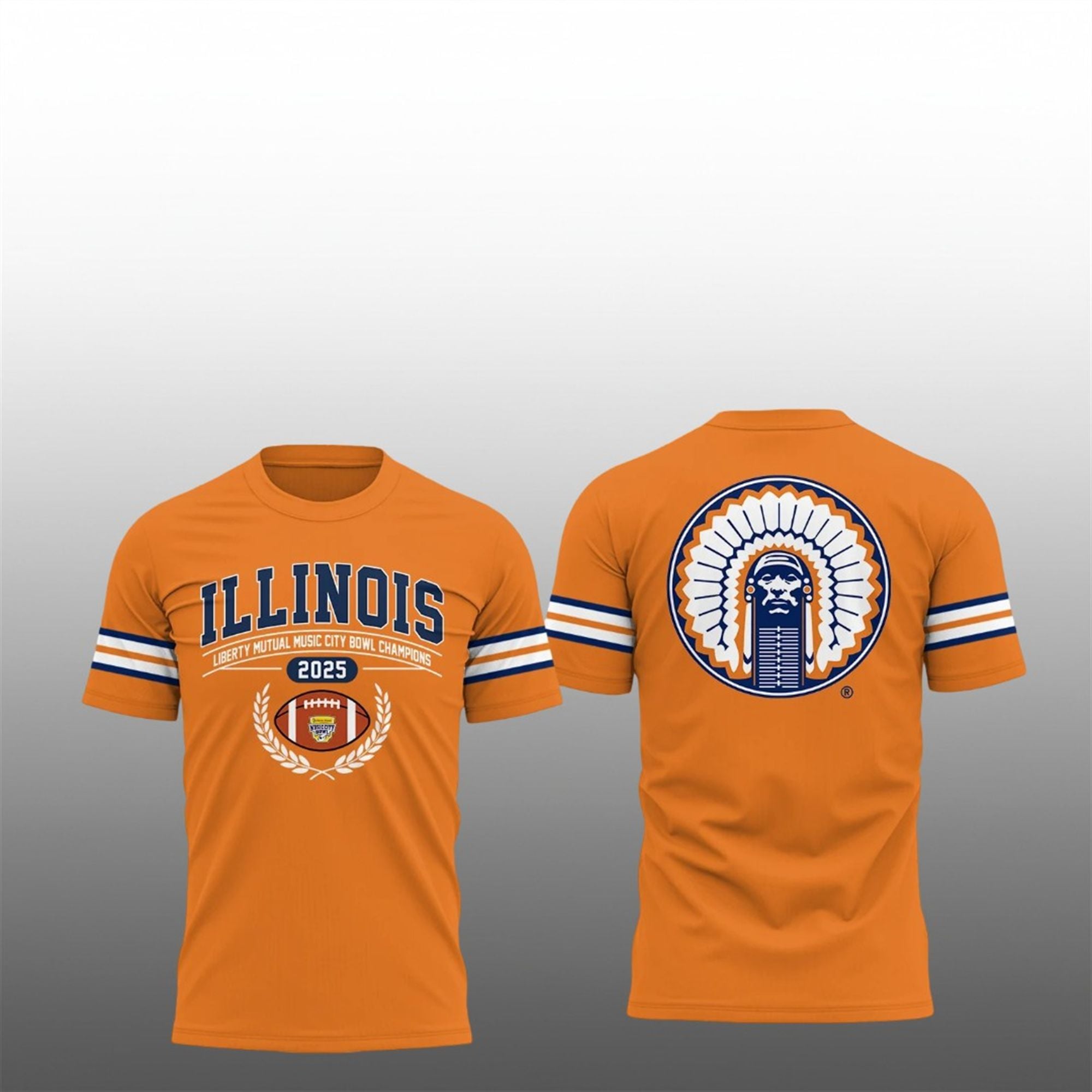 Championship Front: The chest features bold “ILLINOIS” block lettering above the “Liberty Mutual Music City Bowl Champions” text, anchored by a commemorative football graphic encased in laurels. The “2025” dateline ensures everyone knows exactly which historic victory you represent.