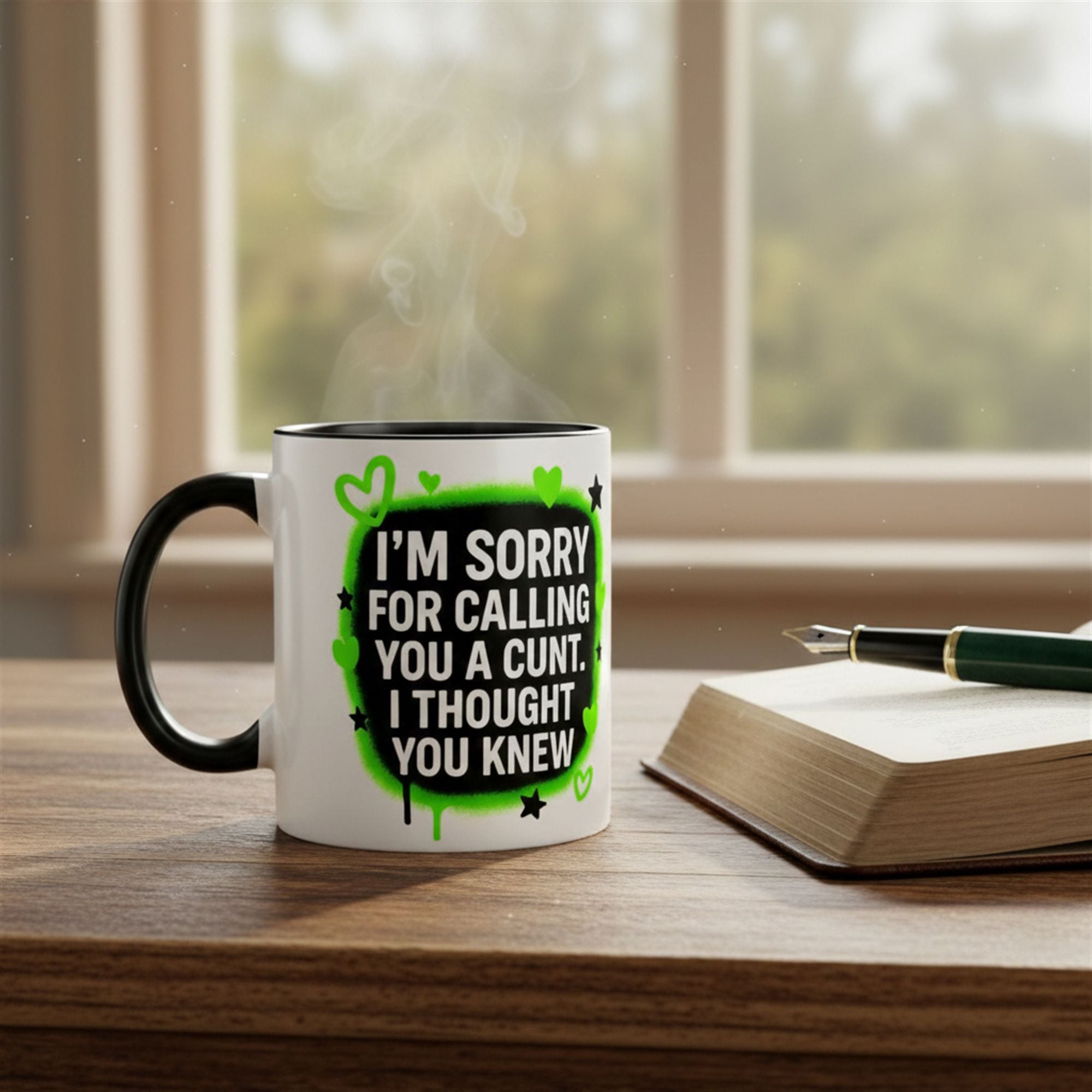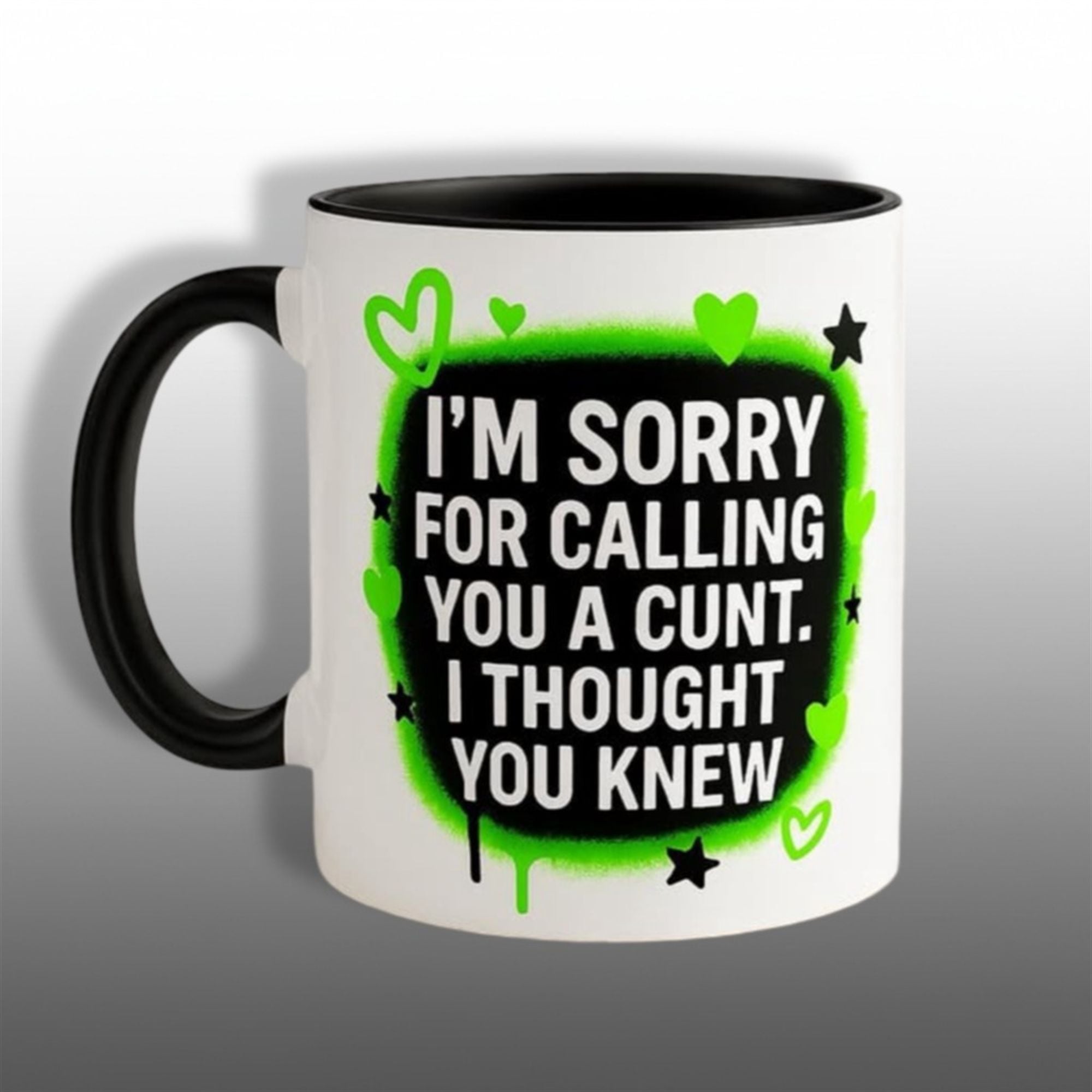 This isn’t just a coffee cup; it’s a conversation starter (and potentially a conversation ender). The design features a high-contrast aesthetic, utilizing a deep black handle and rim that frames the main event: a vibrant, neon lime green spray-paint splash. Inside the graffiti cloud sits the punchline in bold, distressed white lettering: “I’m Sorry For Calling You A Cunt. I Thought You Knew.”