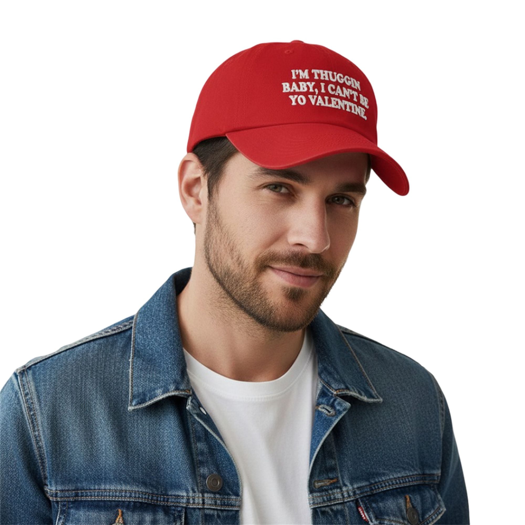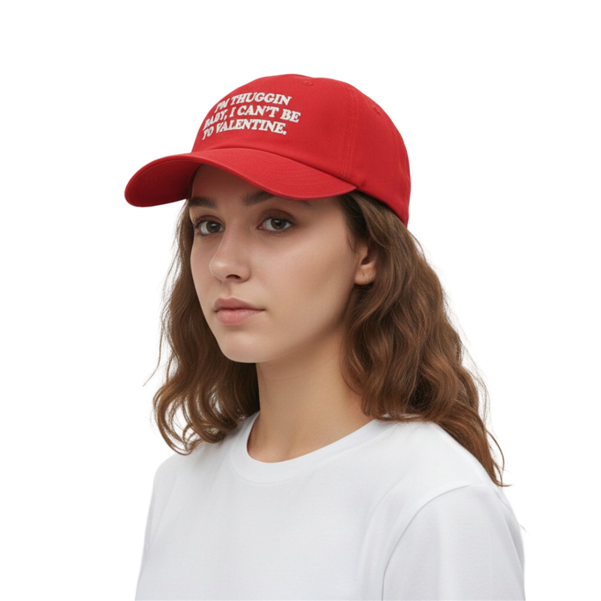 This cap is designed to dominate the visual landscape. The striking red colorway commands attention immediately, while the bold, white serif typography ensures the message is readable from across the room—or across the explore page “I’m Thuggin Baby I Can’t Be Your Valentine“. It is a wearable meme, a piece of satire, and a style staple all rolled into one. It fits seamlessly into the current resurgence of “dad hat” silhouettes, offering a relaxed, unbothered look that pairs perfectly with oversized hoodies, vintage tees, and urban streetwear.