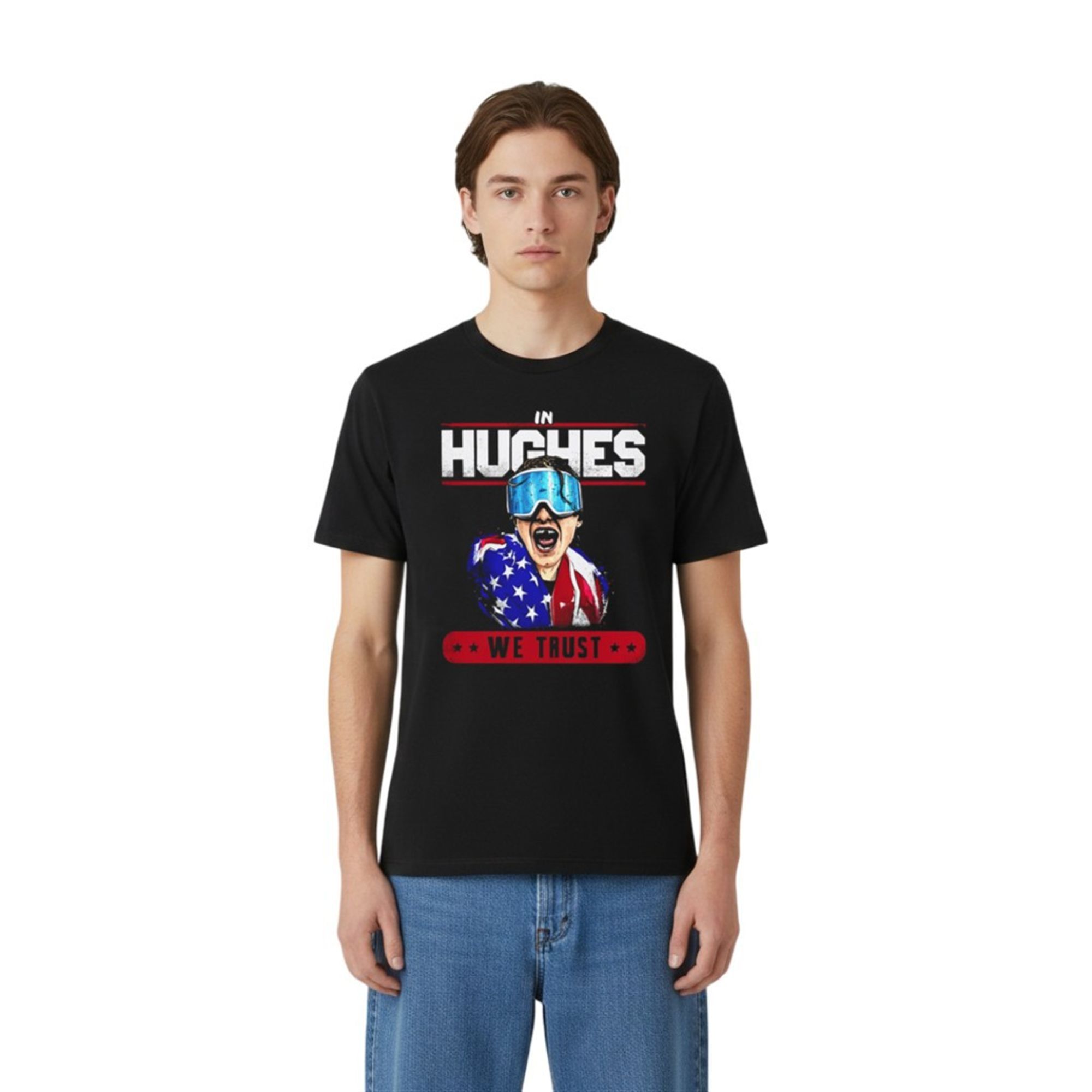 Framing this electrifying centerpiece is the bold, distressed typography reading “IN HUGHES” at the top, and “WE TRUST” anchored at the bottom, complete with patriotic star accents. The clever wordplay serves as a rallying cry for the fanbase, elevating the athlete from a simple player to an undisputed leader on the global sports stage. The stark contrast of the vibrant red, white, and blue imagery against the dark background ensures that the graphic pops, making an unforgettable visual statement wherever you go.