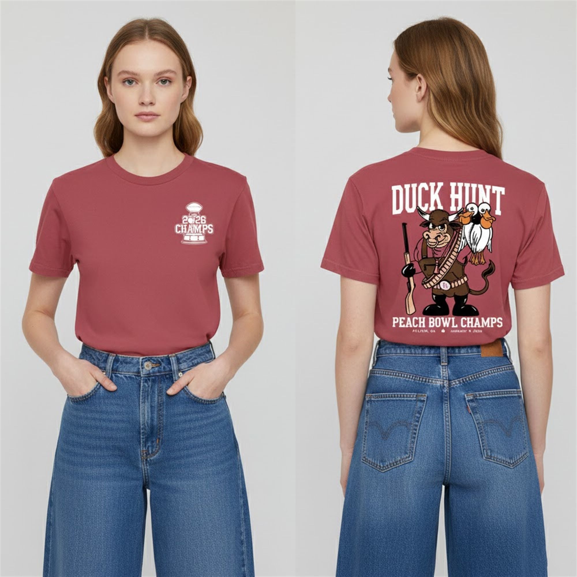 This product stands out by tapping into the viral “Duck Hunt” meme culture. The detailed back graphic features a rugged, bandolier-clad Hoosier Bison—a powerful representation of the team’s strength—standing tall with the “captured” Oregon mascot. The front design keeps it classic with the “2026 Champs” trophy logo, ensuring the shirt looks professional from the front and legendary from the back. It’s a creative twist that moves beyond standard text slogans into wearable art.
