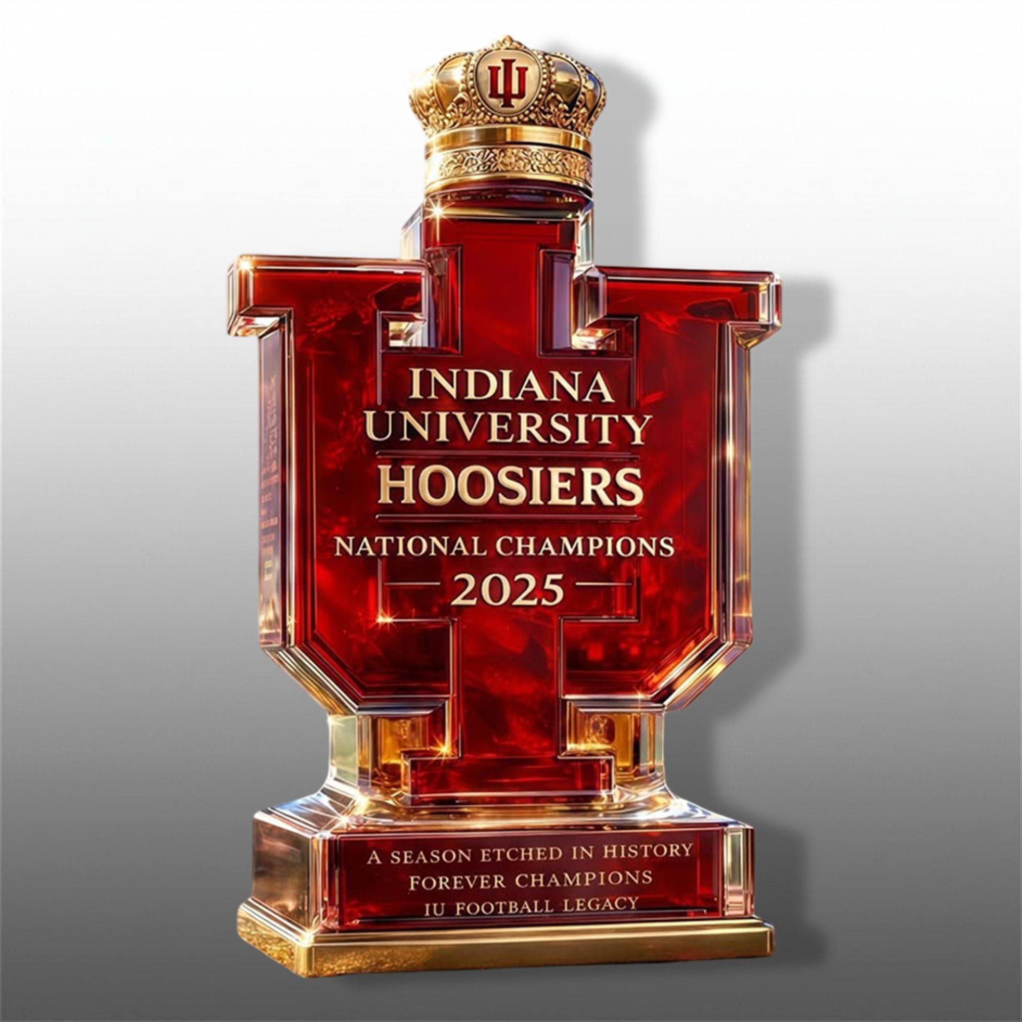 The 2025 season was more than just a winning streak; it was a cultural revolution in Bloomington. This Whiskey Bottle captures that energy with precision-etched detailing that lists the historic 16-0 record. The design features a bold, ruby-red glass body shaped like the iconic “IU” monogram, topped with a regal gold-finished crown. This isn’t just merchandise; it’s a tribute to the team that outscored CFP opponents by a staggering margin and brought the first-ever football national title to the state of Indiana.
