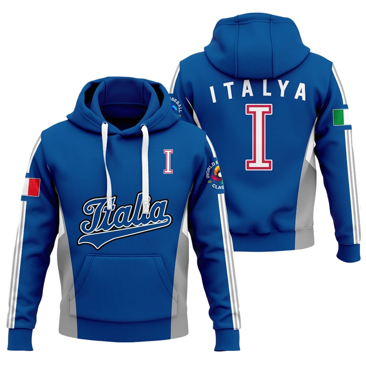 Every visual element of this hoodie carries deep cultural and sporting significance. The primary color is “Savoy Blue” (Azzurro Savoia), the traditional hue worn by all Italian national teams since 1910, symbolizing a unified national identity. The sweeping script font used for “Italia” pays homage to the golden era of baseball, representing the beautiful intersection of America’s pastime with European passion. Furthermore, the inclusion of the Italian flag on the sleeve serves as a proud banner of heritage, while the tournament patch solidifies the team’s rightful place on the grandest stage of international baseball.