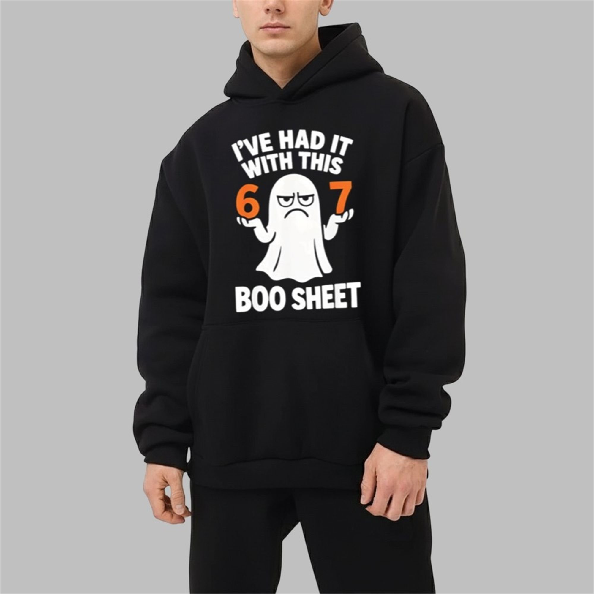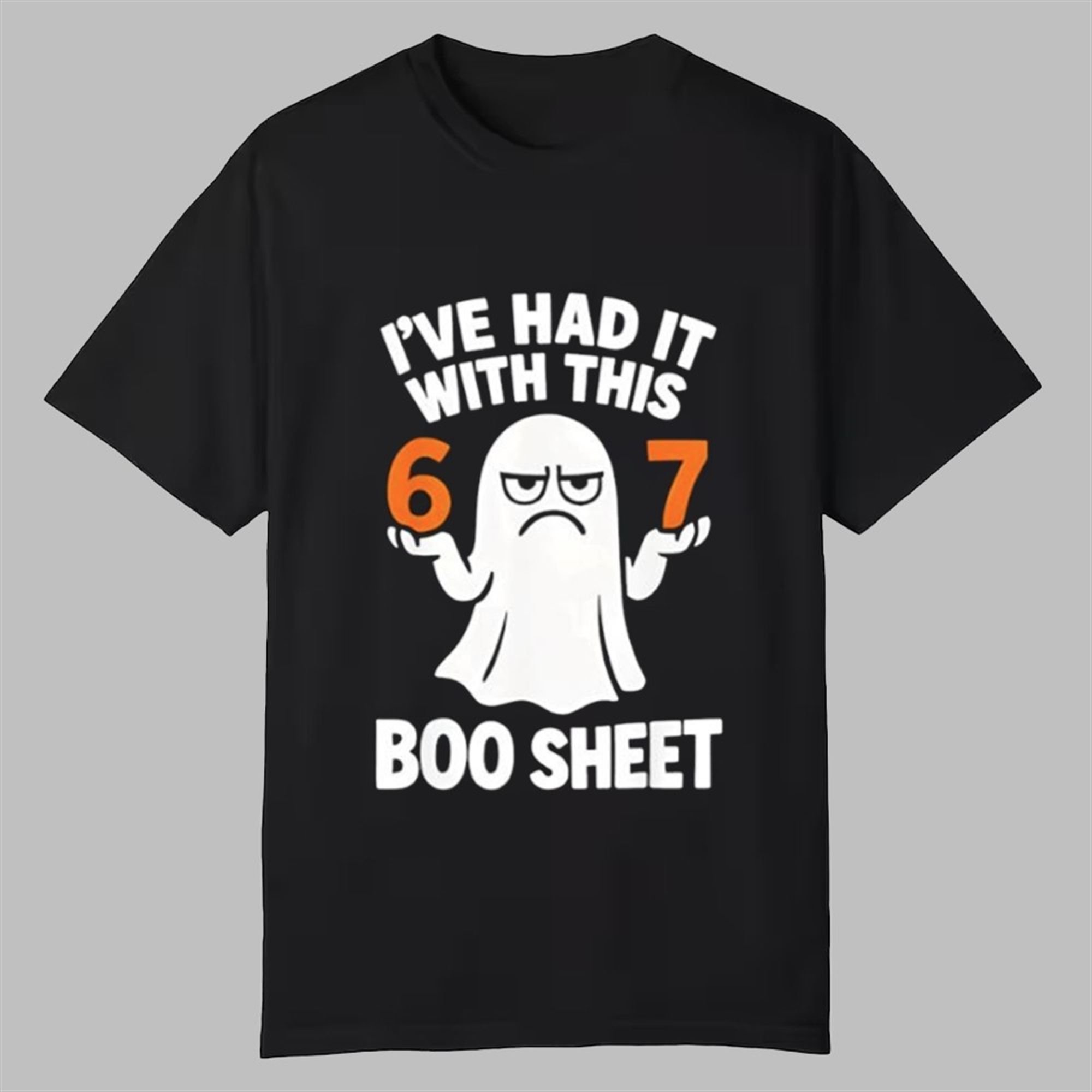 The design centers on an adorably annoyed ghost, hands thrown up in defeat, flanked by the numbers 6 and 7. The bold, easy-to-read text “I’VE HAD IT WITH THIS 6 7 BOO SHEET” makes the joke instantly clear, delivering a punchline that’s both clever and universally understood. This shirt is designed for the modern individual with a sharp sense of humor—the person who loves memes, appreciates a good pun, and isn’t afraid to showcase their sarcastic side. It acts as the perfect icebreaker at social gatherings and a badge of honor for surviving the daily grind, making it an essential addition to any wardrobe for Halloween 2025 and beyond.