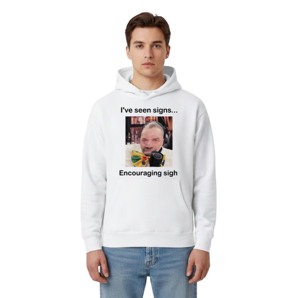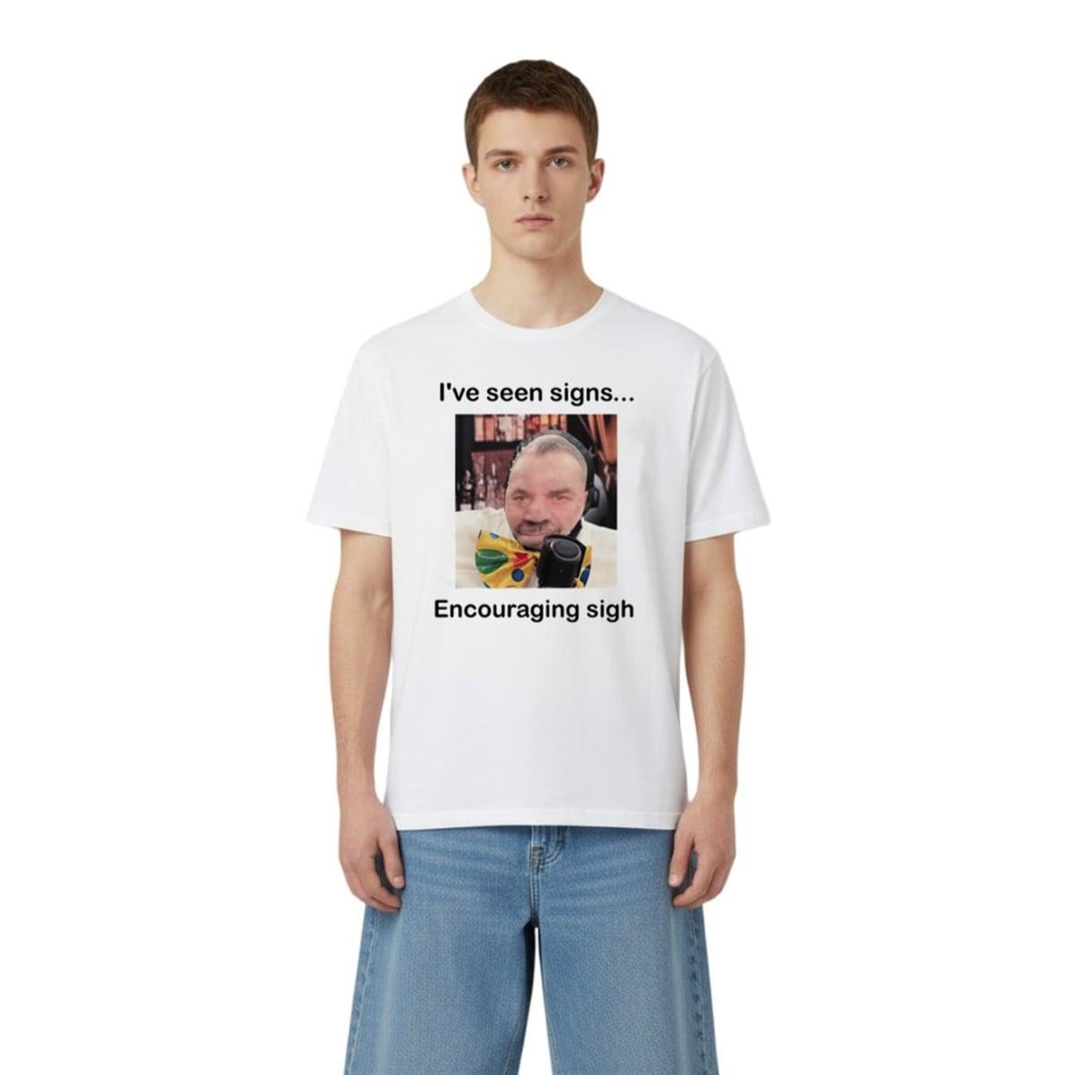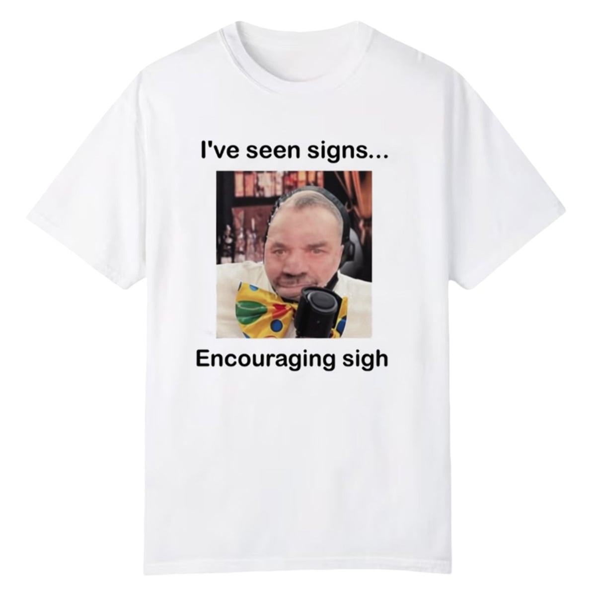 The design features a man staring forward with an expression of profound, weary understanding, equipped with headphones and a vibrant polka-dot clown bow tie. Above him, the text reads “I’ve seen signs...”, setting up the classic idiom “encouraging signs.” However, the punchline drops below with the phrase “Encouraging sigh.” It is a masterclass in subverted expectations, delivering a dose of self-aware, self-deprecating comedy that resonates instantly with anyone who operates in today’s fast-paced, often ridiculous world.