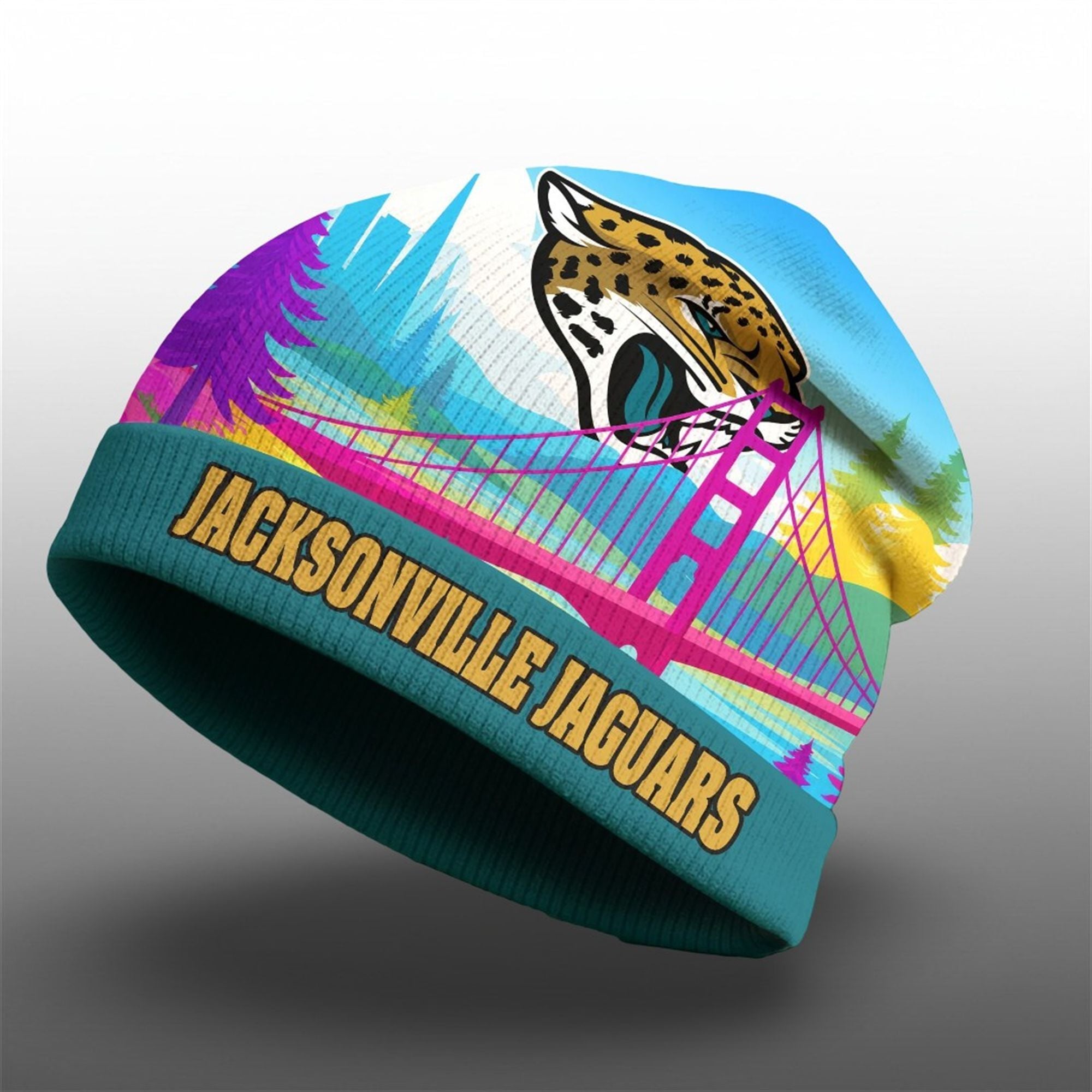 Visually, the hat breaks the mold of traditional sports gear. It features a stylized, artistic rendition of the famous Golden Gate Bridge rendered in striking magenta and purple hues, set against a backdrop of teal skies and stylized pines. Overlooking this scenic California landscape is the aggressive, roaring Jacksonville Jaguars head logo, symbolizing the team’s dominance arriving on the West Coast. The teal cuff anchors the design with the team name in bold, gold lettering, ensuring that despite the artistic flair, your allegiance is unmistakable.