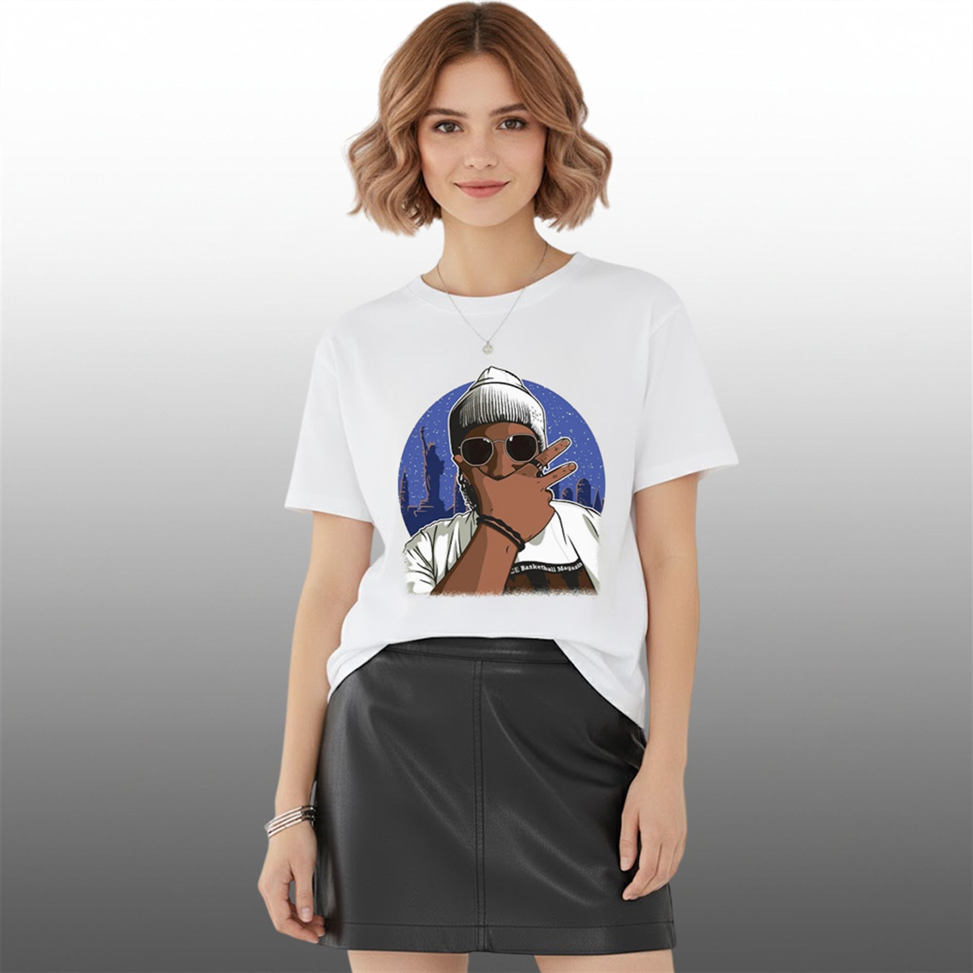 The design features a bold, illustrative graphic of Brunson donning a ribbed beanie and sunglasses, executing his mysterious and famous “hand-over-mouth” celebration. The backdrop is pure New York—a starry night featuring the silhouette of the Statue of Liberty and the city skyline, symbolizing that this is his city now.