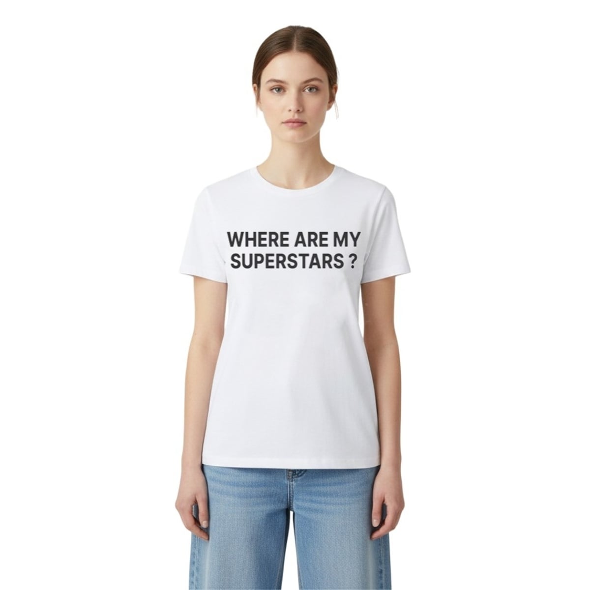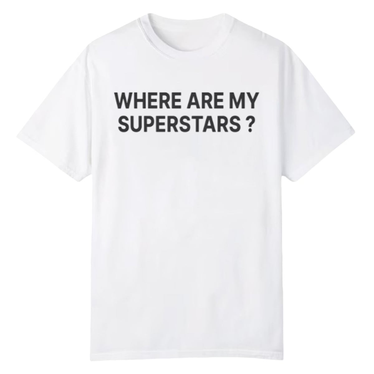 The shirt is a brilliantly minimalist fashion item that relies purely on the power of text and context to make its mark. Visually, it features stark, all-caps, sans-serif typography “Where Are My Superstars?” that demands immediate attention. It strips away complicated artwork to let the provocative question speak entirely for itself.
